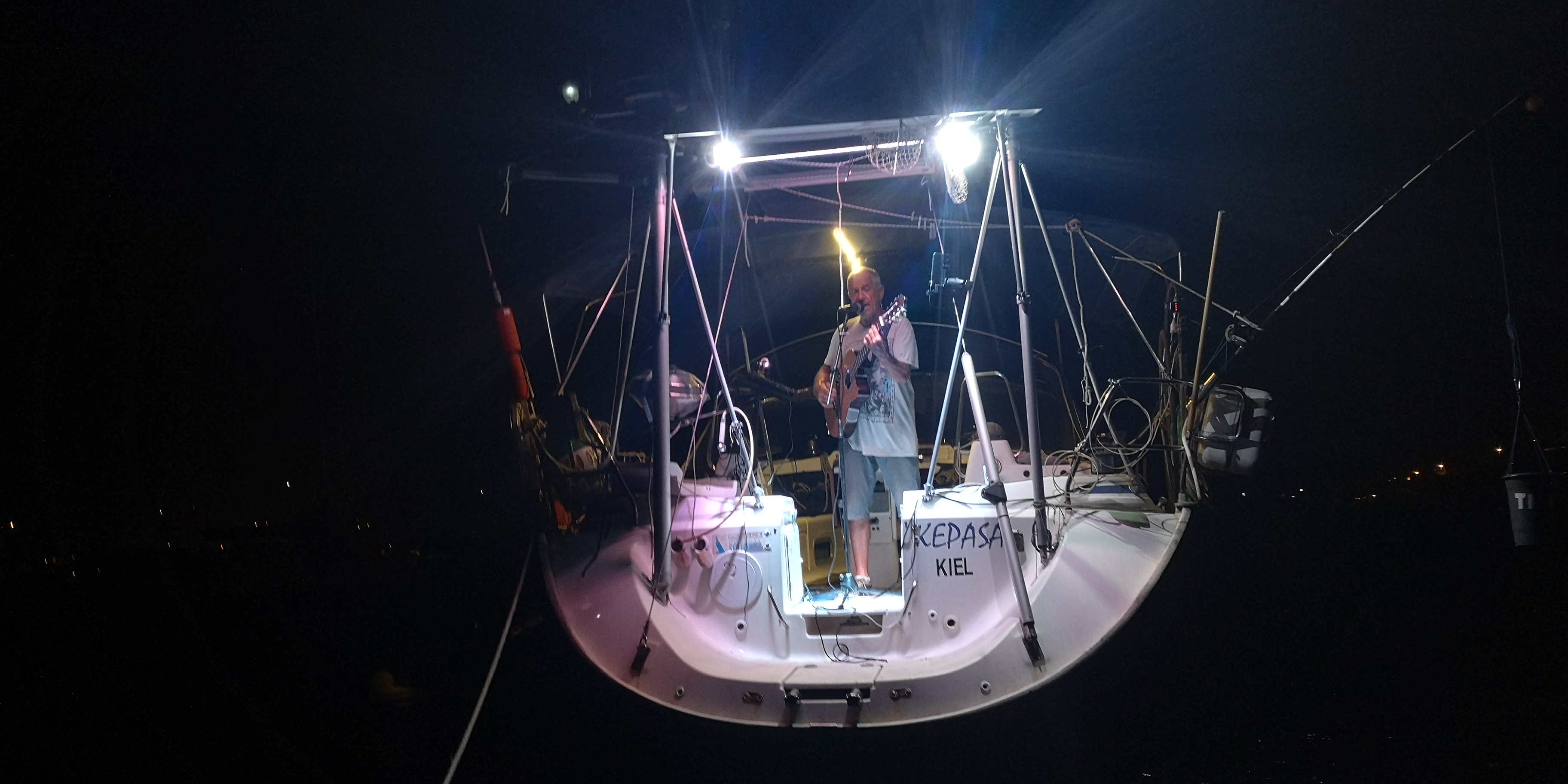Am Samstag Abend gibt Johann aus Deutschland am Heck seines Monohulls ein kleines Konzert. Er ist Profi-Musiker, spielt und singt hervorragend! Während die capitania mit steifem Rücken an Bord bleiben will, fahren die BARADAL und ich mit dem Dinghy hin, binden uns mit anderen – jeder natürlich in quarantänekonformem Abstand – an eine der ausgebrachten Heckleinen und geniessen.