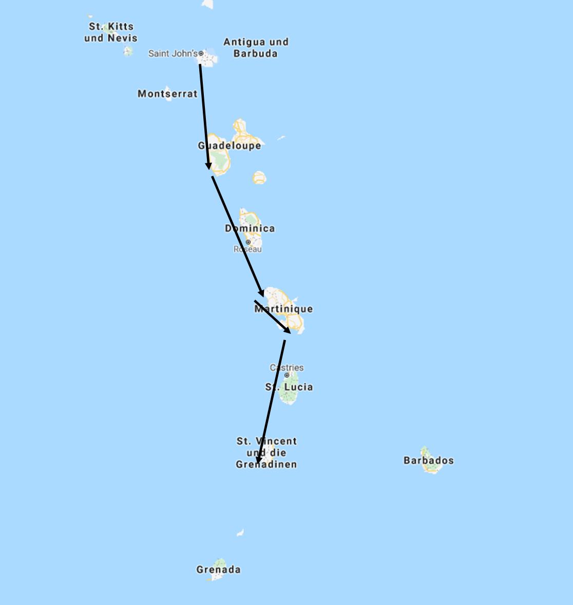 Nach dem Ausklarieren in Antigua – am Dienstag den 23.6. – gehen wir von dort 60nm an die Südspitze von Guadeloupe.