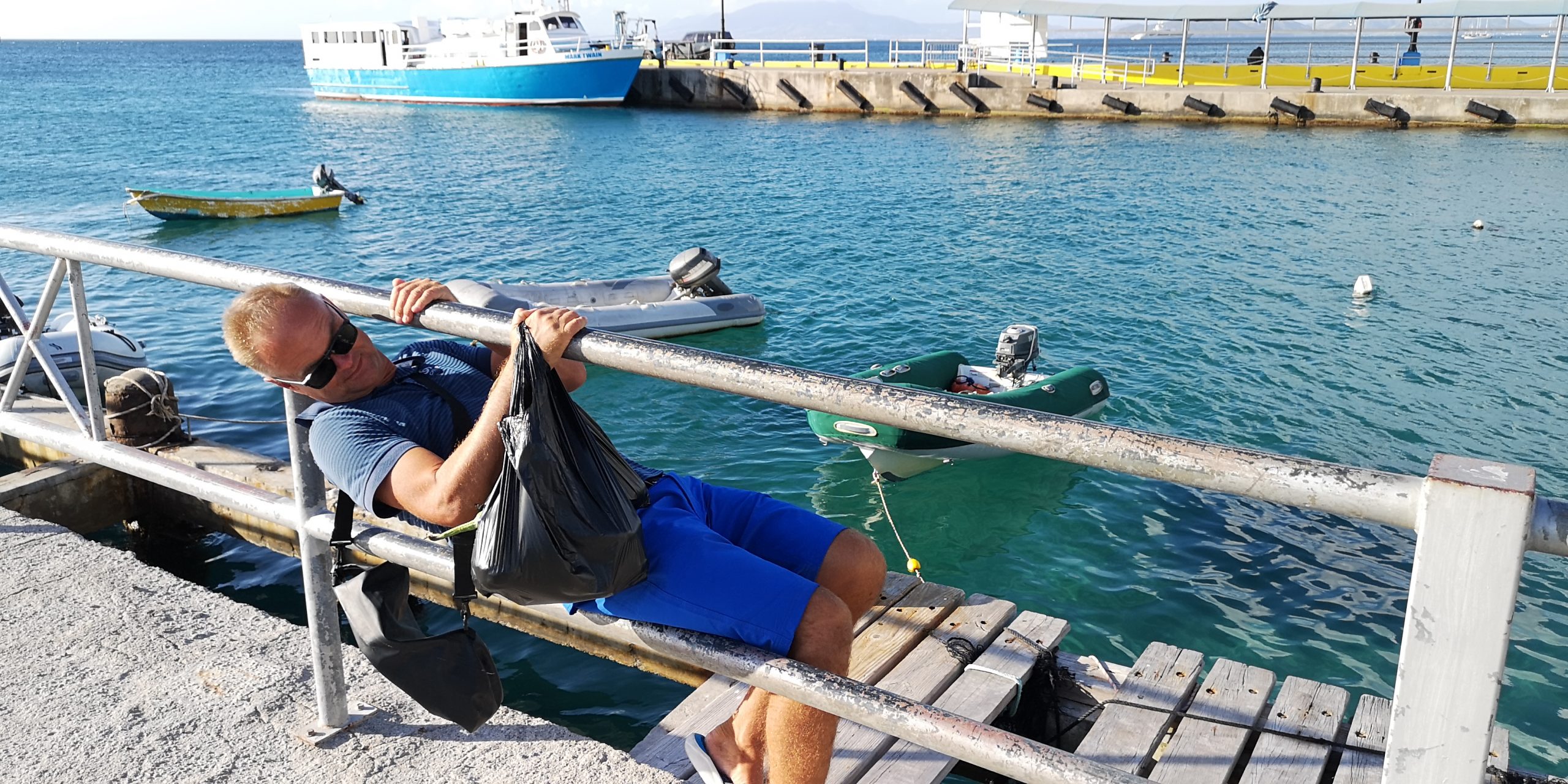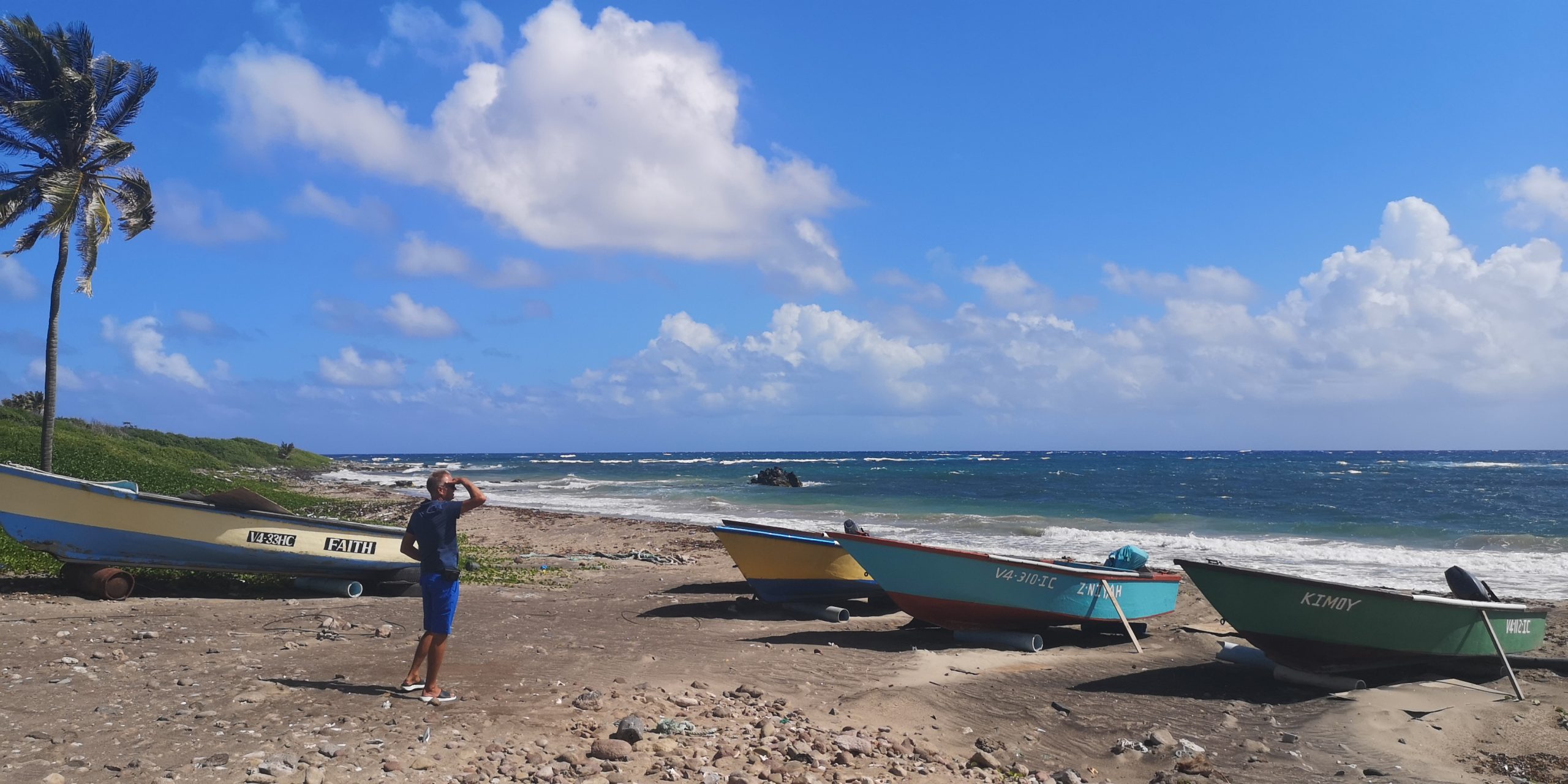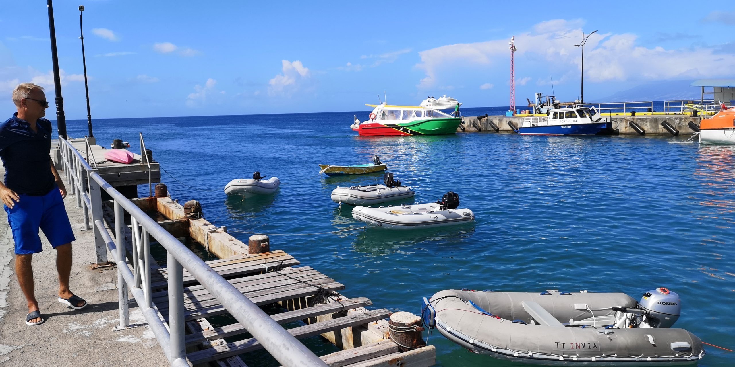 Wir liegen bei Nevis vor dessen Hauptort Charlestown. Entgegen zahlreichen anderen Berichten war das Einklarieren freundlich und zügig. Schwierig ist das Parken des Dinghys vor Charlestown. Der Dinghysteg ist zerstört. Am Pier schwellt es, so dass man entweder eine der Moorings aufpicken muss, um das Heck zu sichern oder einen Heckanker. Solange es weniger Schwell hat, kann man das Dinghy auch unter das Pier legen. Kraxelig ist das Aussteigen in beiden Fällen.