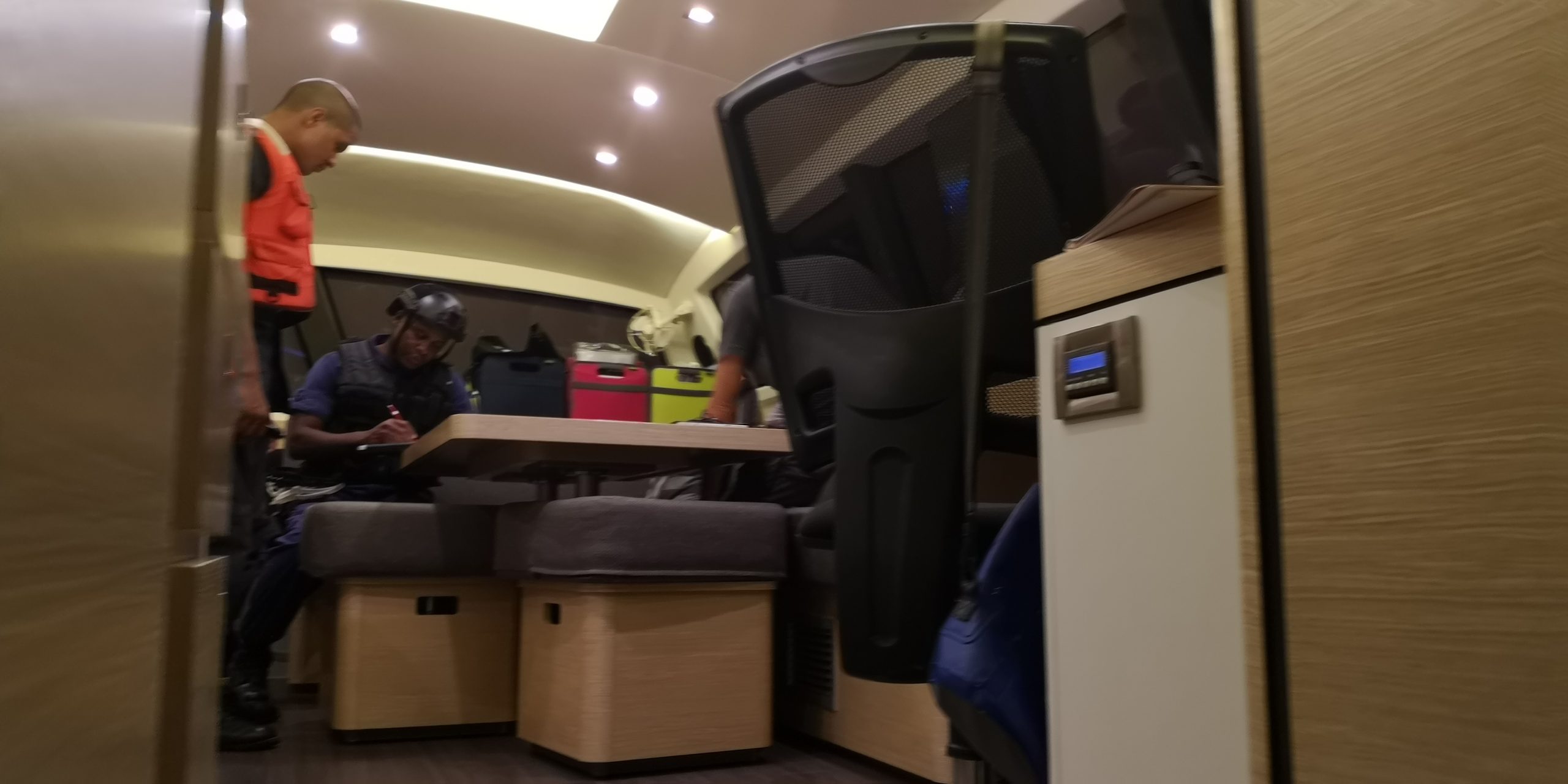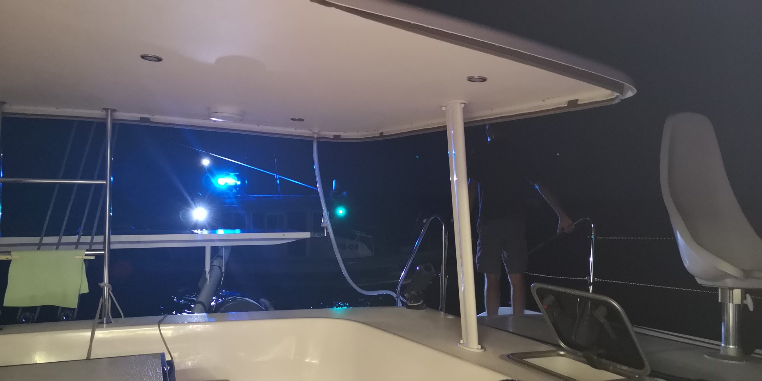Am Abend bekommen wir Besuch. Die Coastguard fährt von hinten heran und bittet darum, an der Invia längsseits gehen zu dürfen. Vier Leute kommen an Bord. Einer davon mit schutzsicherer Weste und Helm, mit Waffe und Silikonhandschellen. Wir müssen unsere Papiere vorlegen, die Rettungswesten vorzeigen, die Epirb und die Notsignale. Die Ablaufdaten werden kontrolliert. Alles in Ordnung bei uns.