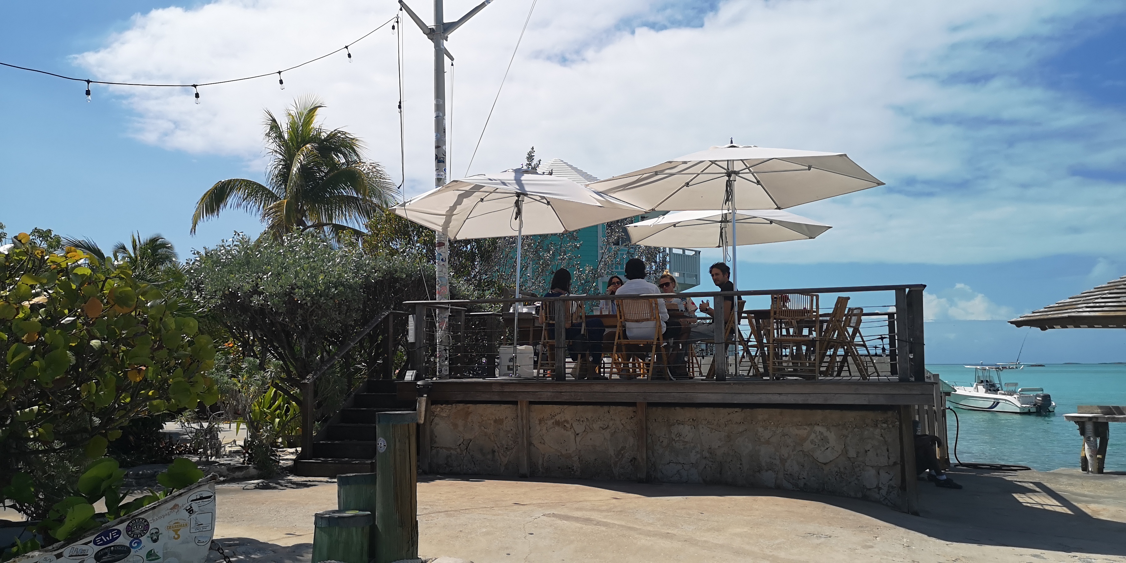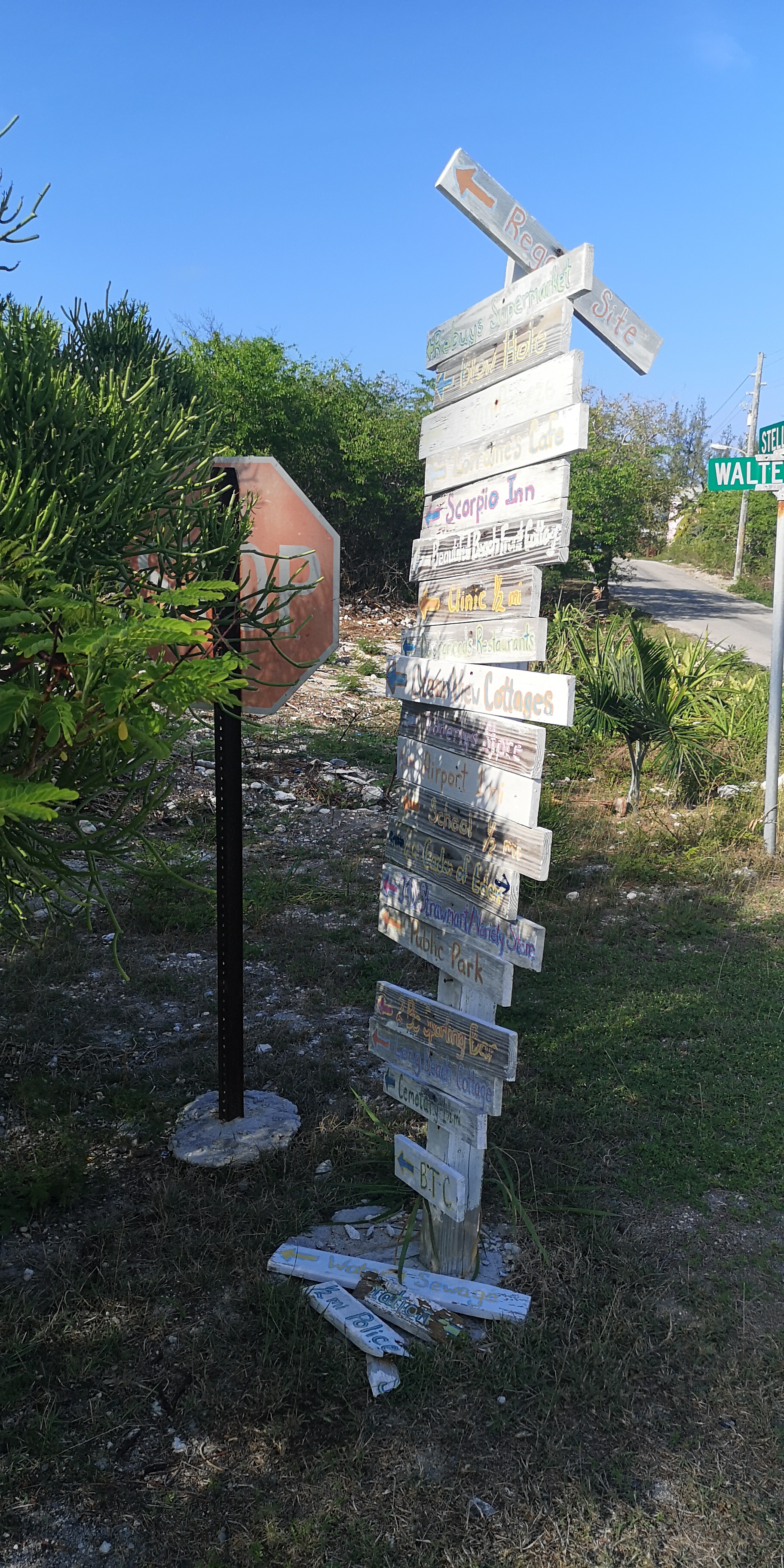Der Schilderwald verspricht mehr, als aktuell in Black Point noch da ist. Wir suchen vergeblich nach dem kleinen Laden, der auch Hardware haben soll. Das genähte Canvascover des Dinghy braucht eine Reparatur und wir dafür Textilkleber. Insgesamt macht Black Point bei unserem Besuch den Eindruck, als warte man in Covidzeiten auf mehr Cruiser, die das Geschäft wieder ankurbeln. Im schön gelegenen Exumas Point Restaurant können wir nur fast food bestellen. Die anderen Gerichte hätten vorbestellt werden müssen.