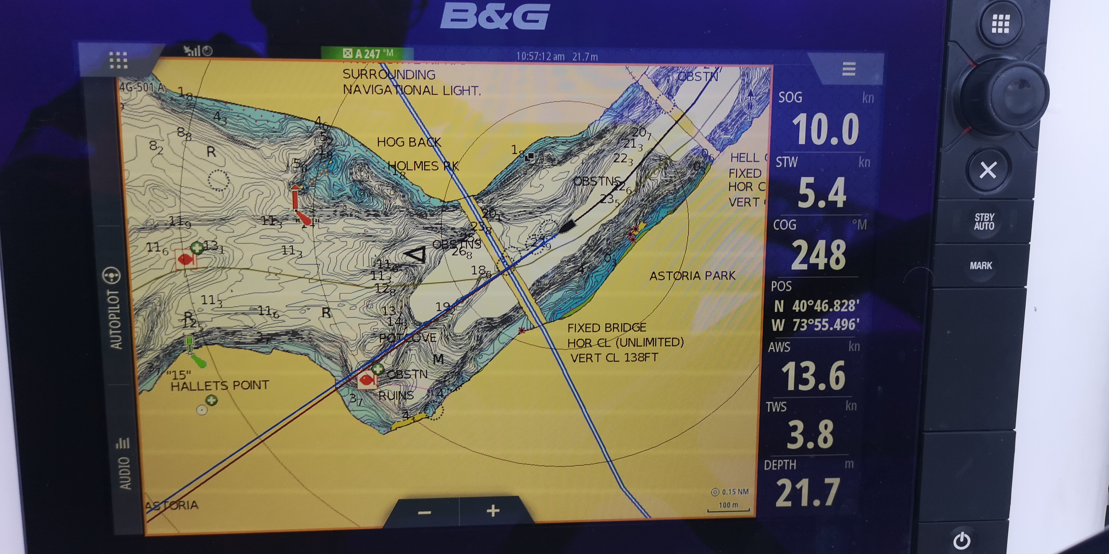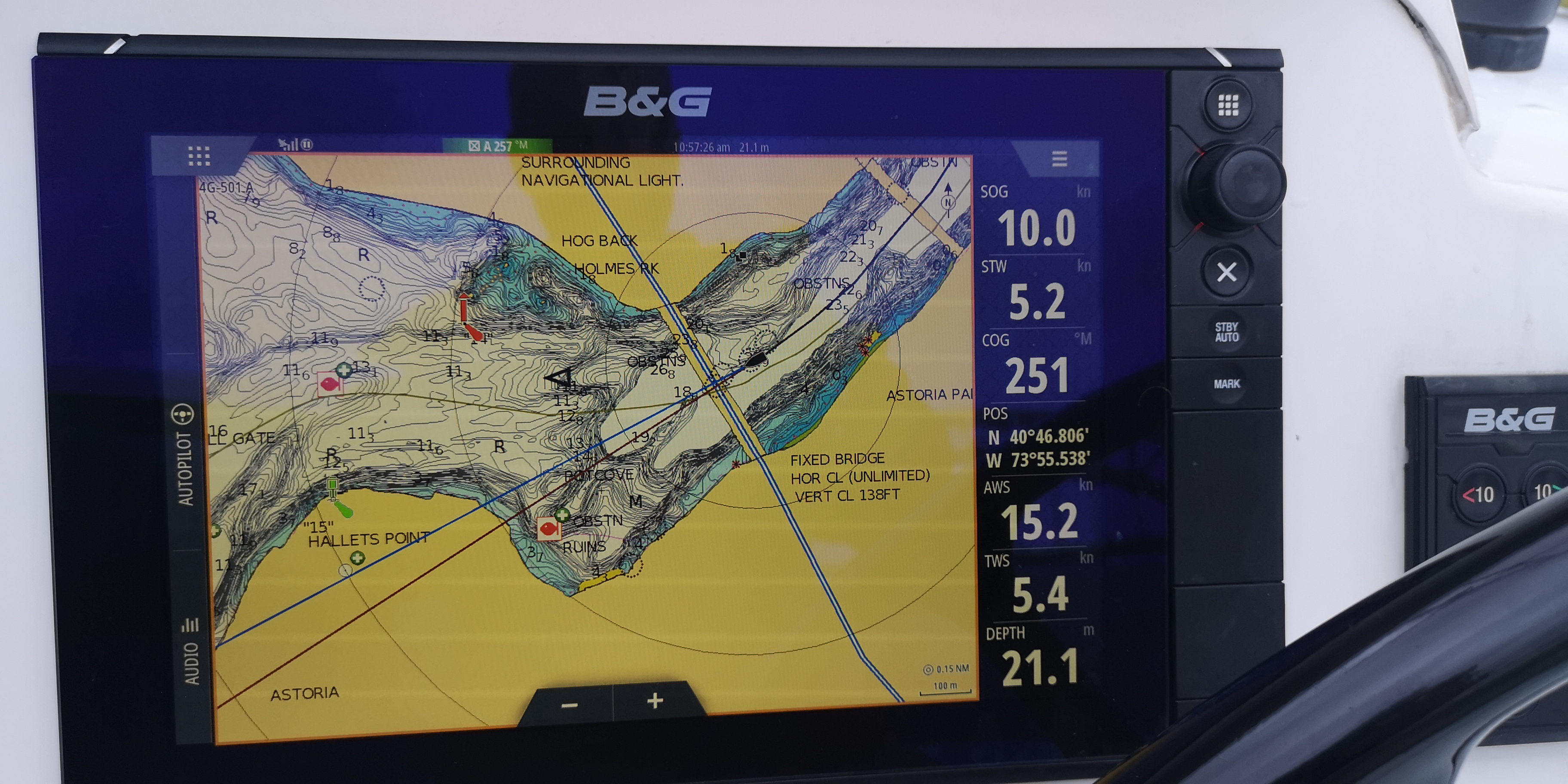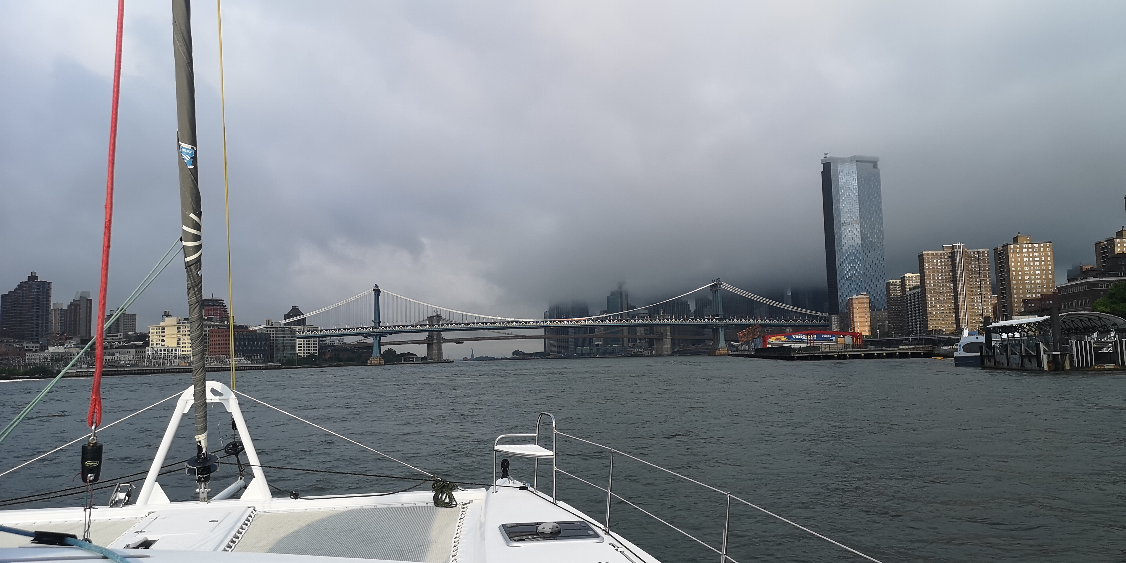 Wir lösen Sonntags um 05:00 morgens die Boje und machen uns auf. Erstmal durch den East River, an New York & Manhattan vorbei, bis Sandy Hook. Dort warten wir einige Stunden, bis am späten Nachmittag der Wind von Süd auf West drehen soll. Das frühe Losgehen ist erforderlich, weil im East River sehr starker Gezeitenstrom von bis zu 5kn herrscht. Und wir nicht gegen den Strom ankämpfen, sondern es so timen wollen, dass der Strom uns schiebt.