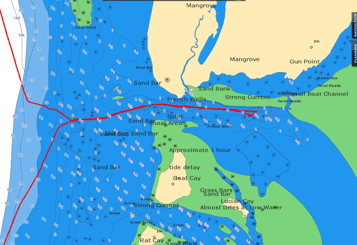 Alles in allem haben wir beide kein gutes Gefühl, hier über Nacht zu bleiben. Wir drehen daher um und verlassen die French Wells wieder. Anders als beim Einlaufen muss ich jetzt zwingend mind. 4kn Fahrt über Grund machen, damit ich mit 2kn Fahrt durchs Wasser noch ausreichend Druck auf die Ruder habe. Denn der Strom schiebt mich von hinten – und dazu auch noch der Wind. Recht kräftig sodass ich streckenweise beide Motoren rückwärts laufen lasse um etwas zu bremsen. Denn ich will nicht mit Karacho einen Felsen, einen Korallenkopf oder auch nur eine Sandbank rammen. Geht aber alles gut, an der seichtesten Stelle hatte ich mal 1m Wasser unterm Kiel, ansonsten immer mehr.