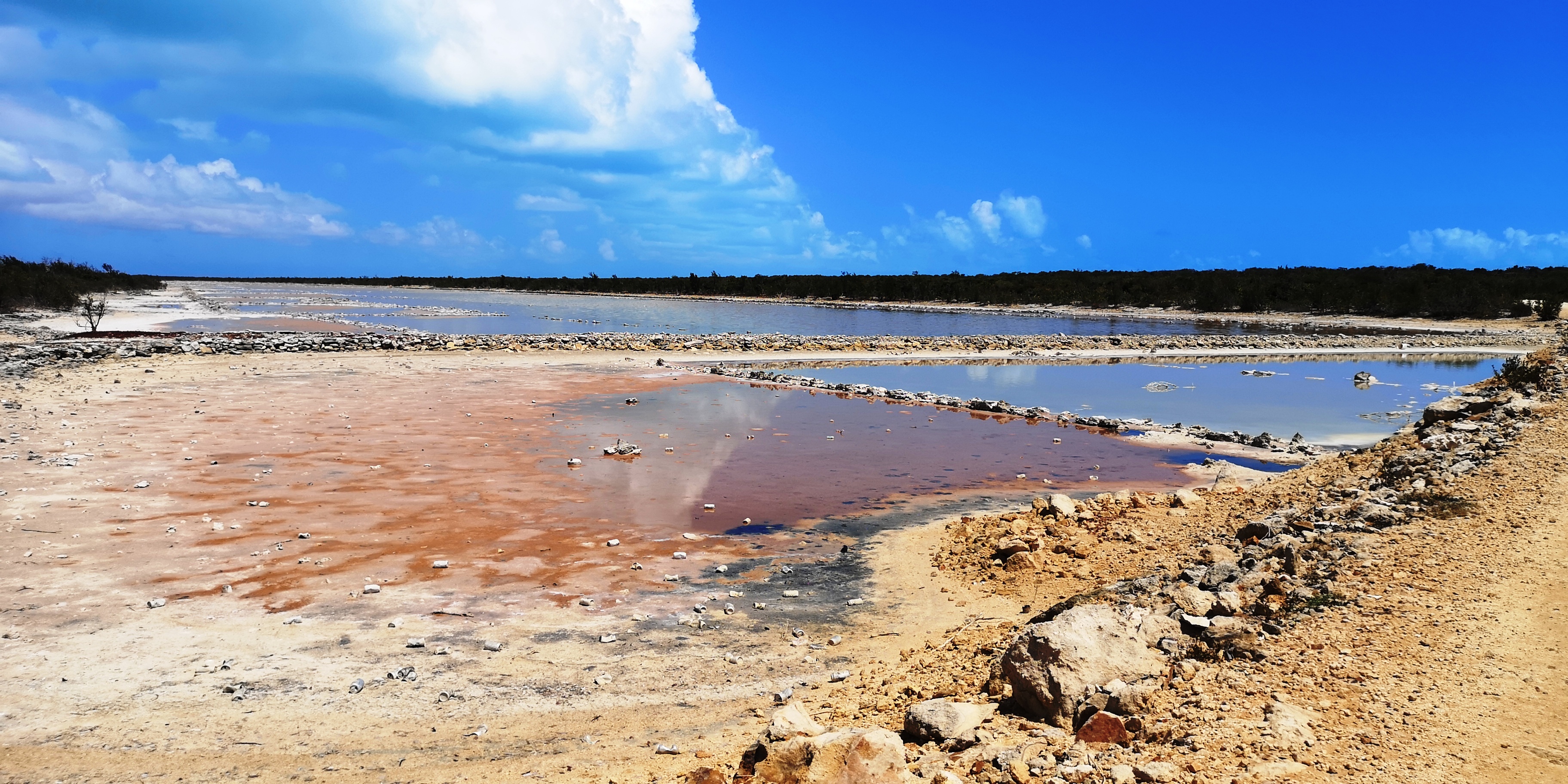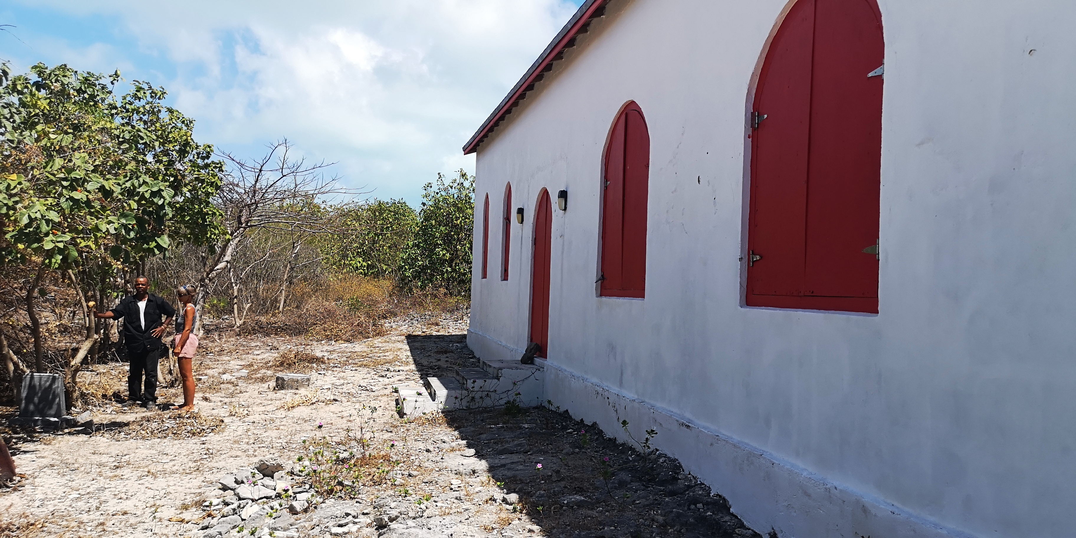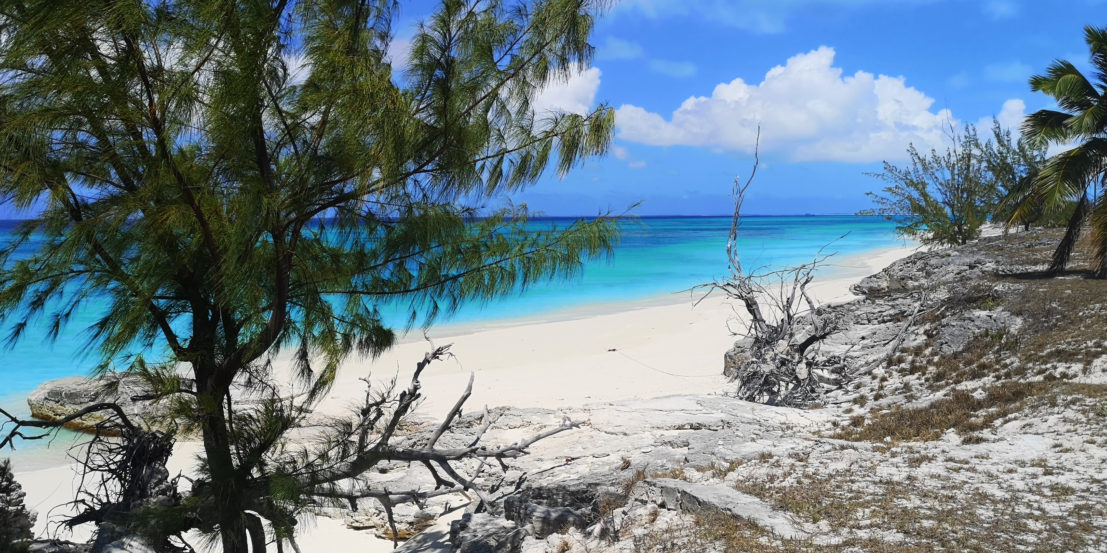 Wir gehen weiter nach Long Cay, aber nicht mehr ganz in den Süden wo wir bei der Fahrt zum Landrail Point Halt gemacht hatten. Sondern legen uns etwa 1,4 nm nördlich von Albert Town. Albert Town ist keine Stadt mehr, eigentlich auch keine Siedlung. Früher einmal besiedelten um 4000 Menschen die Insel. Die goldenen Zeiten sind aber längst vorbei. Heute sind viele Häuser – zuletzt nach dem Hurricane 2015 – verlassen und aufgegeben. Vor der zerstörten Kirche – der ältesten anglikanischen Kirche in den Bahamas – treffen wir auf De-Angelo, der aus das Haus gegenüber kommt. Ganze 6 Personen würden noch in Albert Town leben, meinte er. Er selbst wohnt eigentlich auf Crooked Island, besucht aber seinen Freund auf Long Cay. 14 weitere Personen sollen irgendwo sonst wohnen auf der Insel, meint De Angelo. Wir finden trotz langen Fußmarsches in Staub und sengender Sonne bis zur anderen Inselseite nur Reste früherer Siedlungen, und davon viele. Außerdem alte Brunnen und weite Gebiete, in denen früher Salz gewonnen wurde.