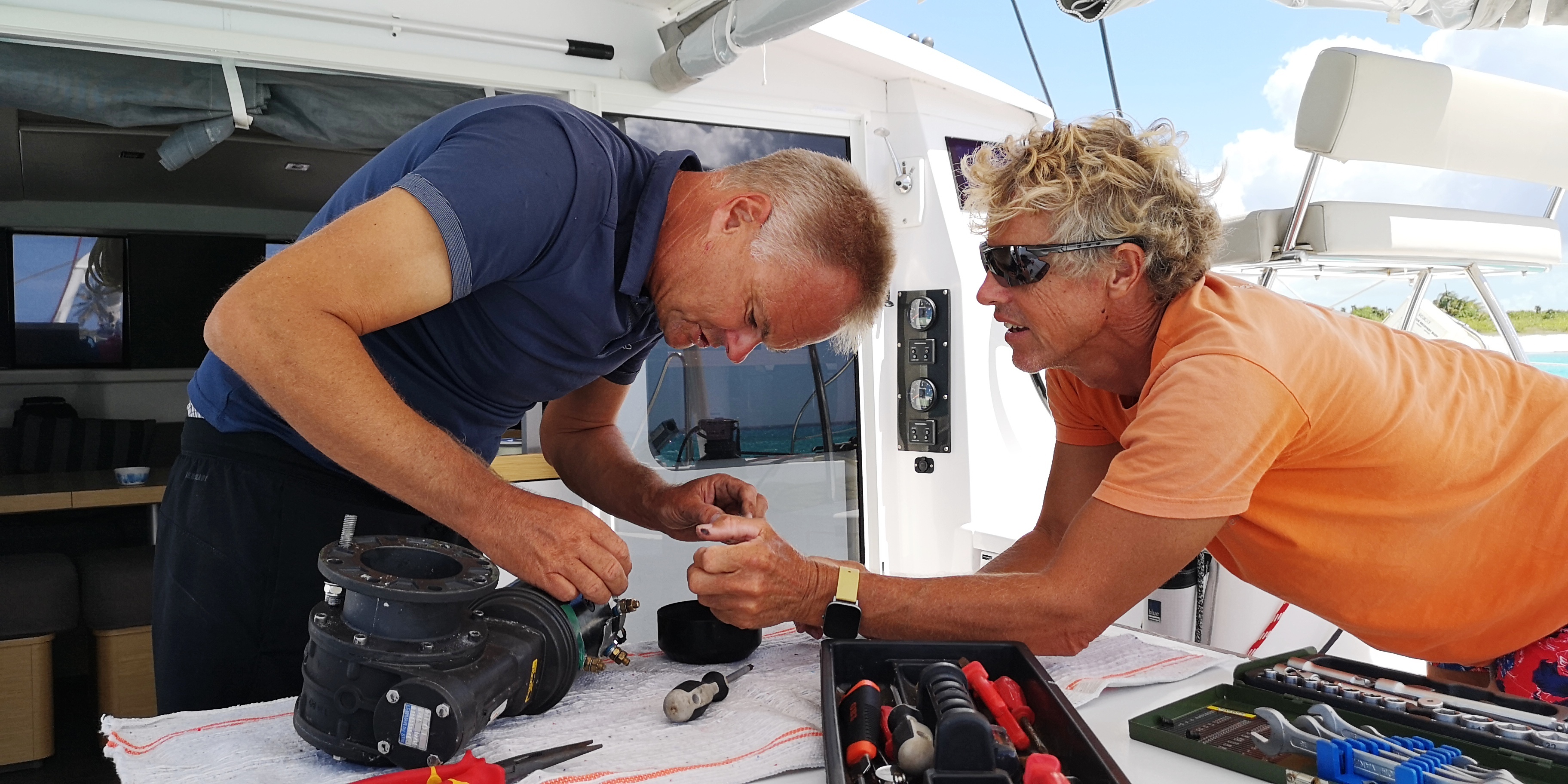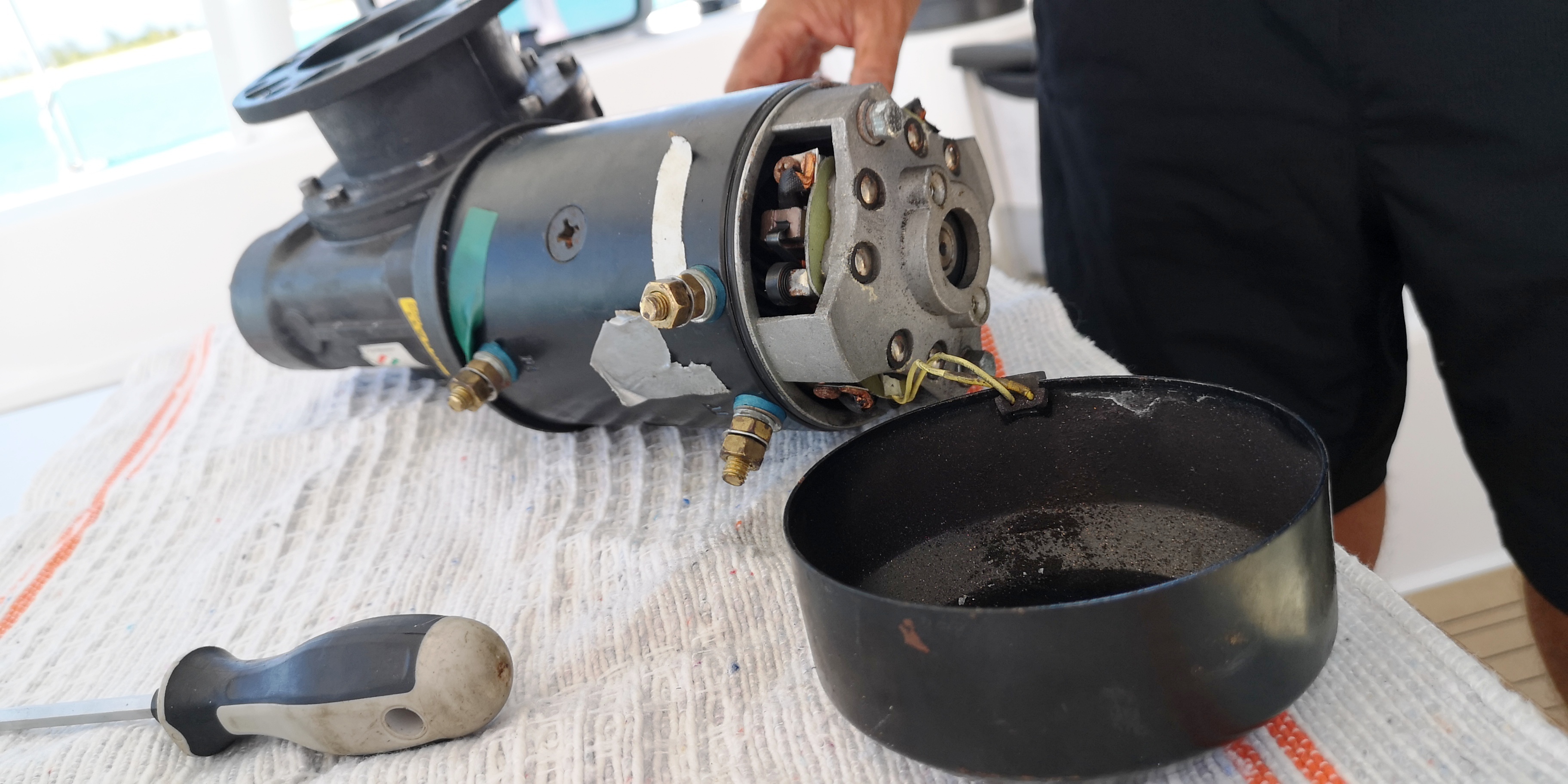 Unsere Ankerwinde – das ist das Teil, welches die schwere Kette und den Anker fallen lässt und vor allem wieder hochholt – verhält sich seltsam. Scheint ein Problem am Elektromotor zu sein. Gar nicht gut, denn von Hand lässt sich unsere Ankerwinde nicht bedienen. Ich müsste bei einem Ausfall zum Ankern die Kette von Hand geben – das geht noch einfach. Später aber, wenn wir wieder Anker auf gehen, müsste ich mühsam von Hand hochholen. Das letzte Stück mit dem schweren Anker könnte ich unter Zuhilfenahme der Winde am Mast (mit der normalerweise das Fall für die Vorsegel bedient wird) Meter für Meter hochholen. In der Facebook-Gruppe der Outremer Eigentümer kommt der Hinweis, dass vermutlich die Bürsten bzw. Kohlen des Motors abgeschliffen sind und der Abrieb für Probleme bei der Stromübertragung sorgt. Klingt logisch – aber um den Motor zerlegen zu können, muss ich erstmal das Ding mitsamt dem Getriebe ausbauen. Genau das sind die Momente, in denen man mich besser nicht fragen sollte ob ich wieder eine Outremer kaufen würde! Ich setze mich fluchend ans Werk, denn es ist mal wieder recht verwinkelt verbaut. Wenn auch nicht ganz so dämlich wie die beiden Starterbatterien für die Diesel-Motoren.