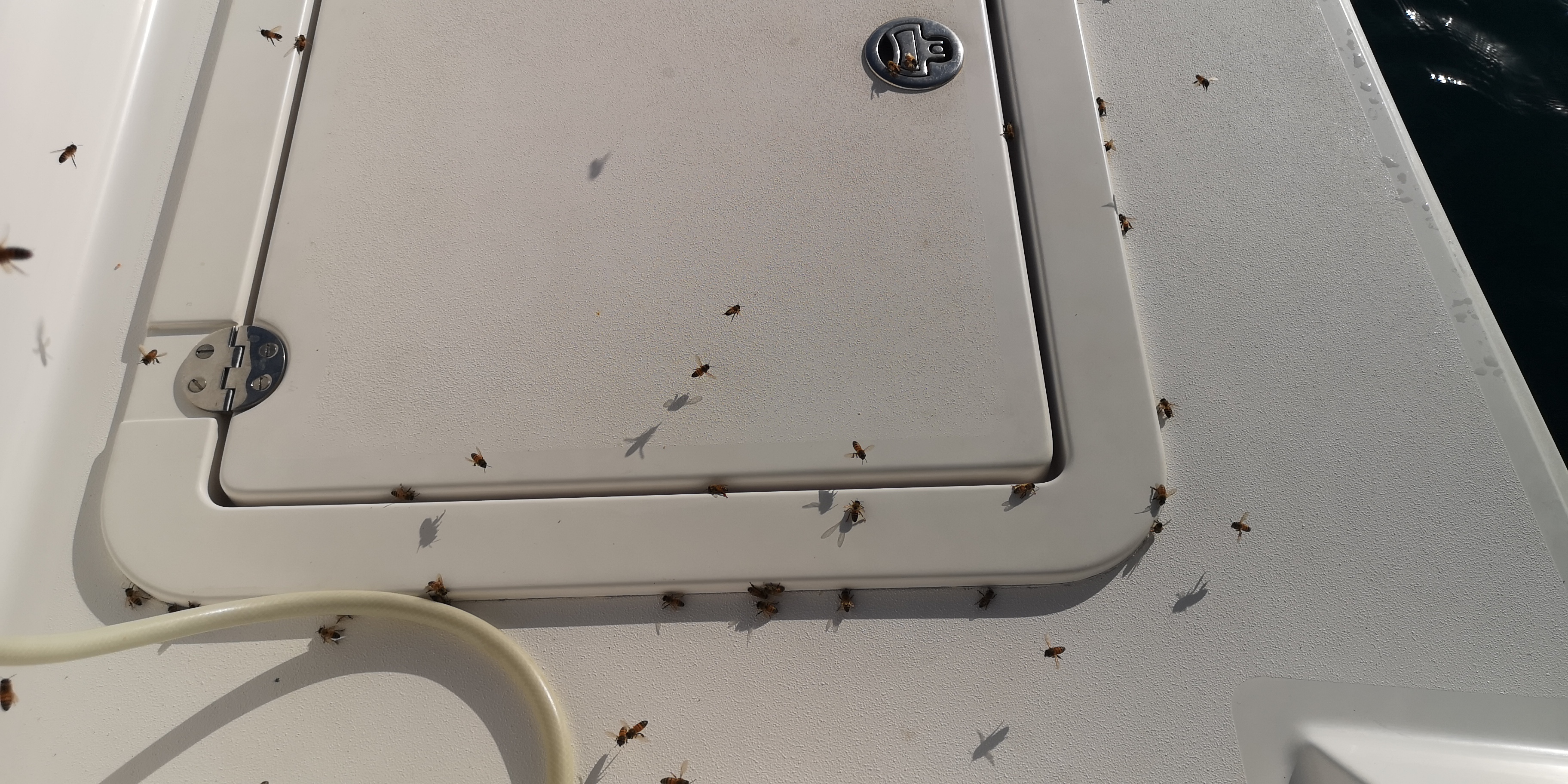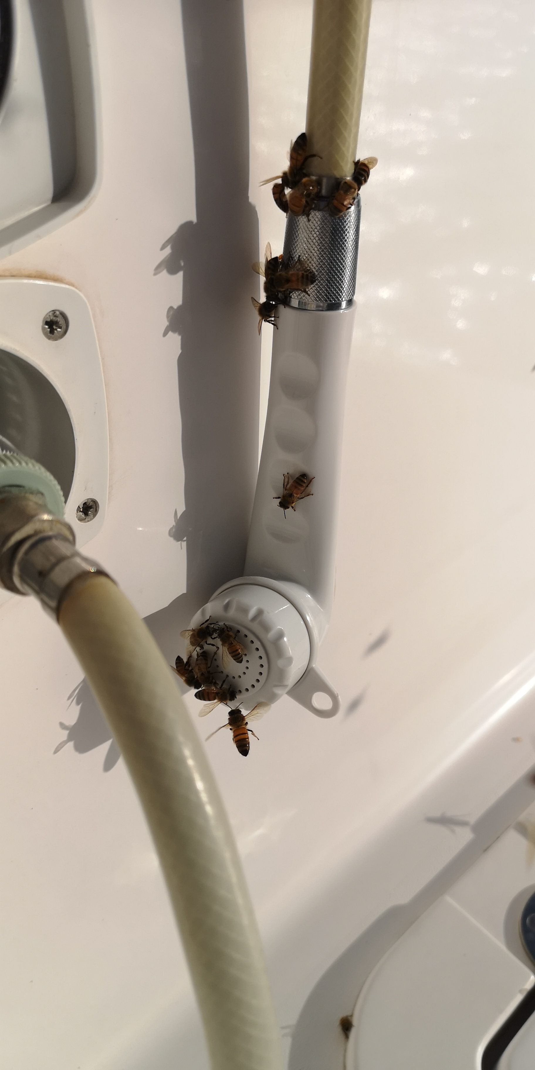 Die Bienen leiden offenbar an Süsswassermangel, obwohl es zwischendrin immer mal kurz regnete. Jedenfalls überfallen sie die INVIA – auf der Suche nach Wasser. Eine gute Fundstelle dafür ist unsere Süßwasserdusche am Heck, mit der wir uns nach dem Schwimmen oder Schnorcheln das Salz abduschen: