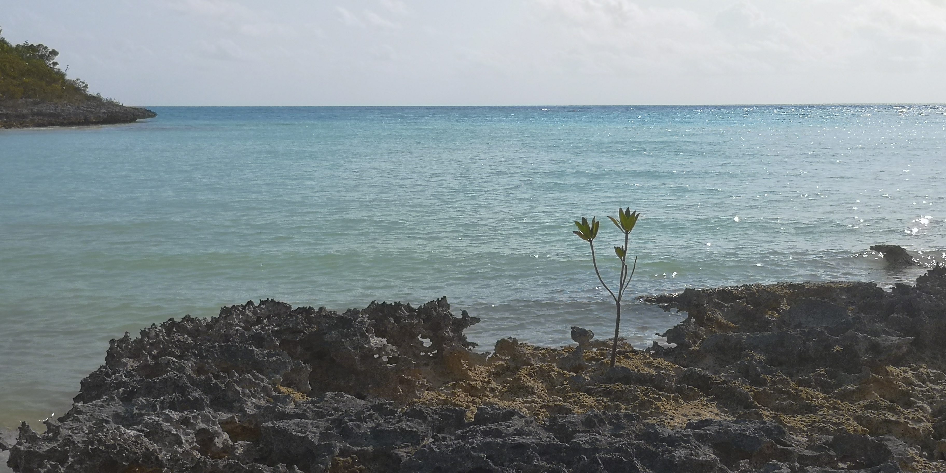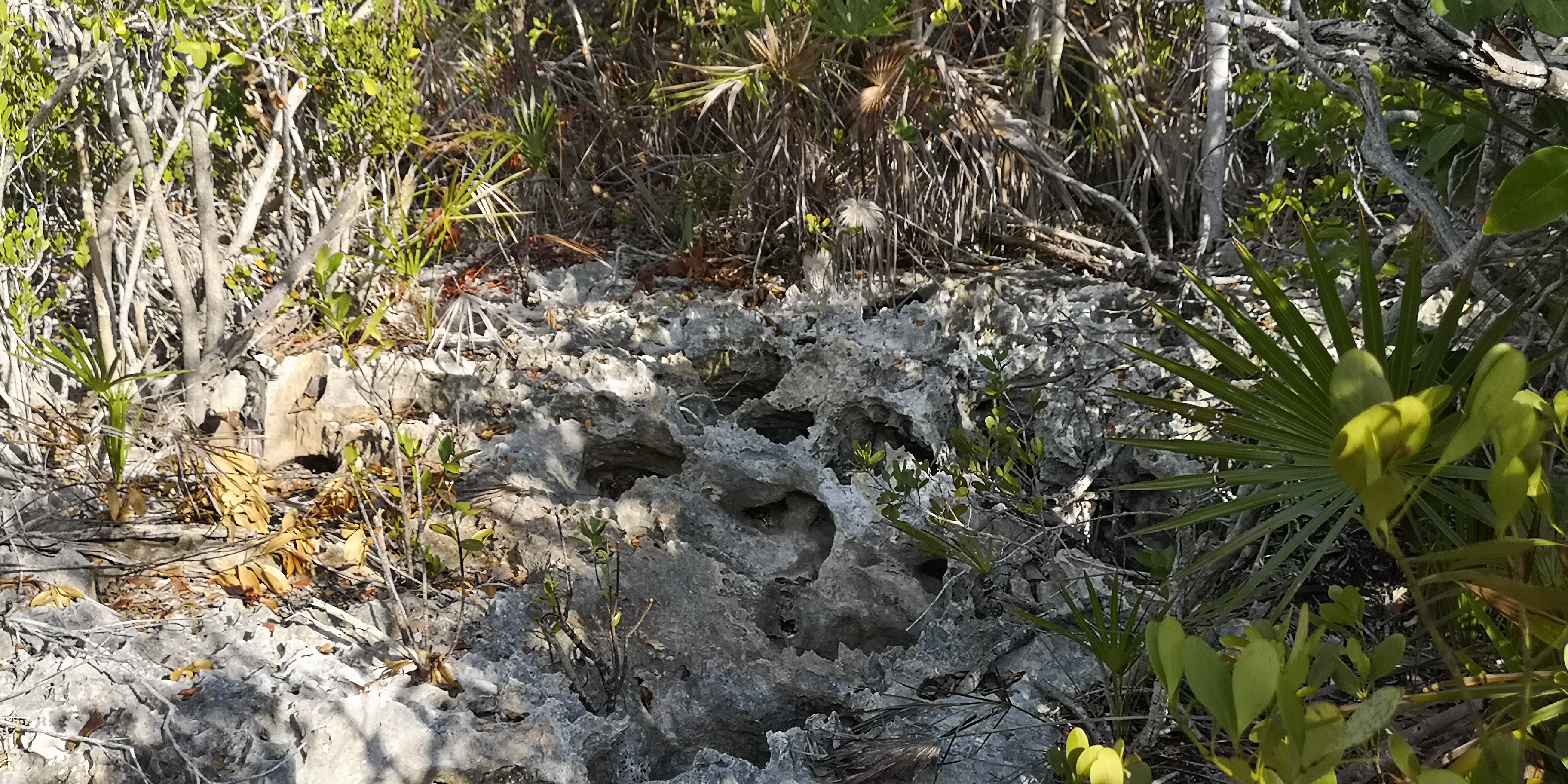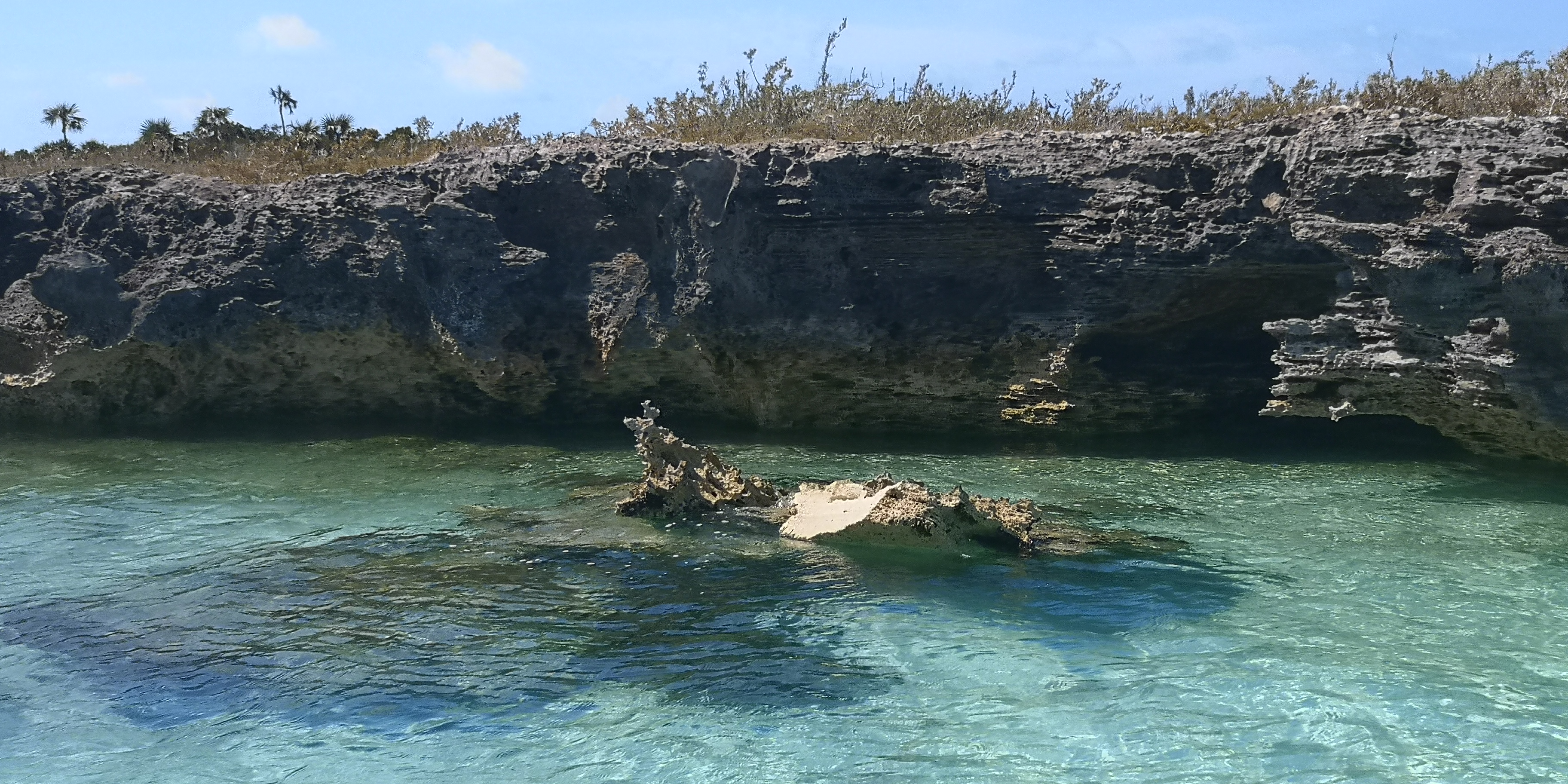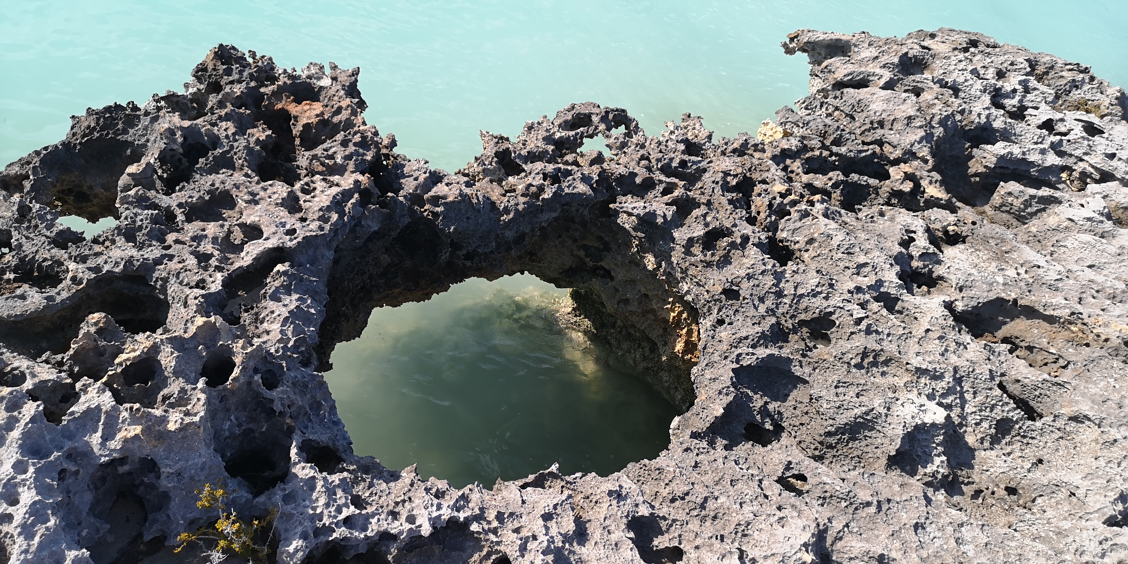 Am Ende des Strands eine Salzwasser-„Quelle“: Meerwasser, das bei Flut in die zahlreichen Karsthöhlen und -kanäle dringt und dann bei Ebbe wie bei einer Quelle wieder herausplätschert: