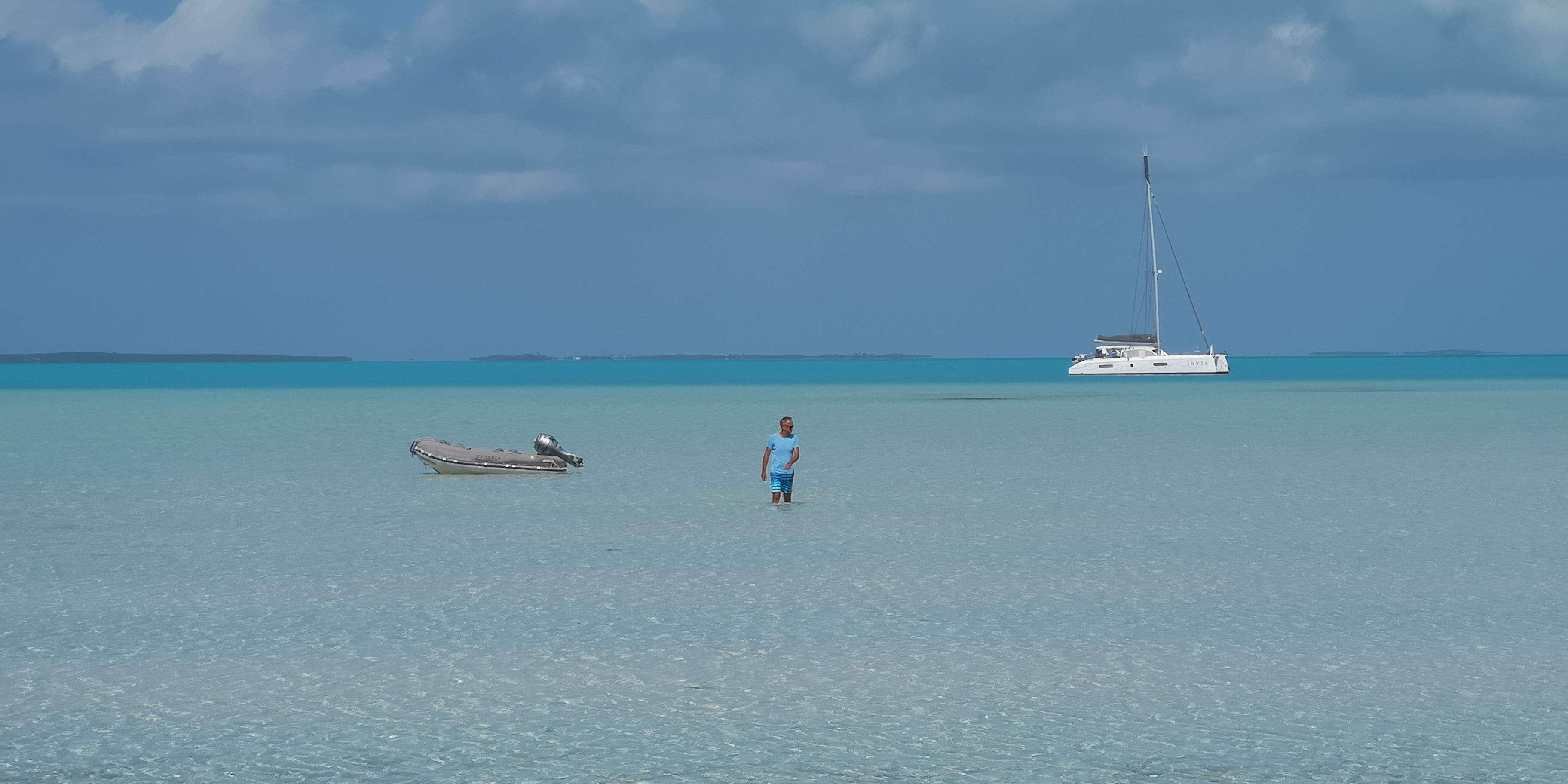 Danke an die Louis & Deb von der 360, die wir aus unserer Lockdown-Zeit auf den US Virgins kennen. Sie haben diesen herrlichen, noch nirgends verzeichneten Ankerplatz an der Nordseite von New Cay ausgekundschaftet.Um an den Strand zu kommen, müssen wir auf halber Strecke das Dinghy im Wasser parken und den Rest über Sand laufen. Denn es ist selbst für unser Dinghy zu flachGanz klein in der Mitte stehe ich mit dem parkierten Dinghy und mache mich auf den Fussmarsch durchs Wasser. Im Hintergrund: INVIABlick vom parkierten Dinghy auf den Strand