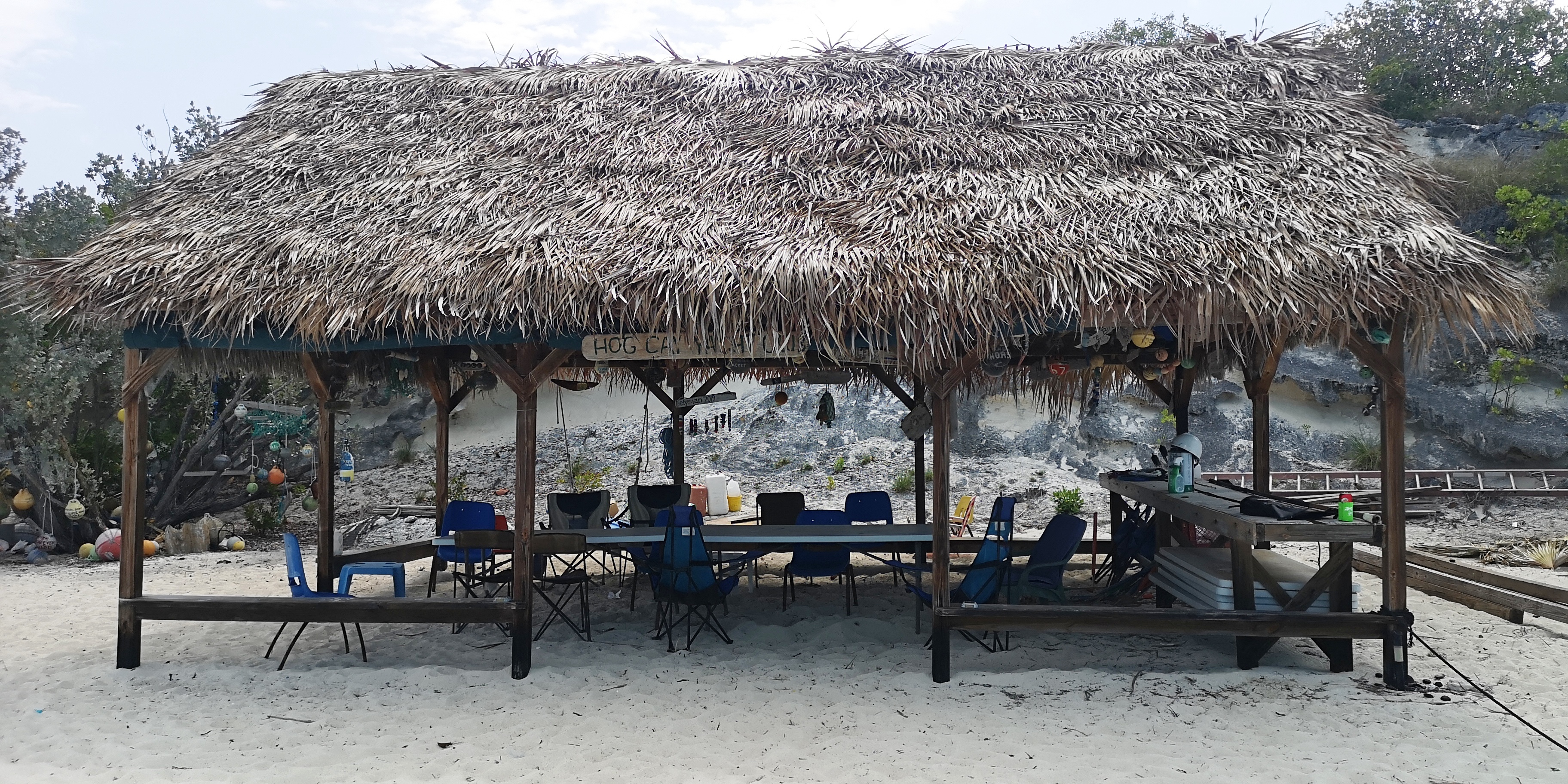 Segler sind auf Hog Cay wirklich willkommen. Maxine, die Besitzerin des kleinen Marktes der 20-Seelen-Gemeinde Duncan Town auf Ragged Island, hat Segler unterstützt, auf Hog Cay eine nette kleine Hütte zu bauen. Das weiß Rita, die eine schier unerschöpfliche Quelle an Informationen ist. Sie sagt, sogar die Regierung der Bahamas habe beim Bau der Hütte unterstützt. Der „Hog Cay Yacht Club“ dient uns allabendlich als netter Treffpunkt.