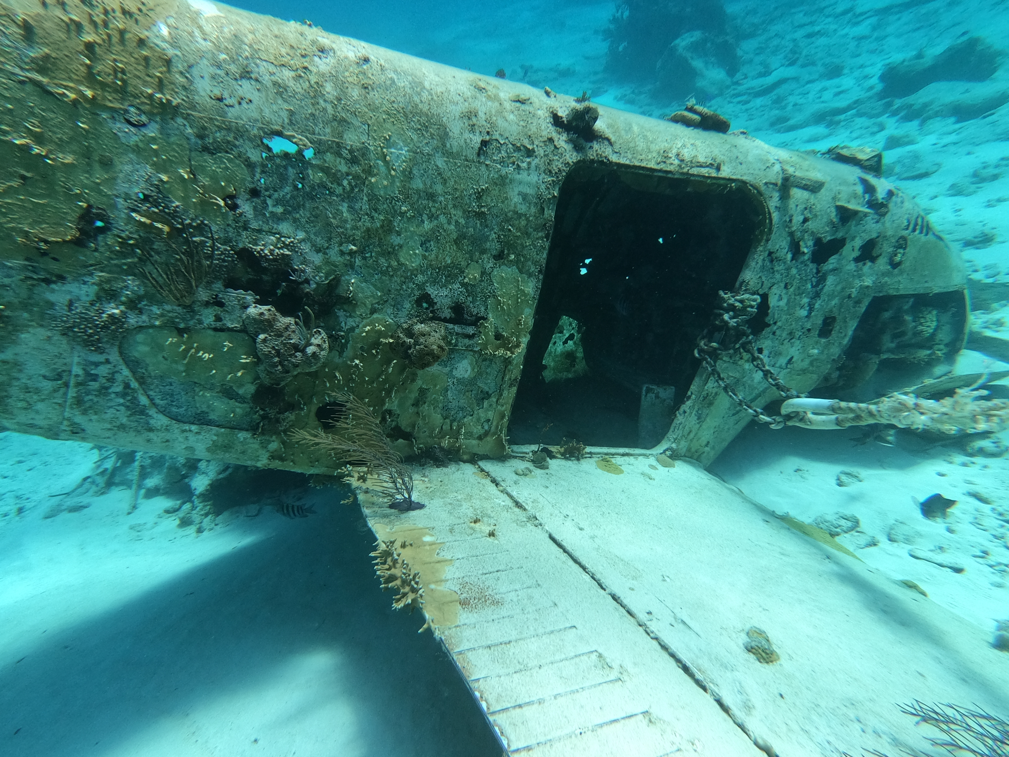 Ums Eck gibt es eine Dinghyboje für das Schnorcheln über einem Flugzeugwrack. Dieses liegt nicht am Strand, sondern im Meer. Und ist nicht sonderlich spektakulär.