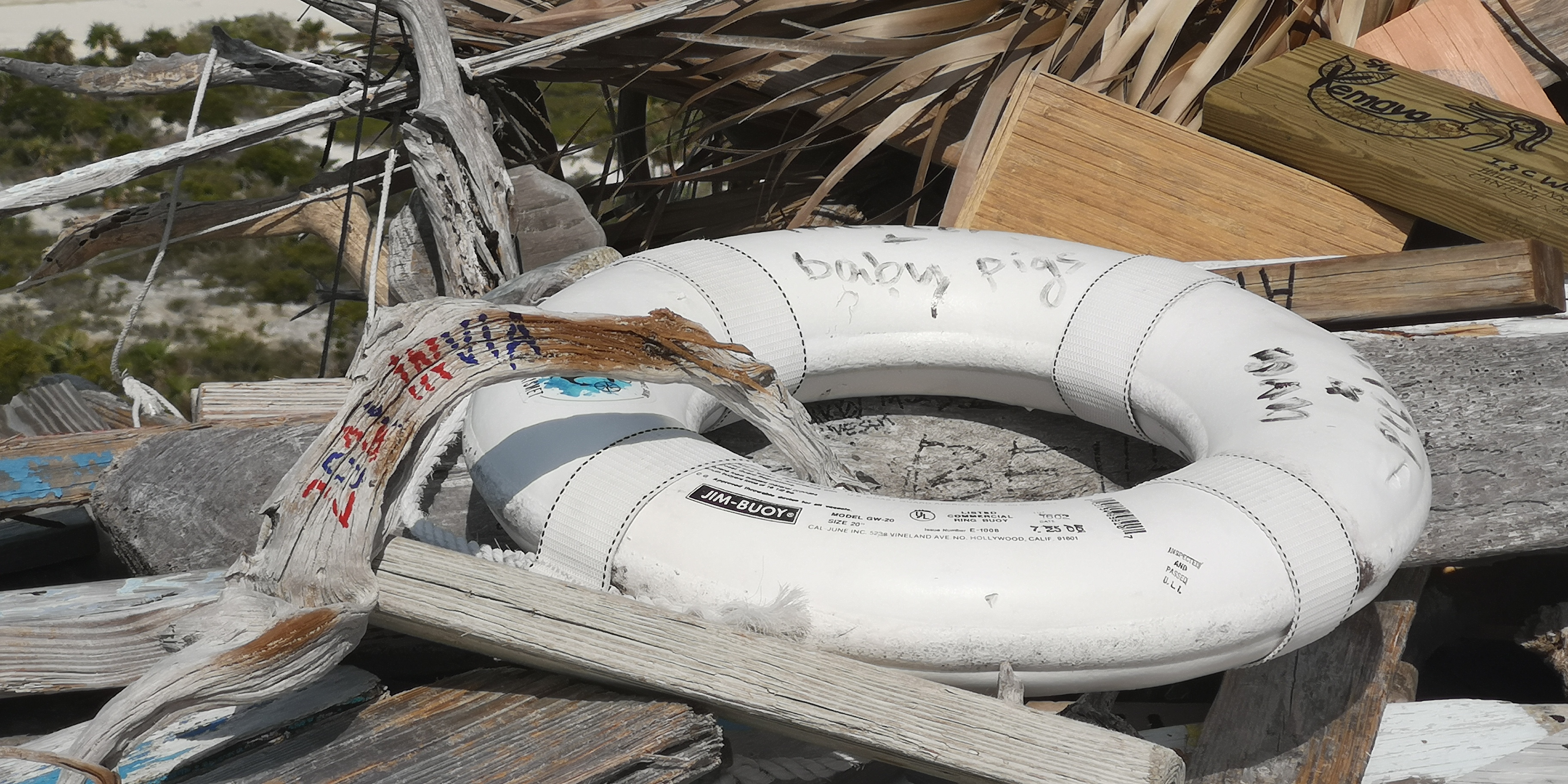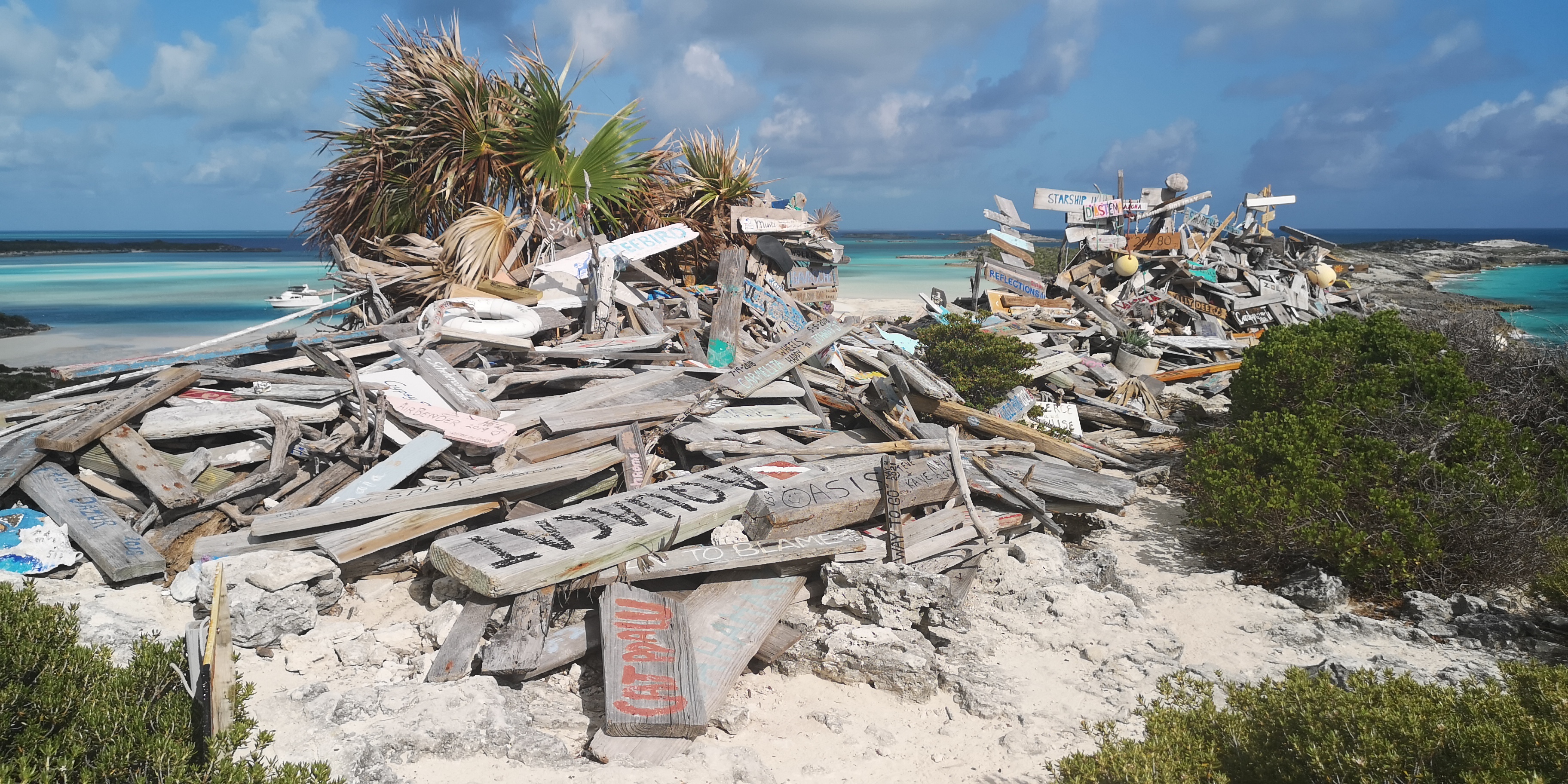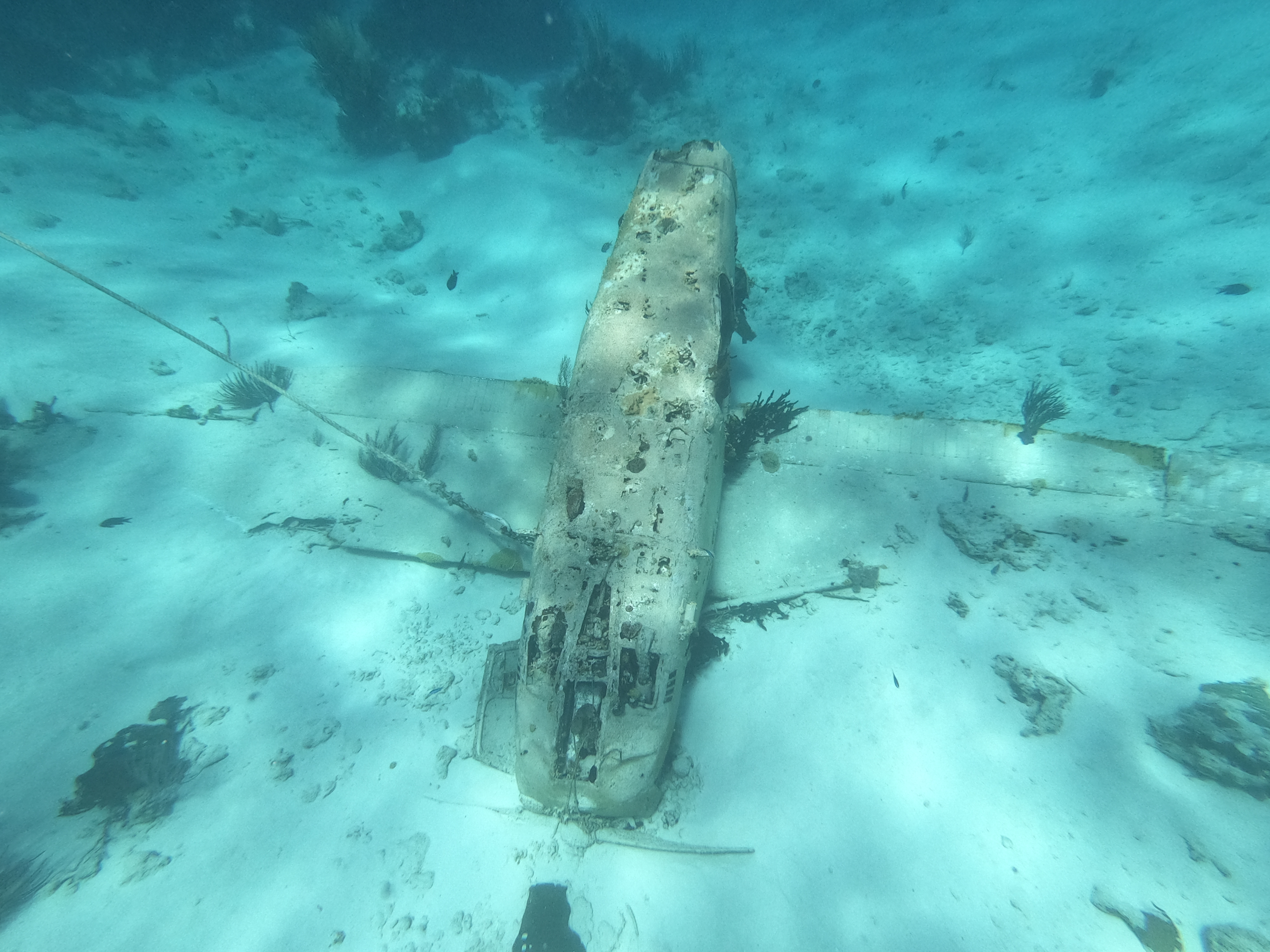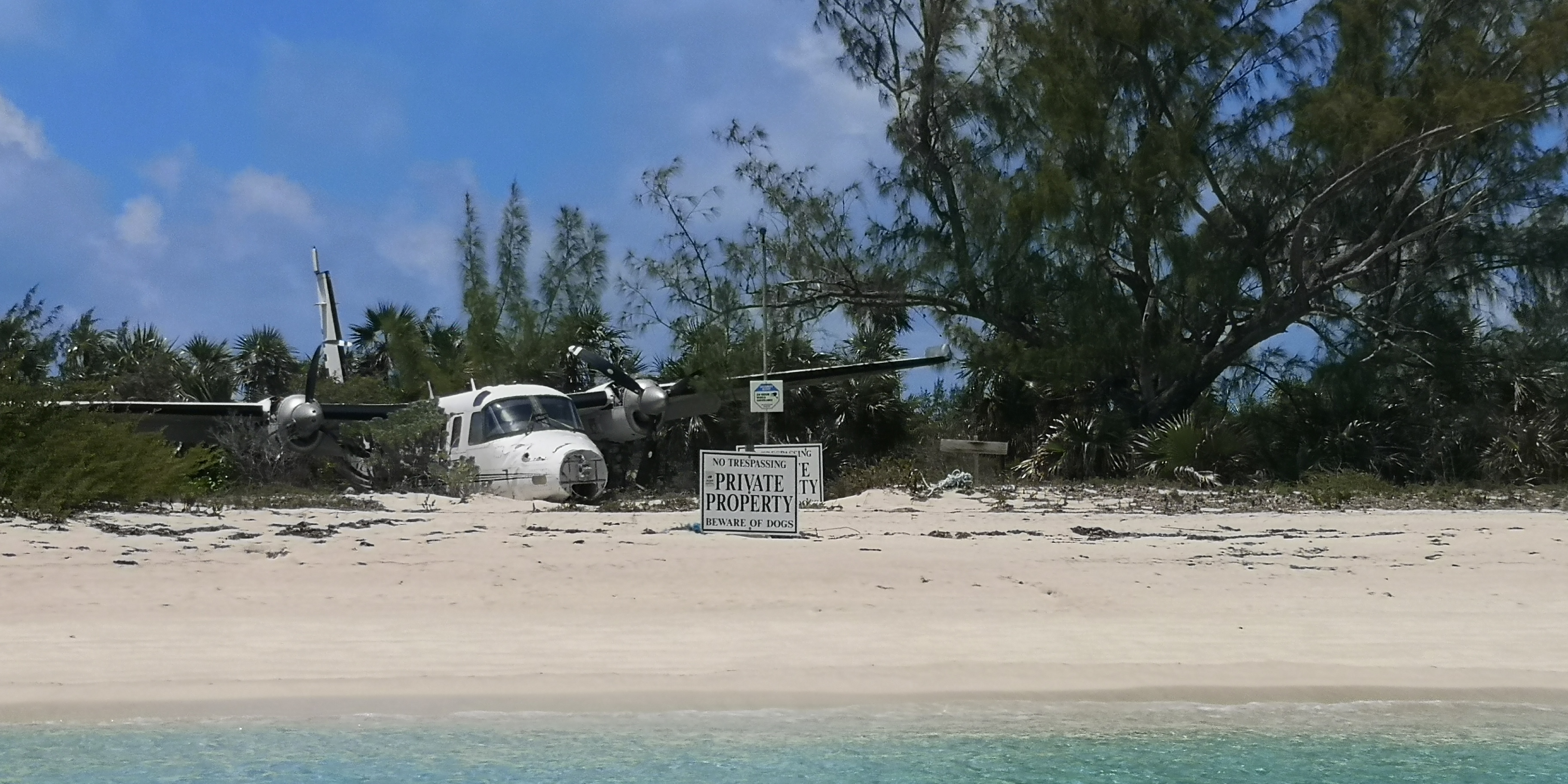INVIA verankern wir derweil um die Ecke vor Fowl Cay. Hier liegt eines der zahlreichen Flugzeugwracks der Bahamas, dieses hier mal an Land und nicht im Meer. Um etliche der Wracks ranken sich Stories aus kolumbianischen Drogengeschäften. Da hier aber knapp hinter dem Strand eine kleine Landebahn liegt, scheint ein Pilotenfehler wahrscheinlicher als eine Abenteuerstory.