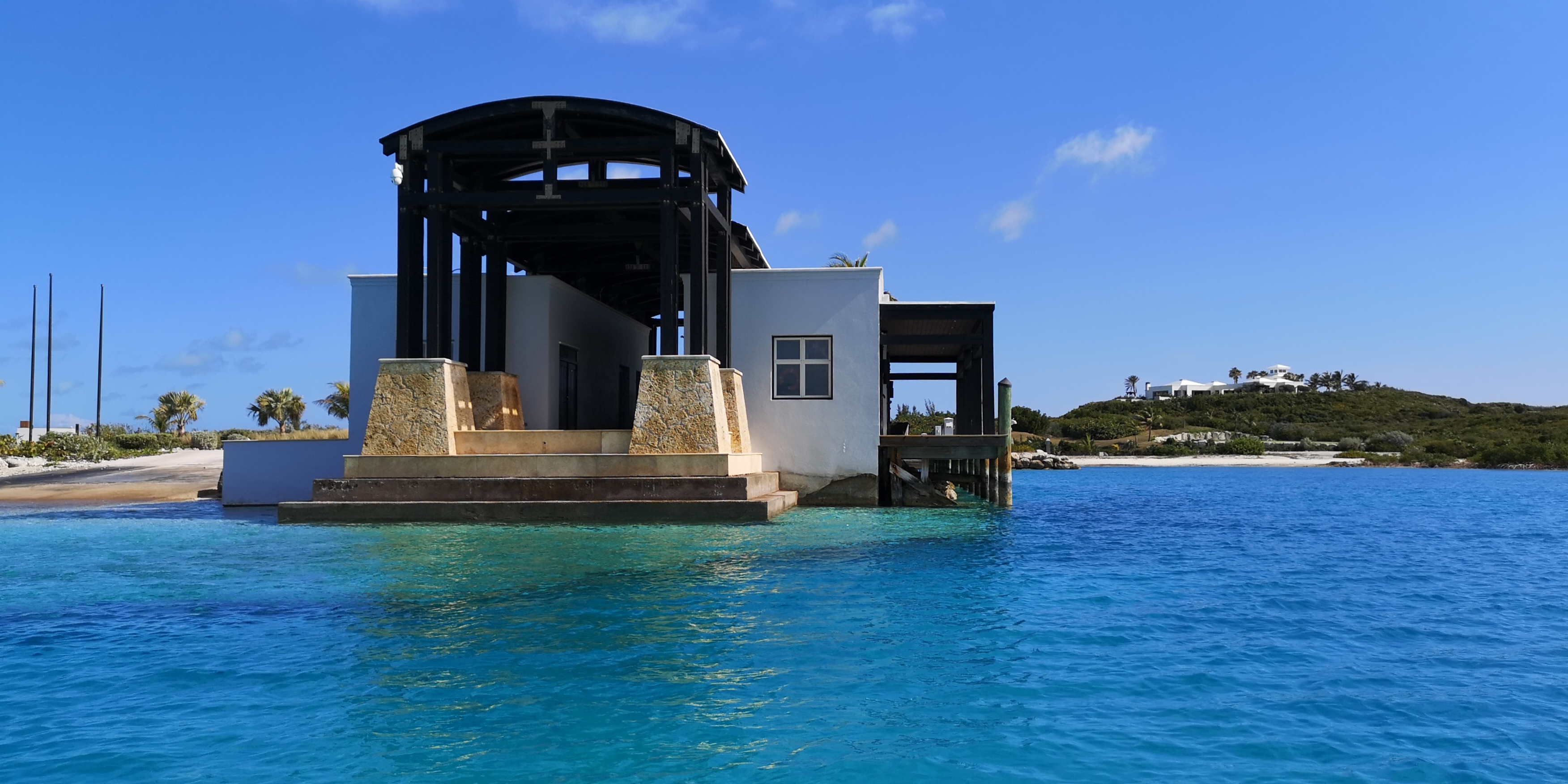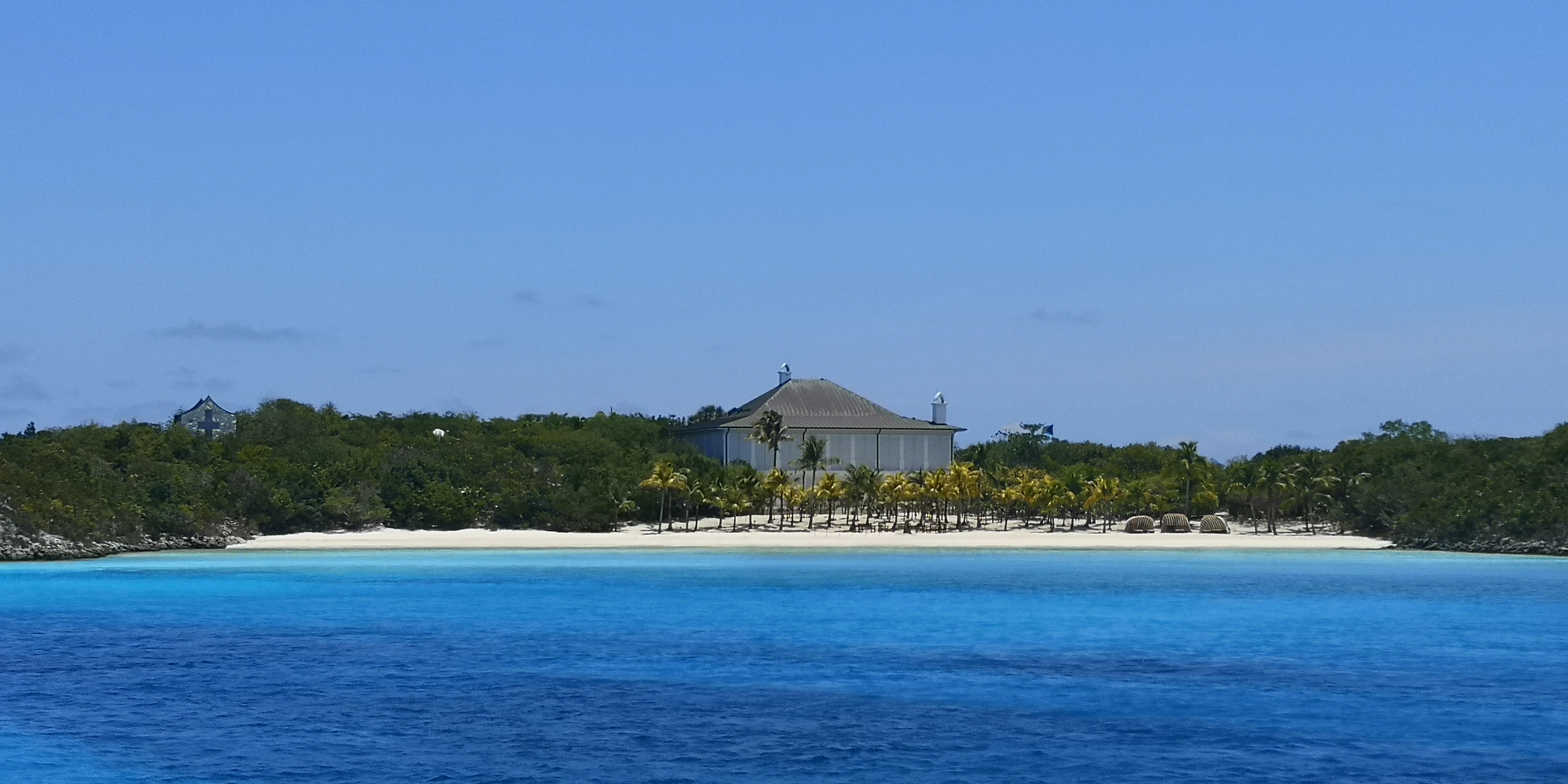 An Steuerbord ein Strand mit luxuriöser Villa und einer kleinen Kapelle. Sonnenliegen an einem Palmenstrand. Und ein Schild an diesem wie an den weiteren Stränden der Insel, wonach dies Privatgebiet ist und man bitte die Privatsphäre respektieren möchte.