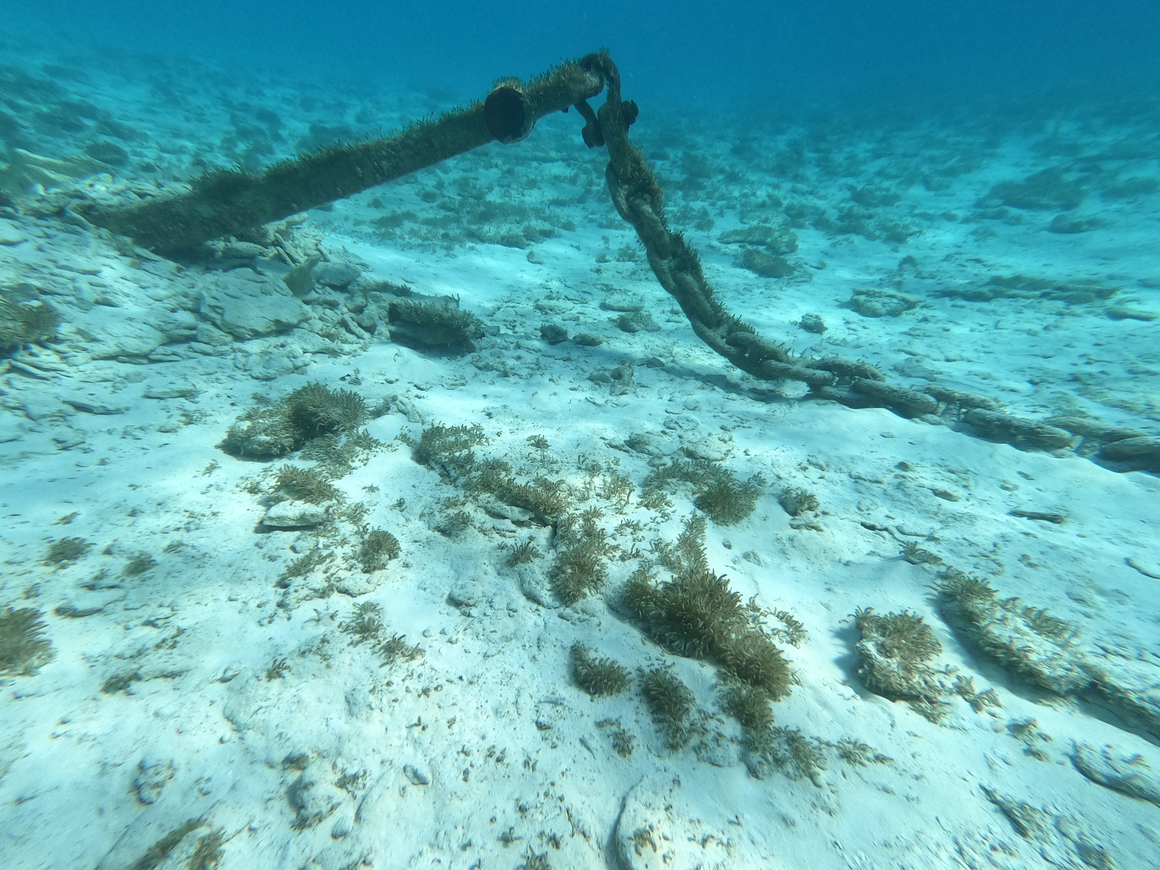 Aber der Captain kommt dennoch unzufrieden vom Anker abschnorcheln zurück. Der Anker liegt auf 5m Wassertiefe unter einer armdicken Kette. Die ist wohl am Boden der Bucht geblieben von früher vorhandenen Mooringbojen. Zwischen 1 und 2h brauchen wir, bis wir das Problem gelöst haben, auf die Uhr hat dabei keiner von uns geschaut.
