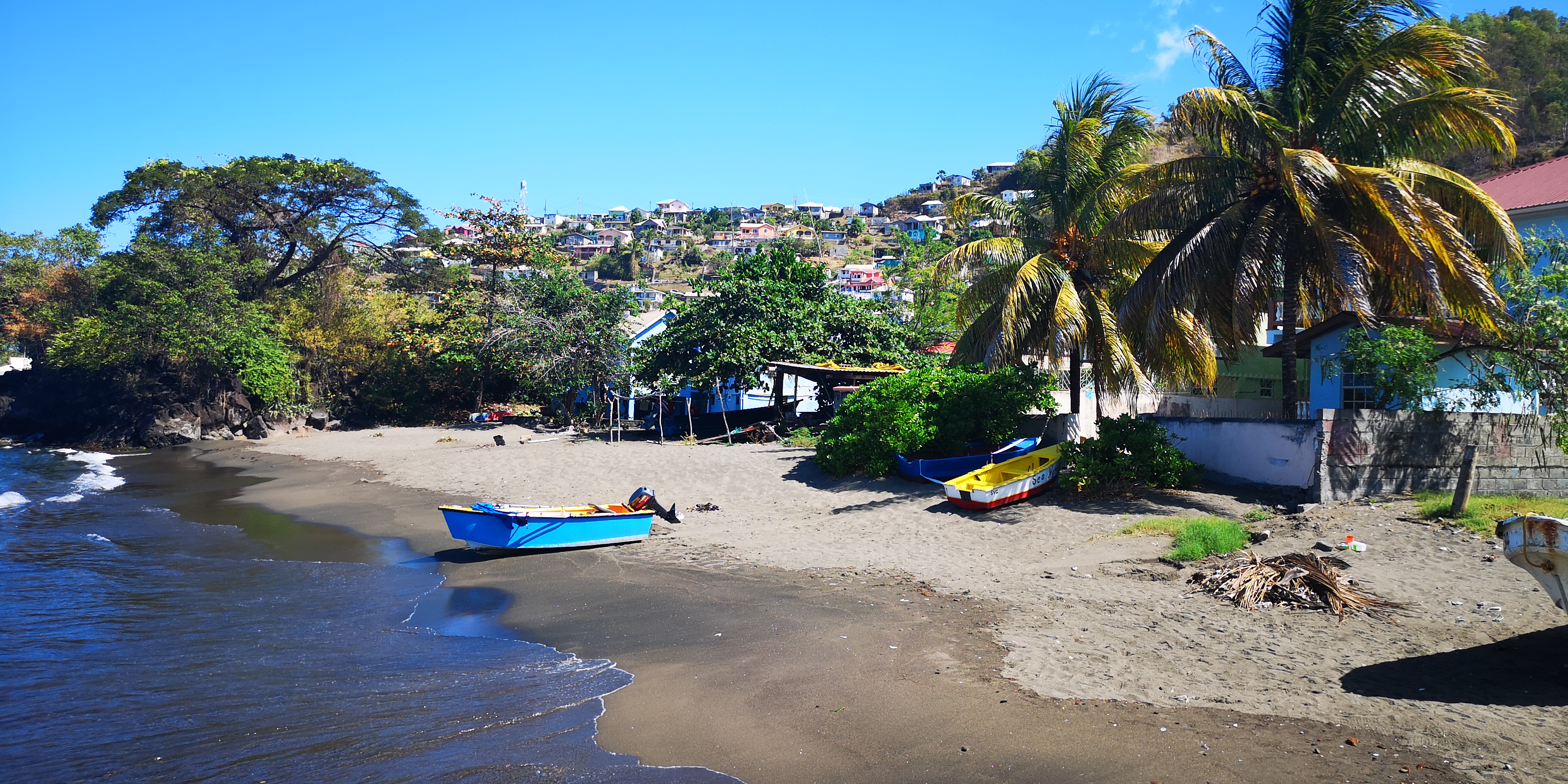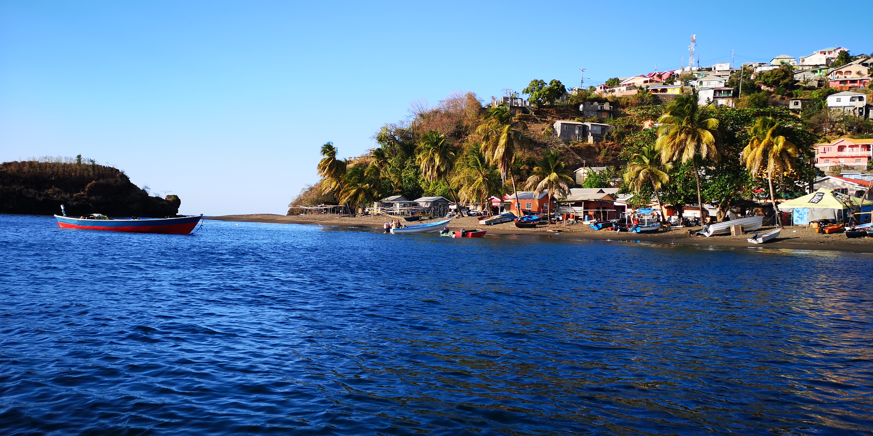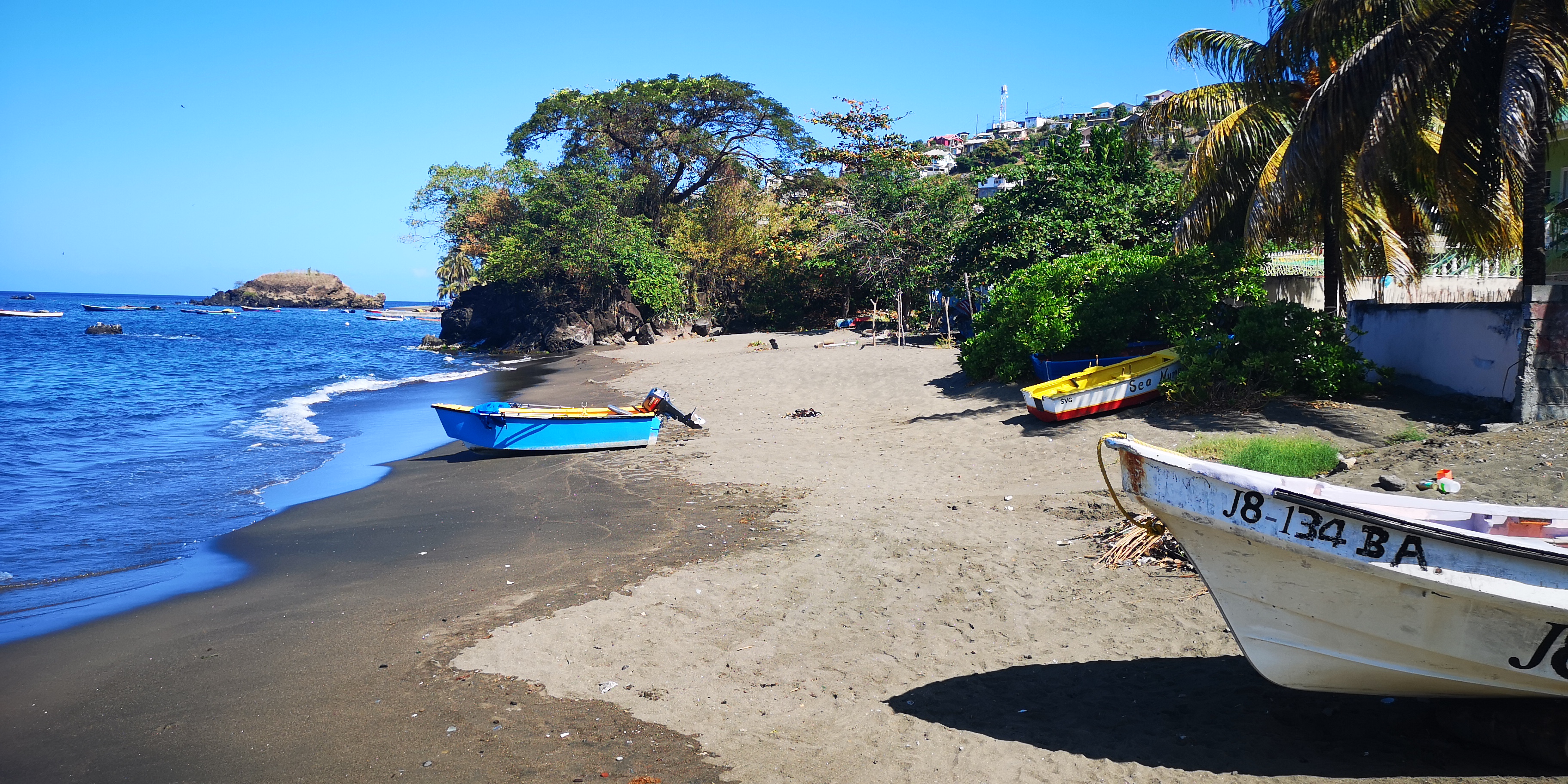 Zurück sollte es eigentlich mit dem Taxi bis zur Cumberland Bay gehen, aber Atnil erwartet uns bereits in Barrouallie. Und so machen wir den Rest der Strecke wieder mit dem Boot. Nachher sehe ich mir die Karte an und verstehe es: Mit dem Auto wäre es ein ordentlicher Umweg durch die Berge, während wir mit dem Boot in ein paar Minuten da sind. Schade an sich, wir hätten gerne noch ein wenig vom Land gesehen, aber es war auch so unheimlich nett, interessant und spannend: