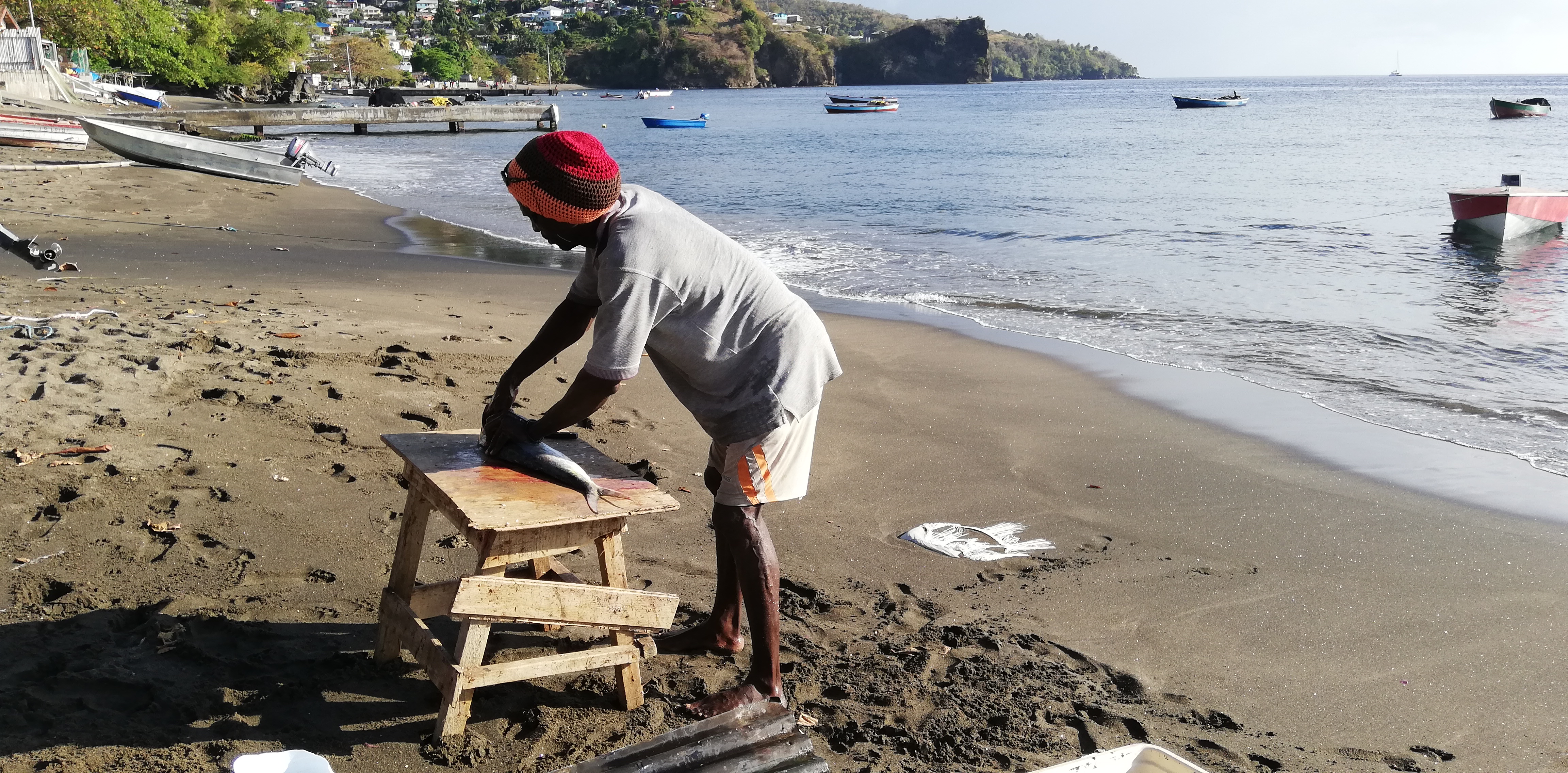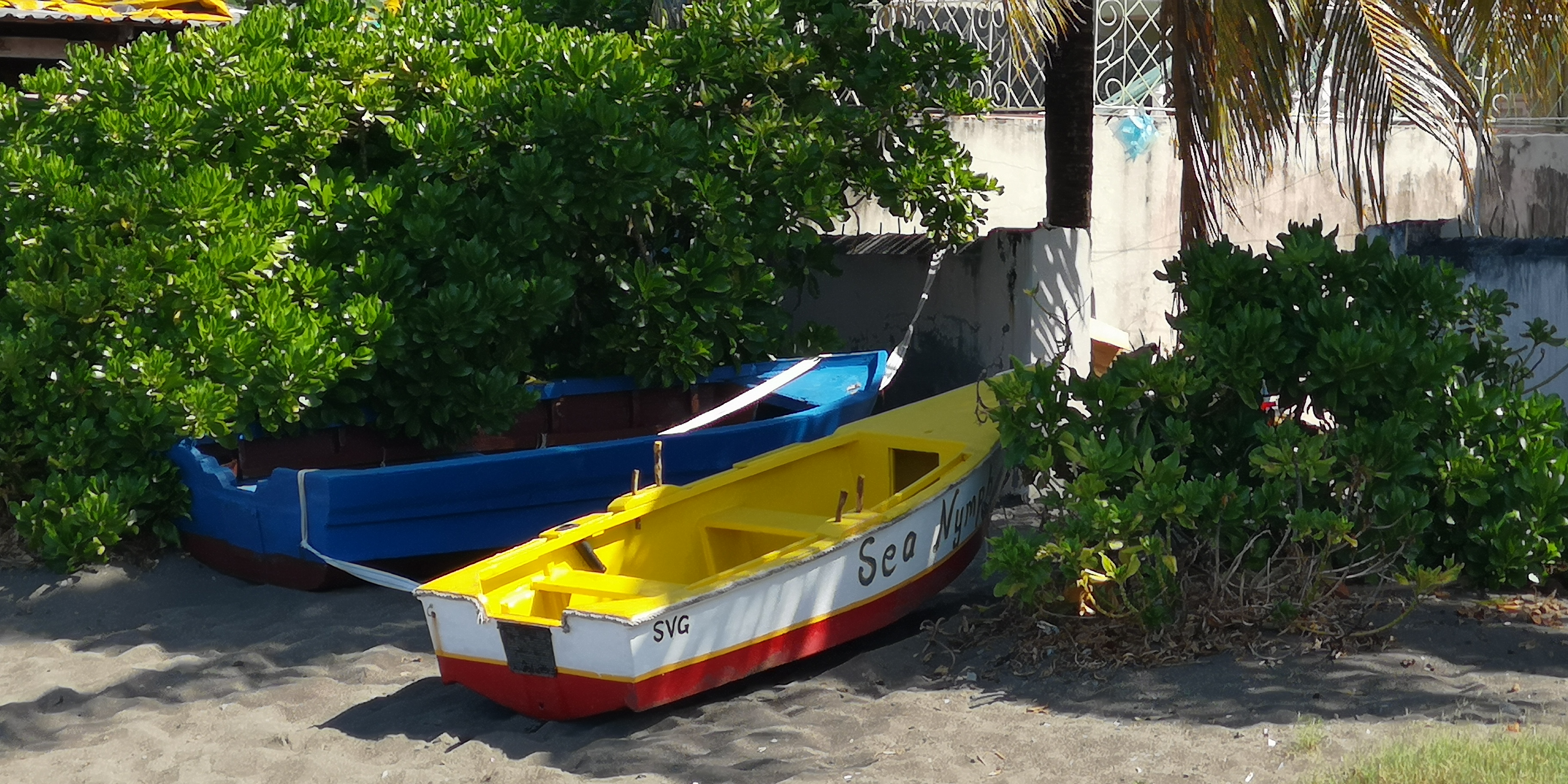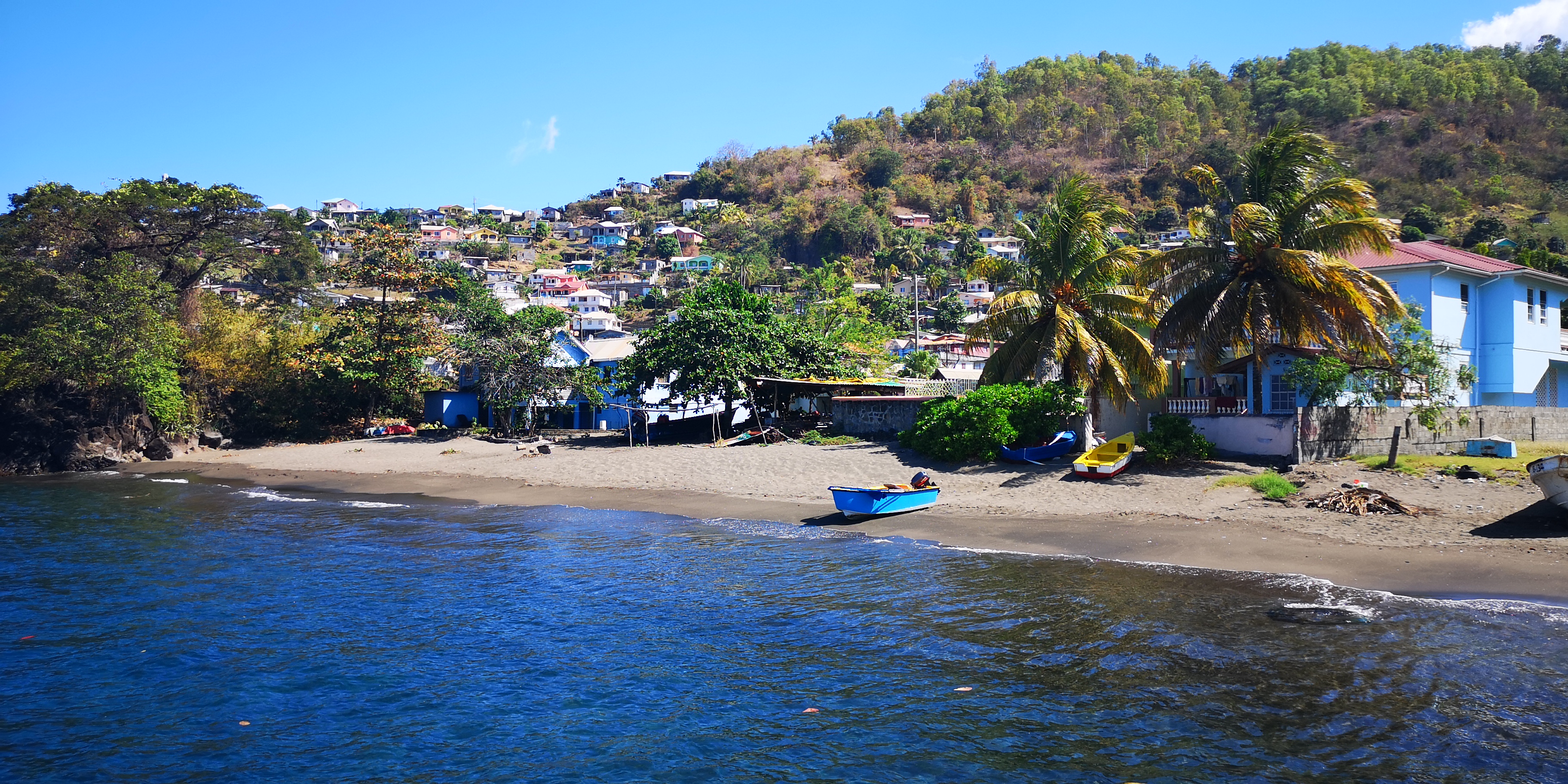 Wir bitten Atneal, uns ein Taxi zu organisieren, mit dem wir ein wenig der Küste entlang bis in die Hauptstadt Kingstown fahren können. Atneal holt uns am Vormittag ab, wir fahren erstmal mit seinem Holzboot 2 Buchten weiter – vorbei an der Walillabou Bay nach Barrouallie: