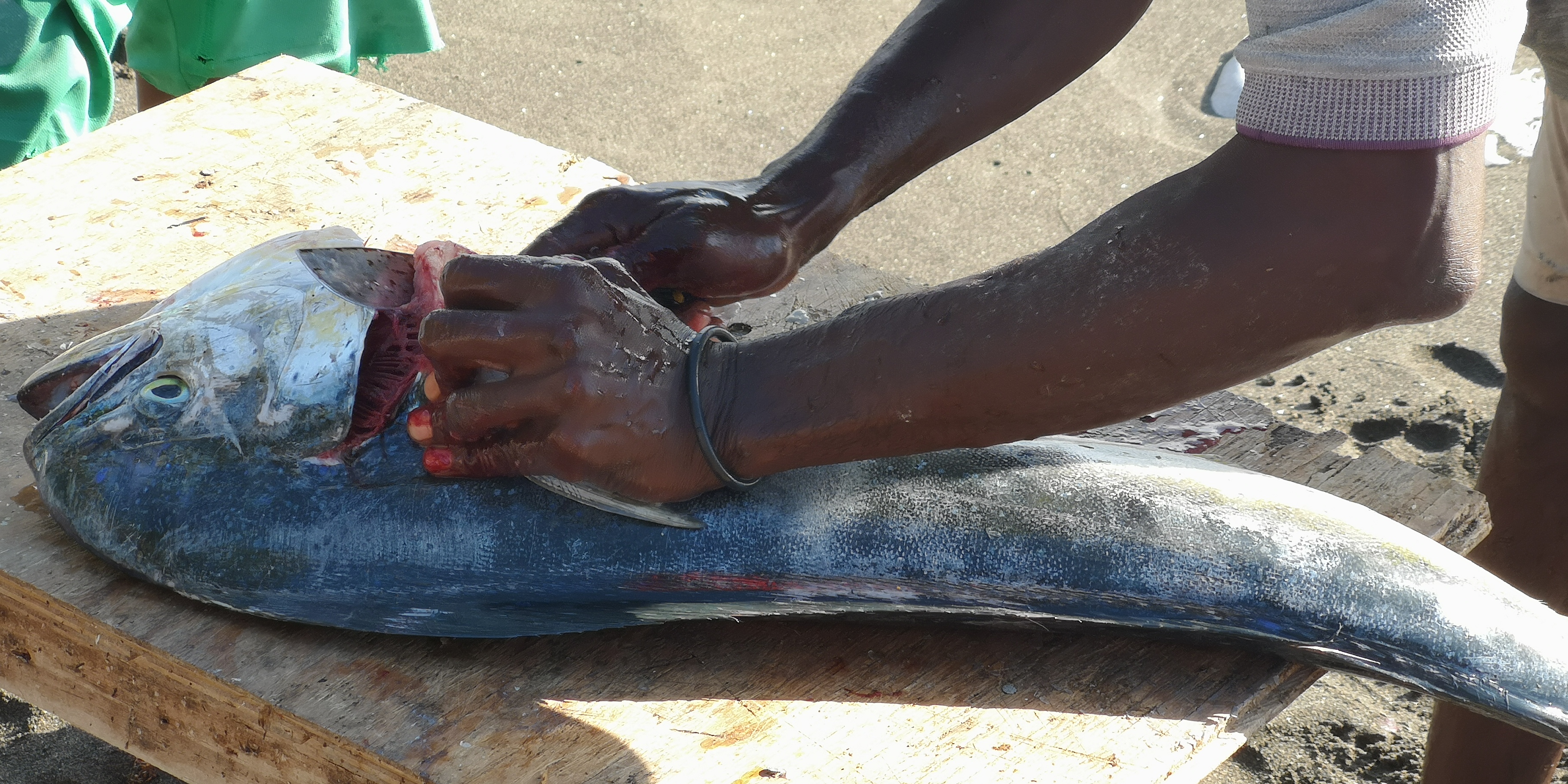 Wir beide sind der Ansicht, dies war das wohl am besten zubereitete Hähnchen, das wir seit langem gegessen hatten. Super lecker! Anlanden mit unserem schweren Dinghy ist schwierig, es gibt keinen Steg mehr, nur noch Reste davon. Wir lassen uns von Atneal abholen und zurück bringen – er hat ein Holzboot mit Aussenborder.