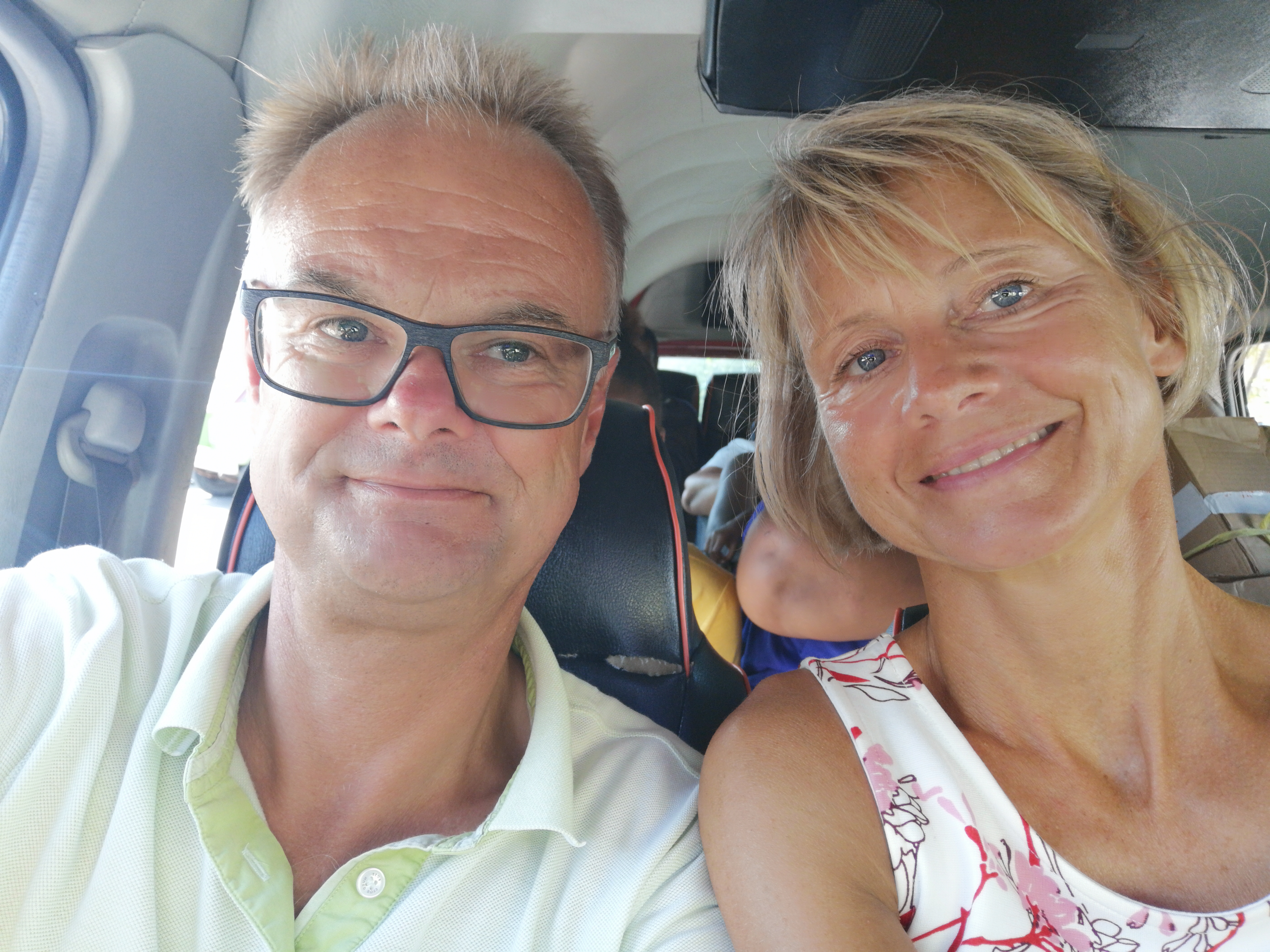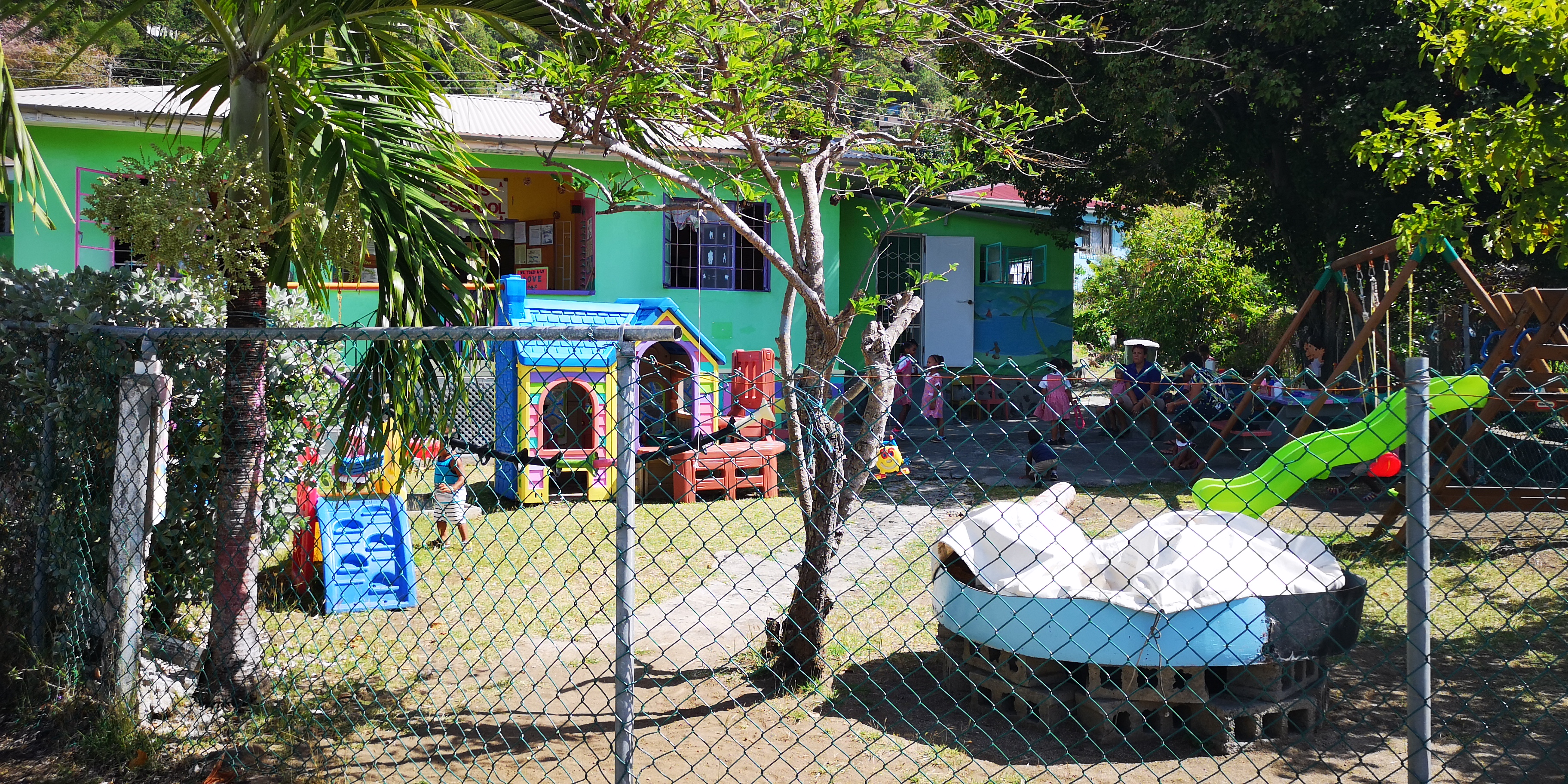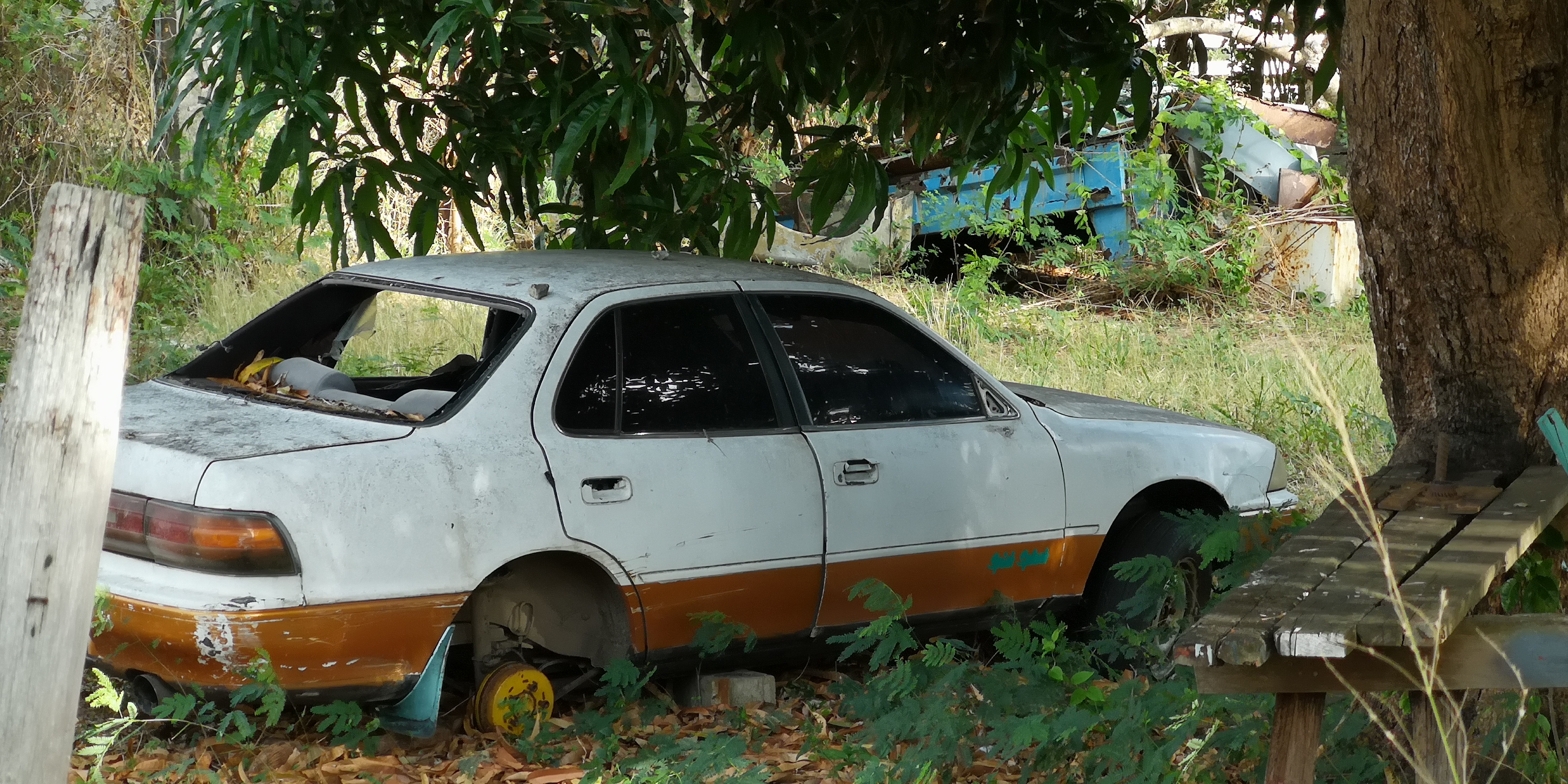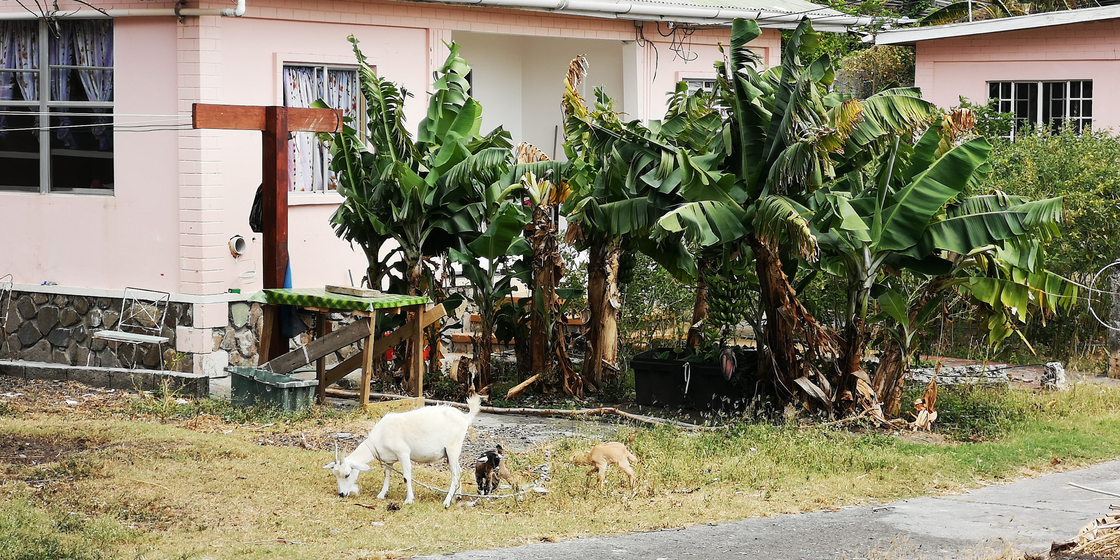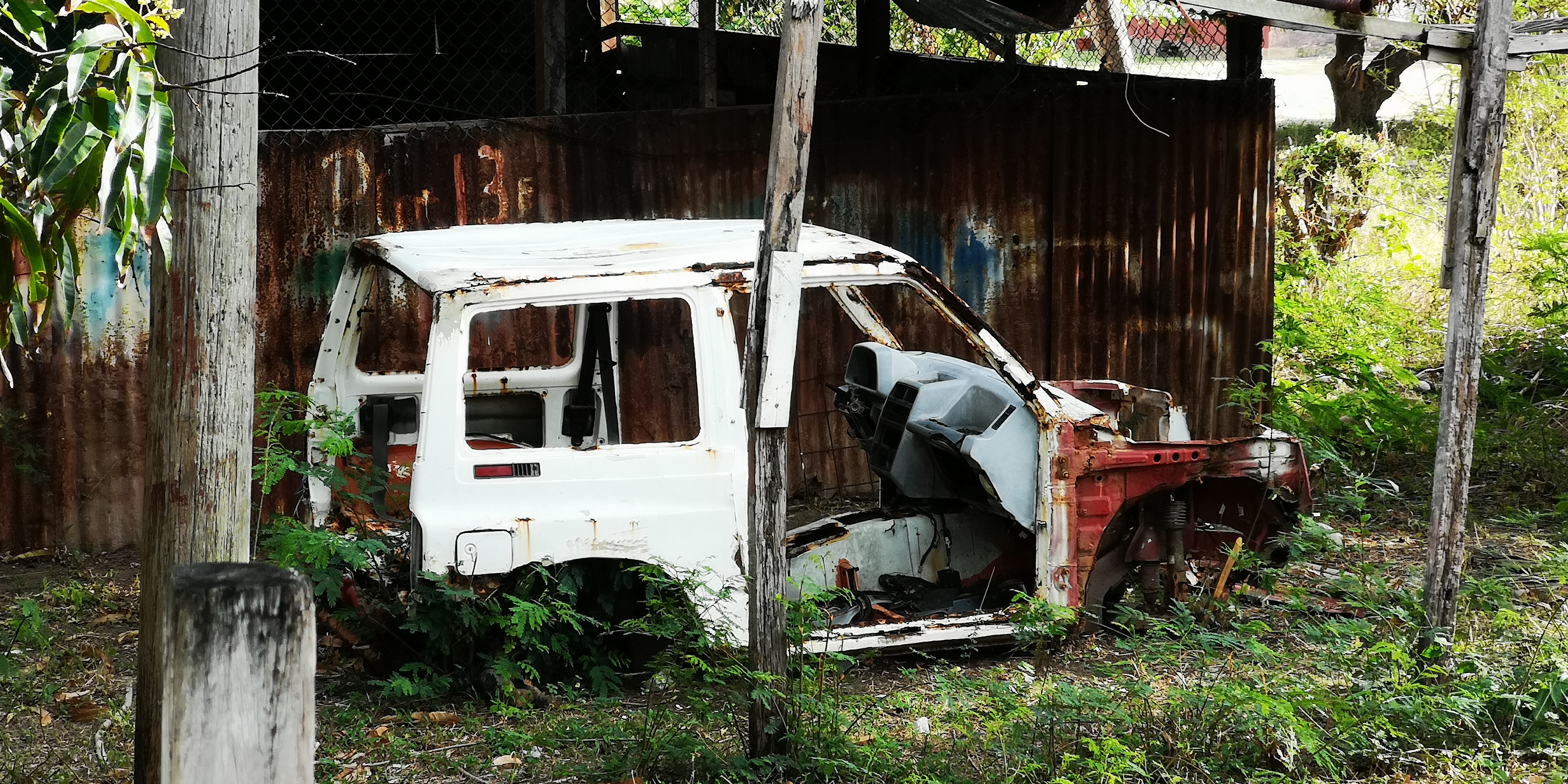 Wir werden vom Fahrer gebeten, in der Nähe des Flughafens auszusteigen und kurz zu warten. Er fährt von dort aus steil einen Hügel hinauf, wahrscheinlich musste er Gewicht sparen und hat uns daher kurz ausgeladen. Wir warten in Resten eines Autowracks, das als Wartebank umfunktioniert wurde. Und erfahren von den Einheimischen, dass schräg gegenüber eine Kirche gebaut wird, in der auch eine Preschool untergebracht werden soll. Damit die Kleinen nicht schon so weit Taxi fahren müssen. Die Religionsgruppe sagte uns nichts, aber es gibt auf den Inseln viele kleine christliche Kirchengemeinden.