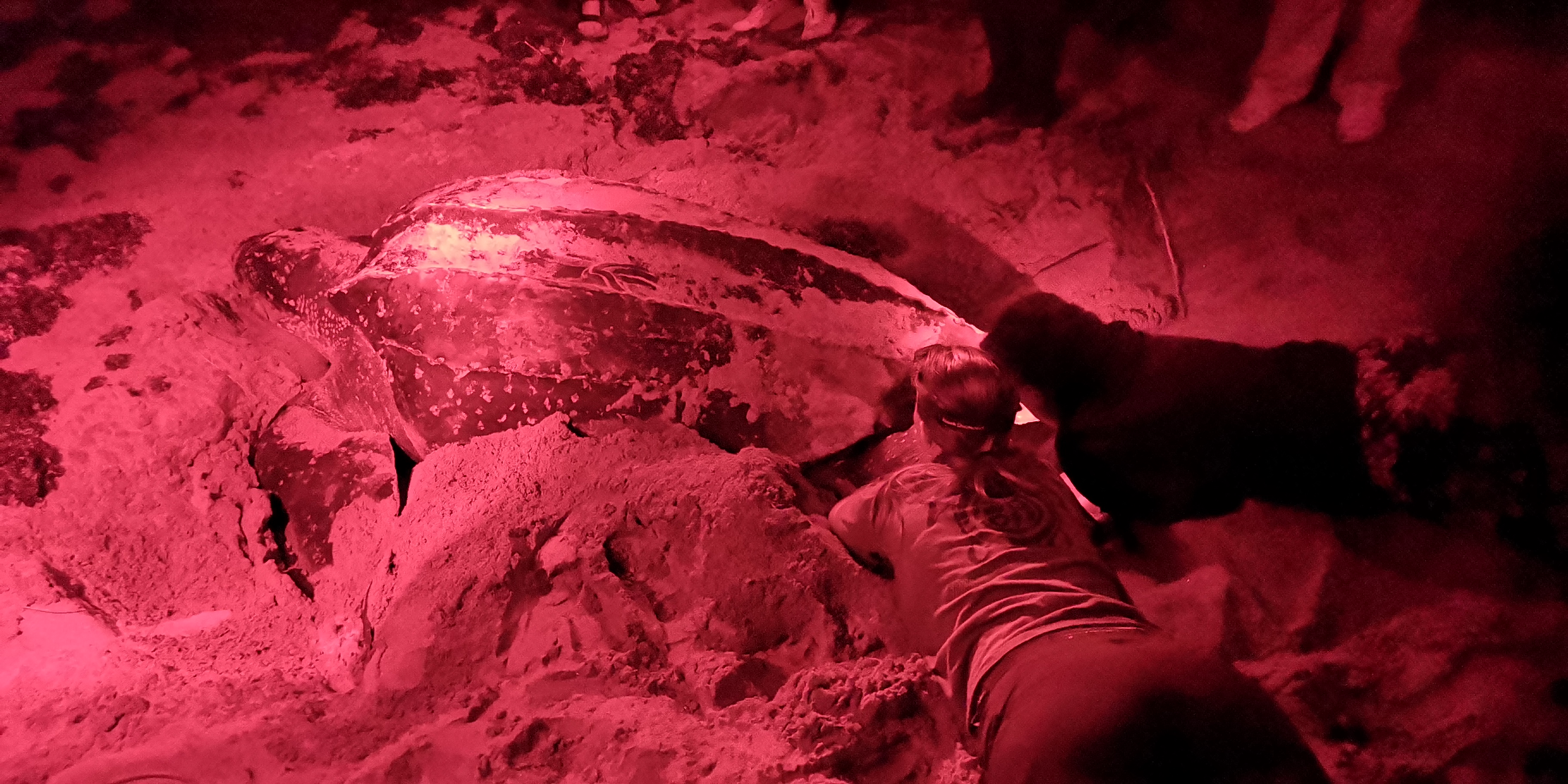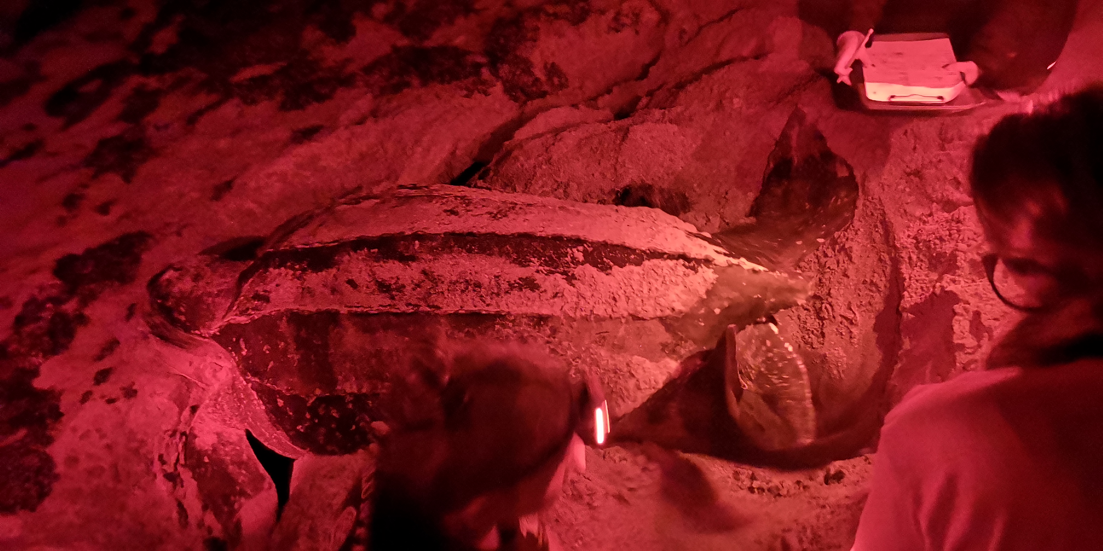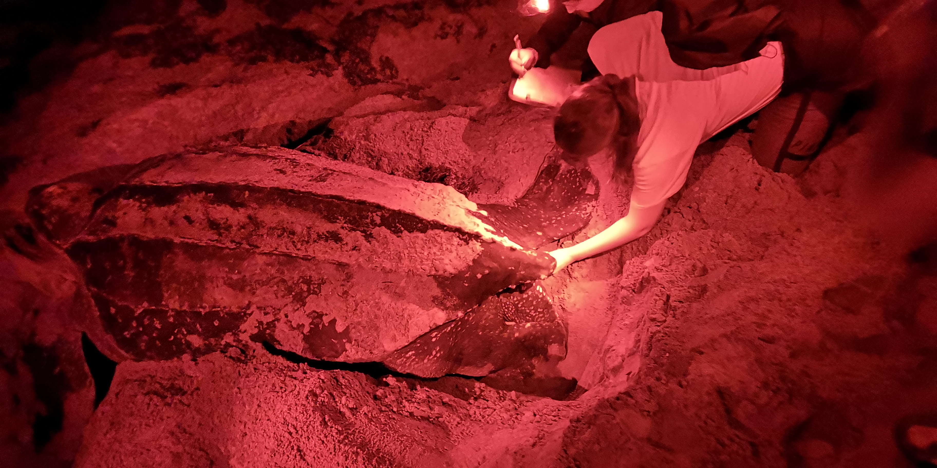Die Lederschildkröten leben ausschließlich im Meer. Nur die Weibchen kommen zur Eiablage an Land und bevorzugen dazu den Ort, an dem sie selbst zur Welt kamen. Wir erreichen den Strand gegen sieben Uhr abends und dann heißt es warten und nochmals warten. Eine Organisation kümmert sich um den Schutz der Schildkröten und wacht darüber, dass sie bei der Eiablage nicht gestört werden. Man darf in Gruppen bis zu 13 Leuten heran, wenn die Schildkröte ihren Nistplatz erreicht hat. Um ein schädliches Blenden der Schildkröte zu vermeiden, darf nur rotes Licht eingesetzt werden.