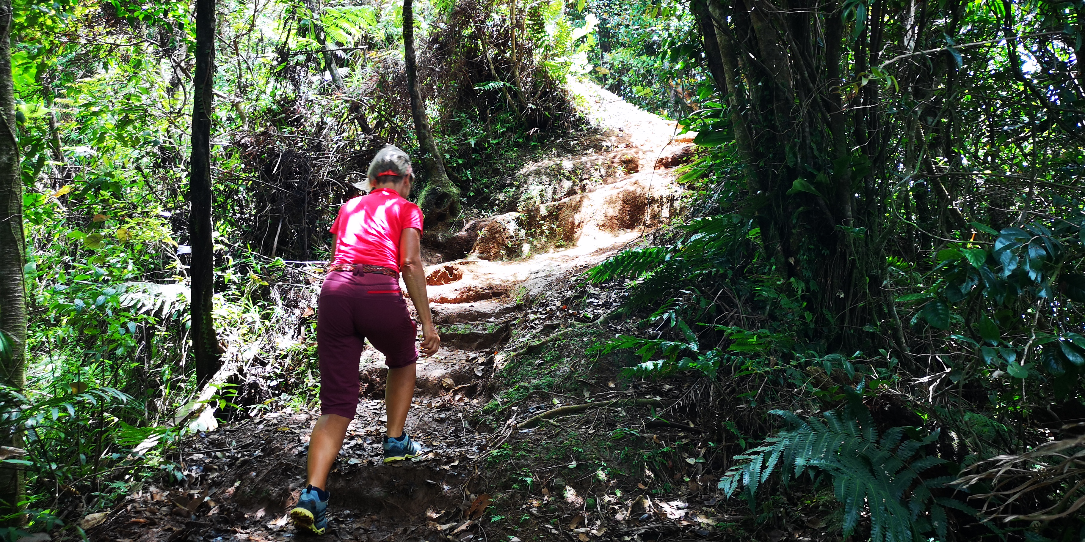 Der Weg auf den Mount Quaqua ist leicht zu finden, stellenweise matschig und rutschig, lässt sich aber gut gehen. Ein beschilderter Abzweig führt zu den Concord Falls, drei übereinander gelagerten Wasserfällen. Der Weg dorthin ist ziemlich nass und stellenweise sehr schmal. Gegen Ende findet man gelbe Plastikbänder an Bäumen als Markierung und auch Seile für Halt auf dem rutschig steilen Grund. Davor ist man auf sich gestellt und sollte gut greifende Schuhe tragen. Schwindelfreiheit ist auf den teils schmalen Wegen entlang steilerer Hänge wichtig. Und ausreichende Balance, um mehrfach ein Flussbett über Steine zu queren. Belohnt wird man auf der doch anstrengenden Tour mit herrlicher Landschaft.