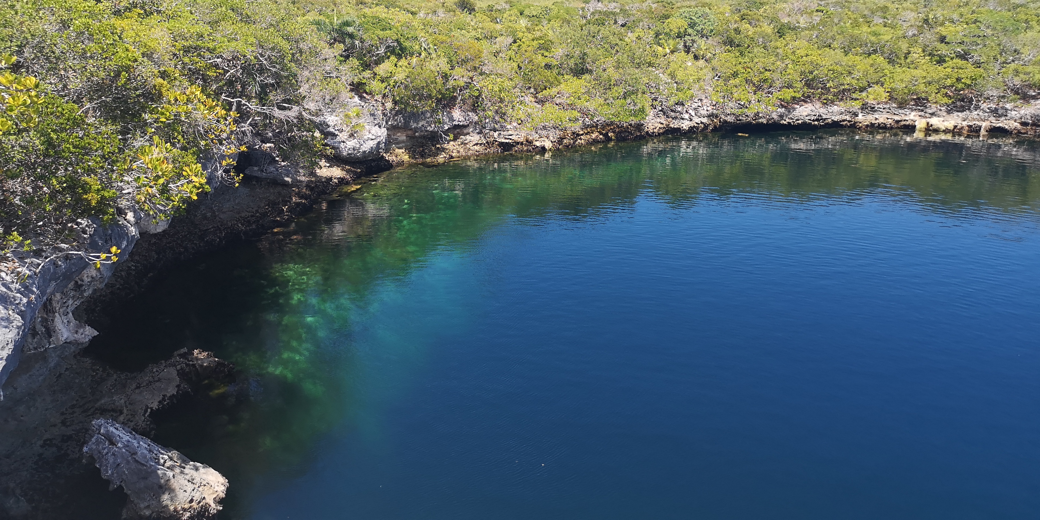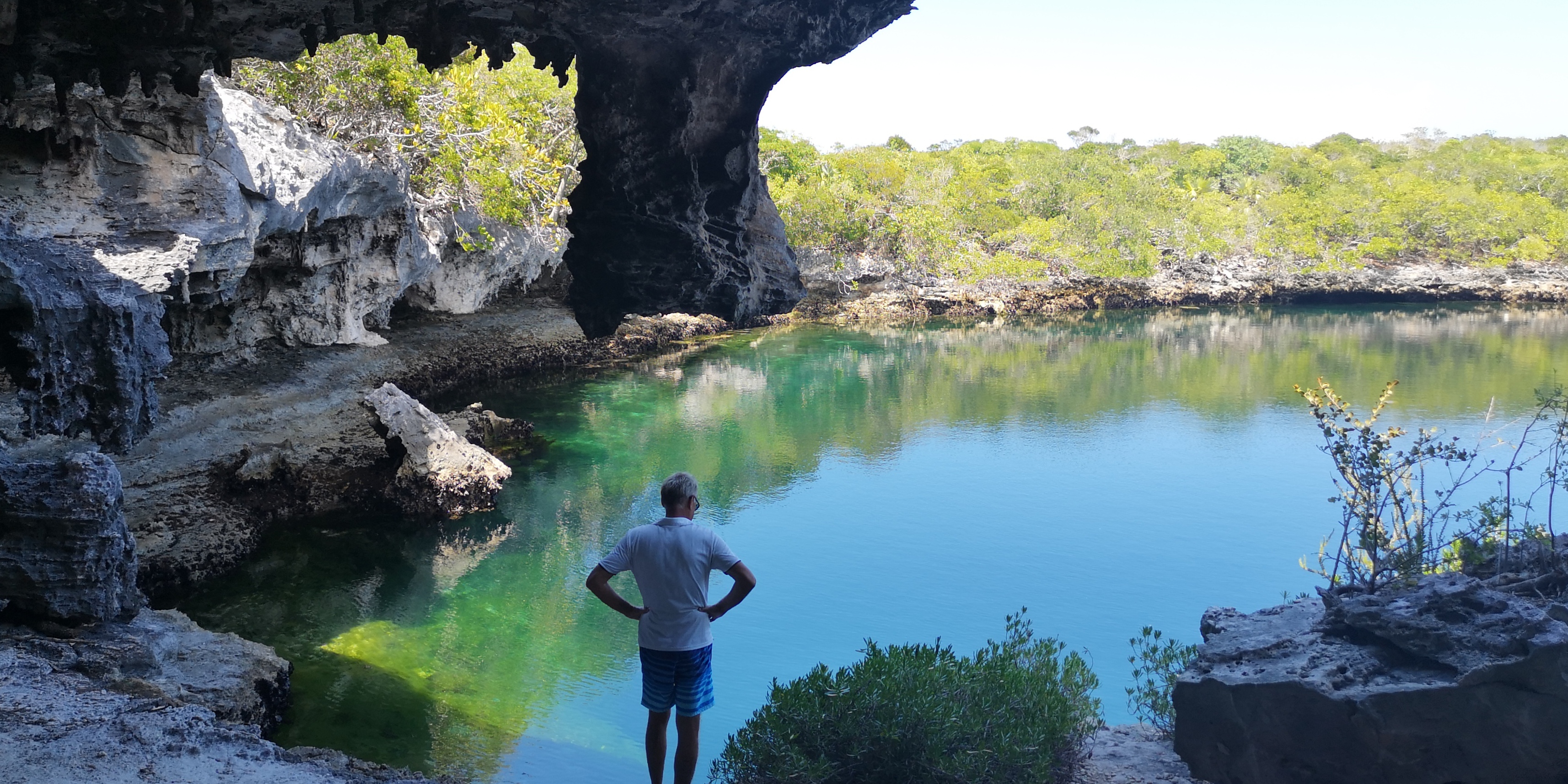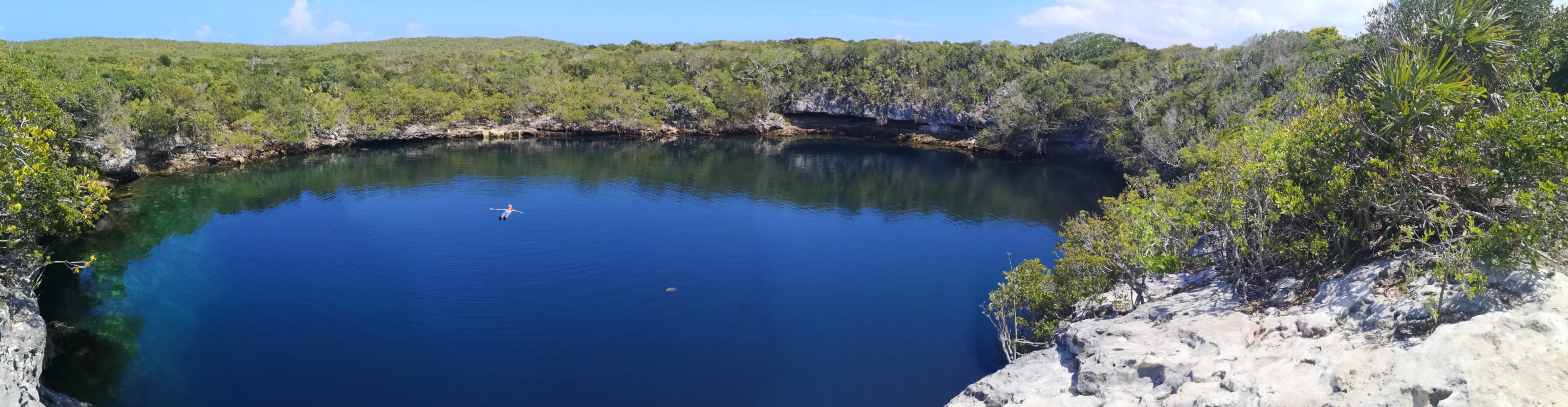 Die Bahamas sind übersät mit Blue Holes. Darüber habe ich schon in diversen BLOGs berichtet. Einige wenige Blue Holes sind nur von Land aus erreichbar – so auch das auf Hoffman’s Cay. Es ist sogar relativ weit im Inselinneren – und mit rund 180 m (laut Wikipedia), das sind 600 Fuß, enorm tief.