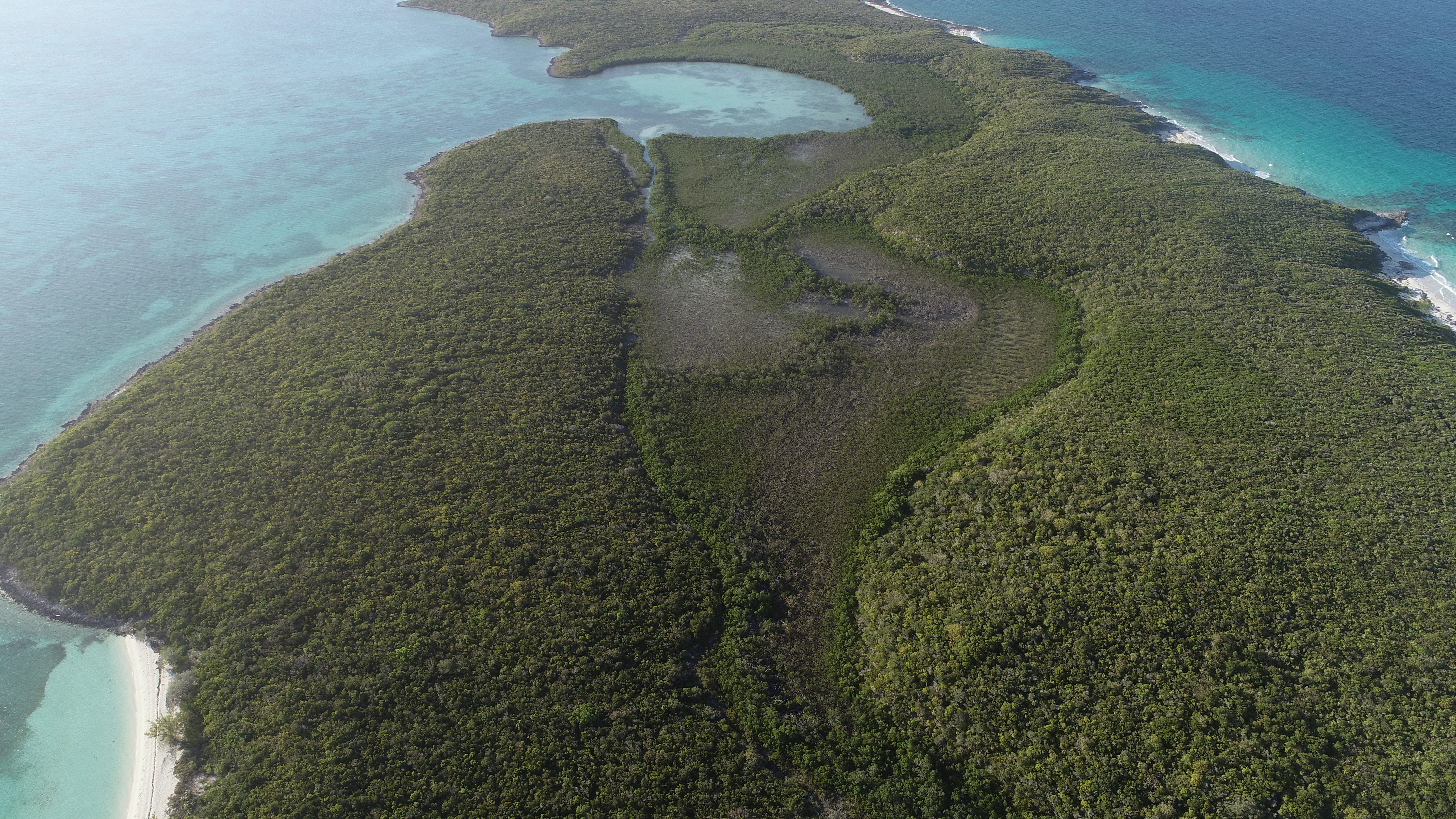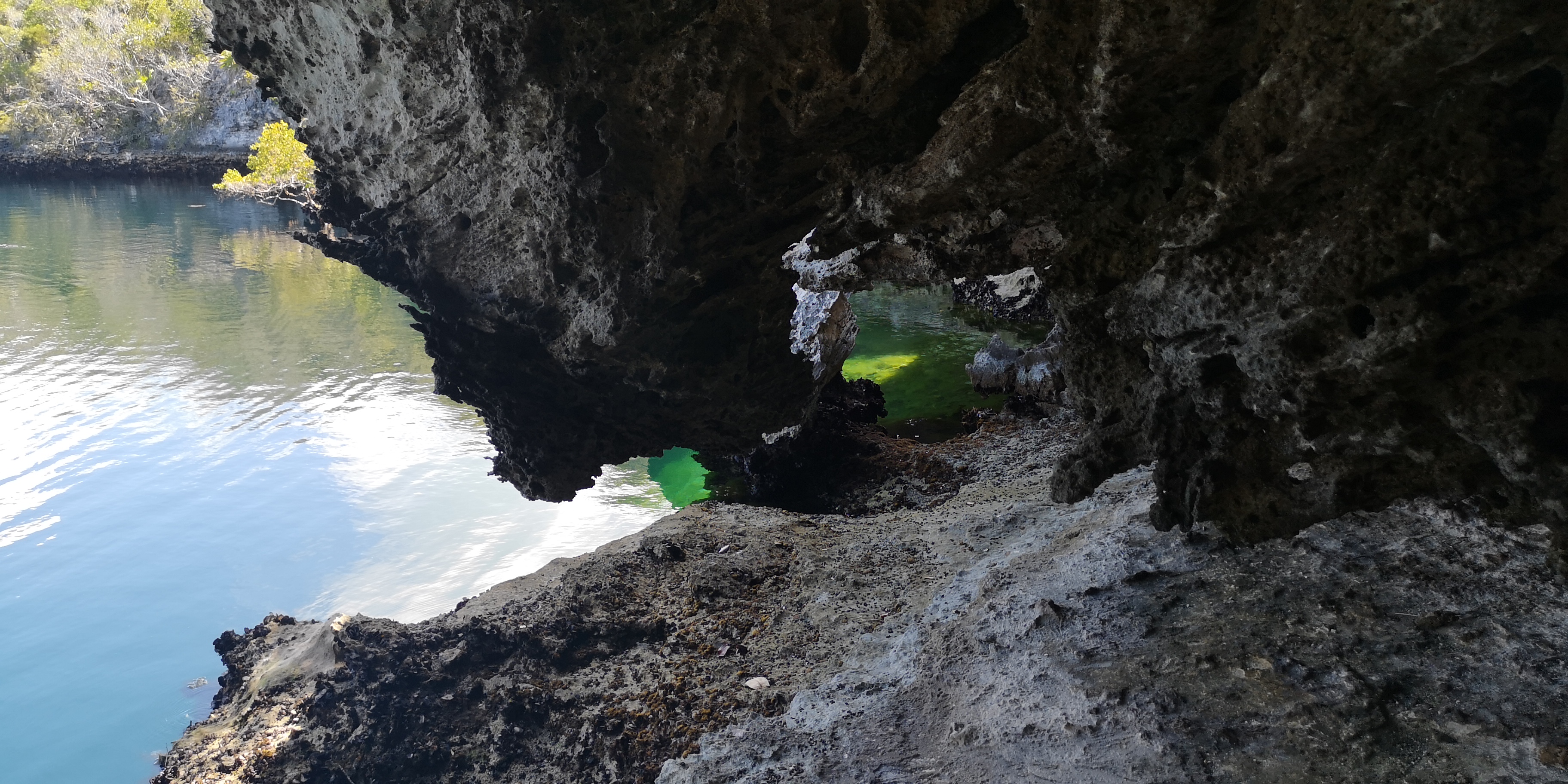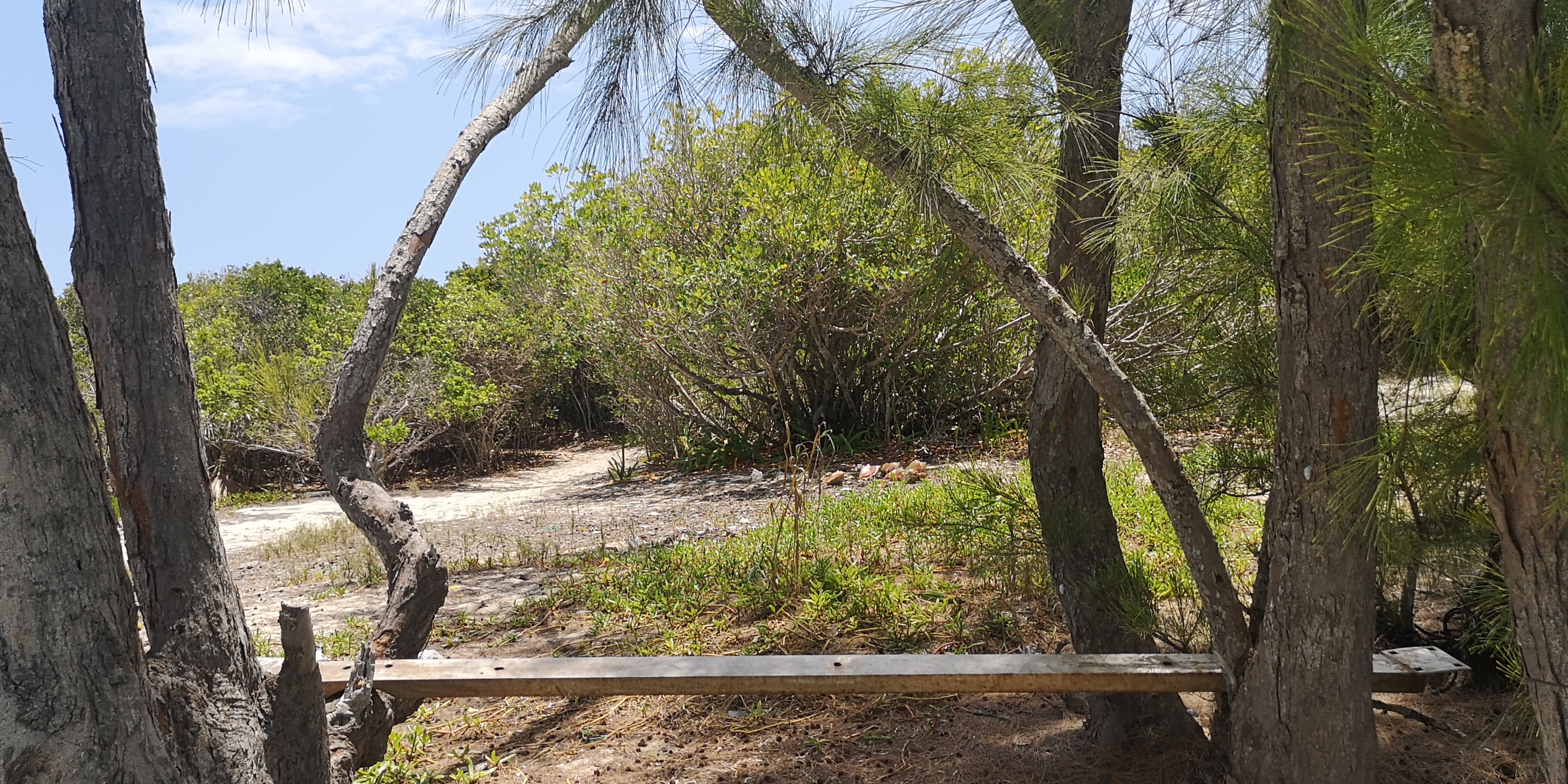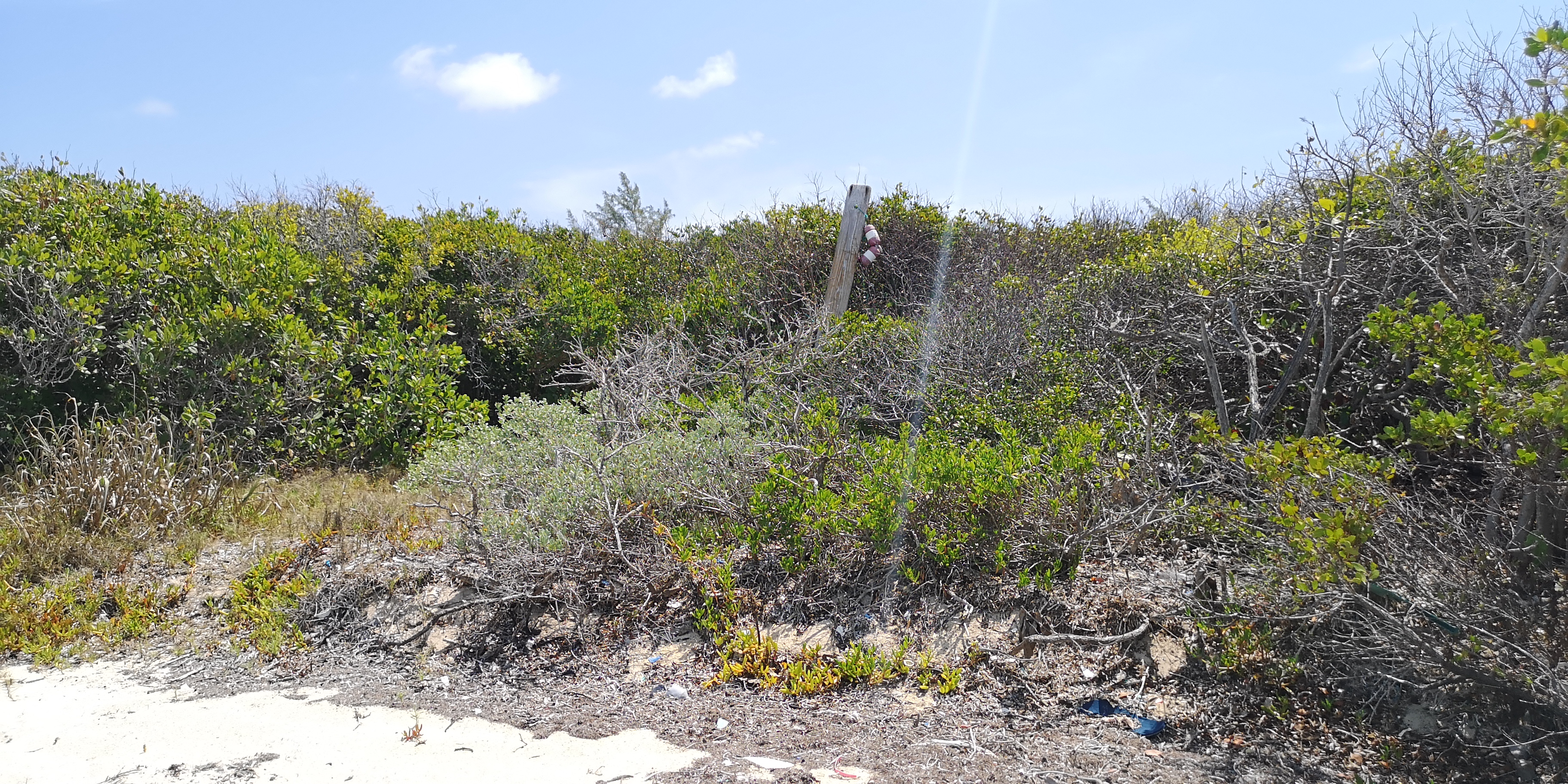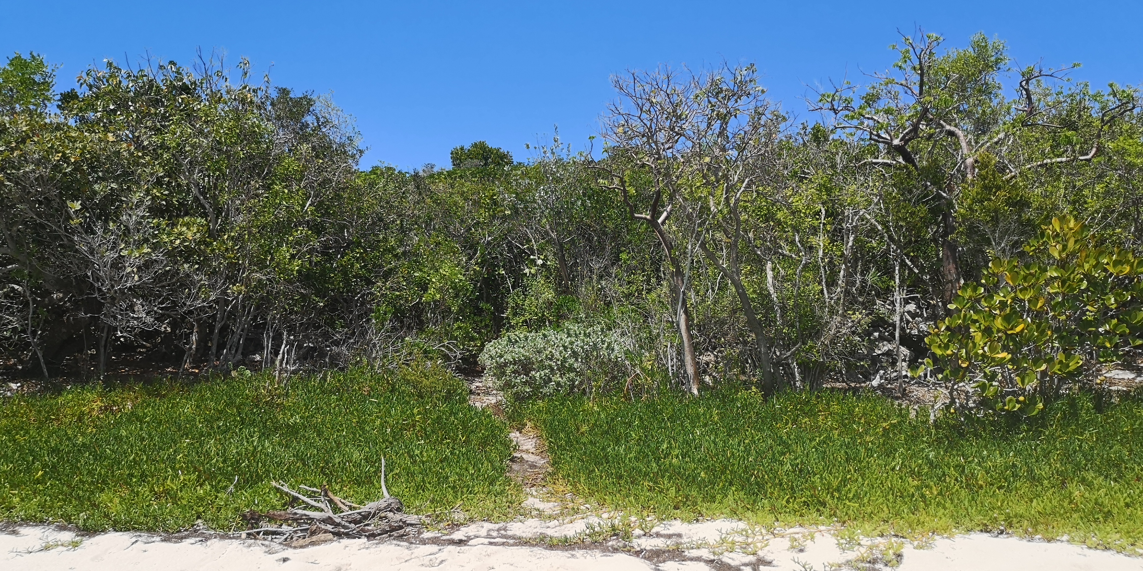 Es gibt zwei Wanderwege zum Blue Hole. Der eine startet am ersten Strand der Hoffman’s Cay (gesehen aus Richtung Saddleback Cay), der zweite am nächsten Strand. Der erste Trail ist etwas eingewachsener und daher schattiger als der zweite.