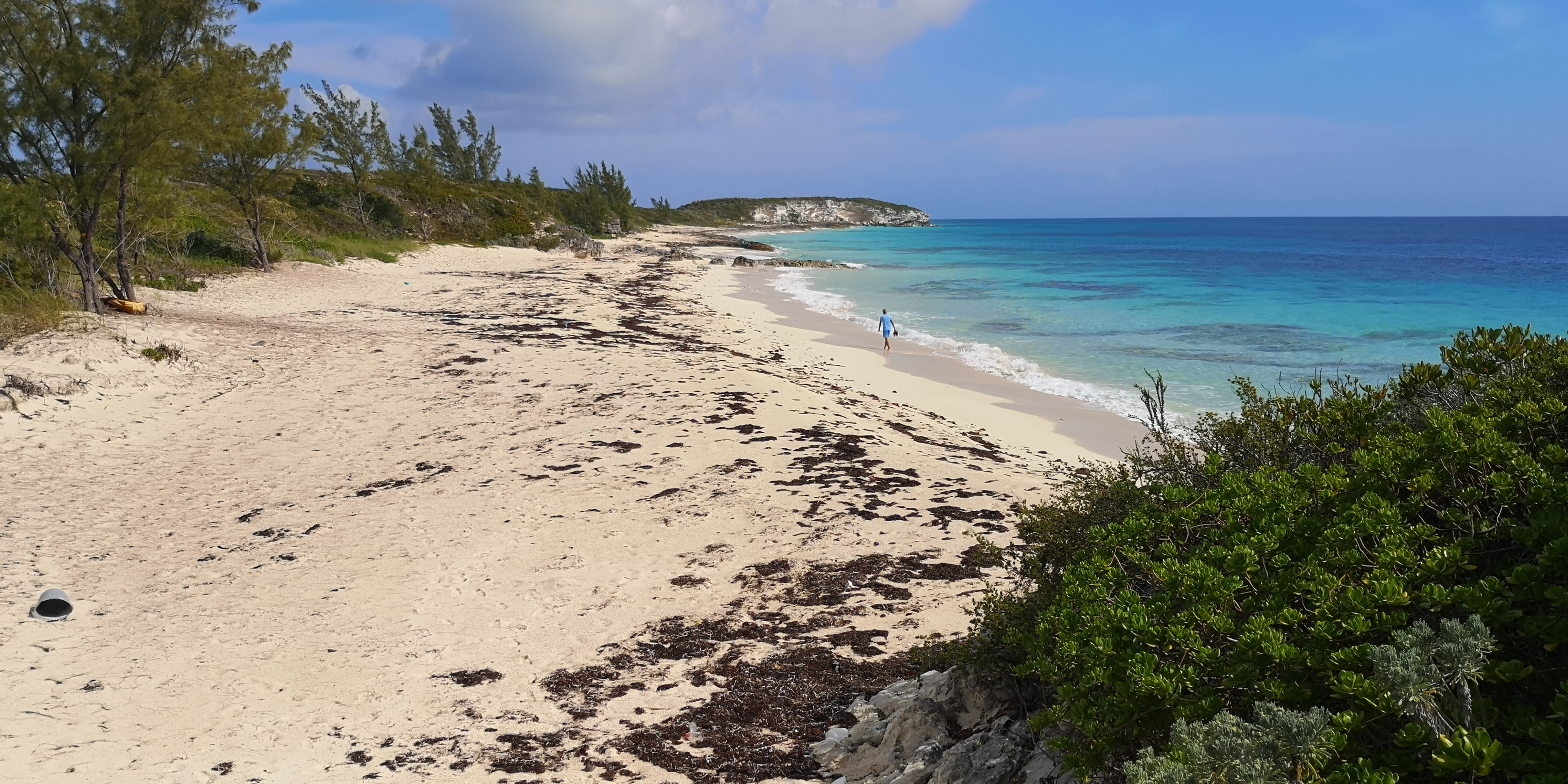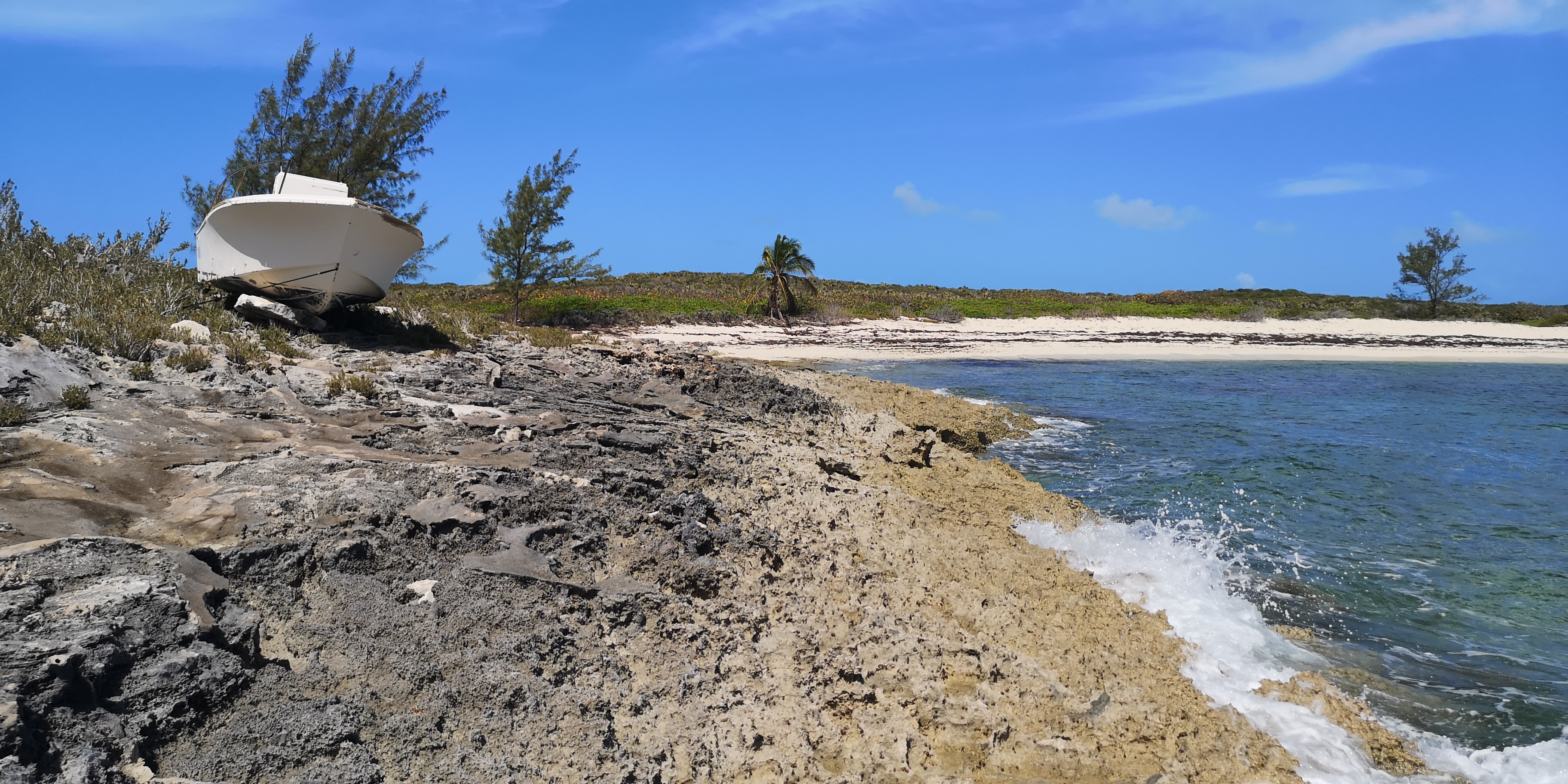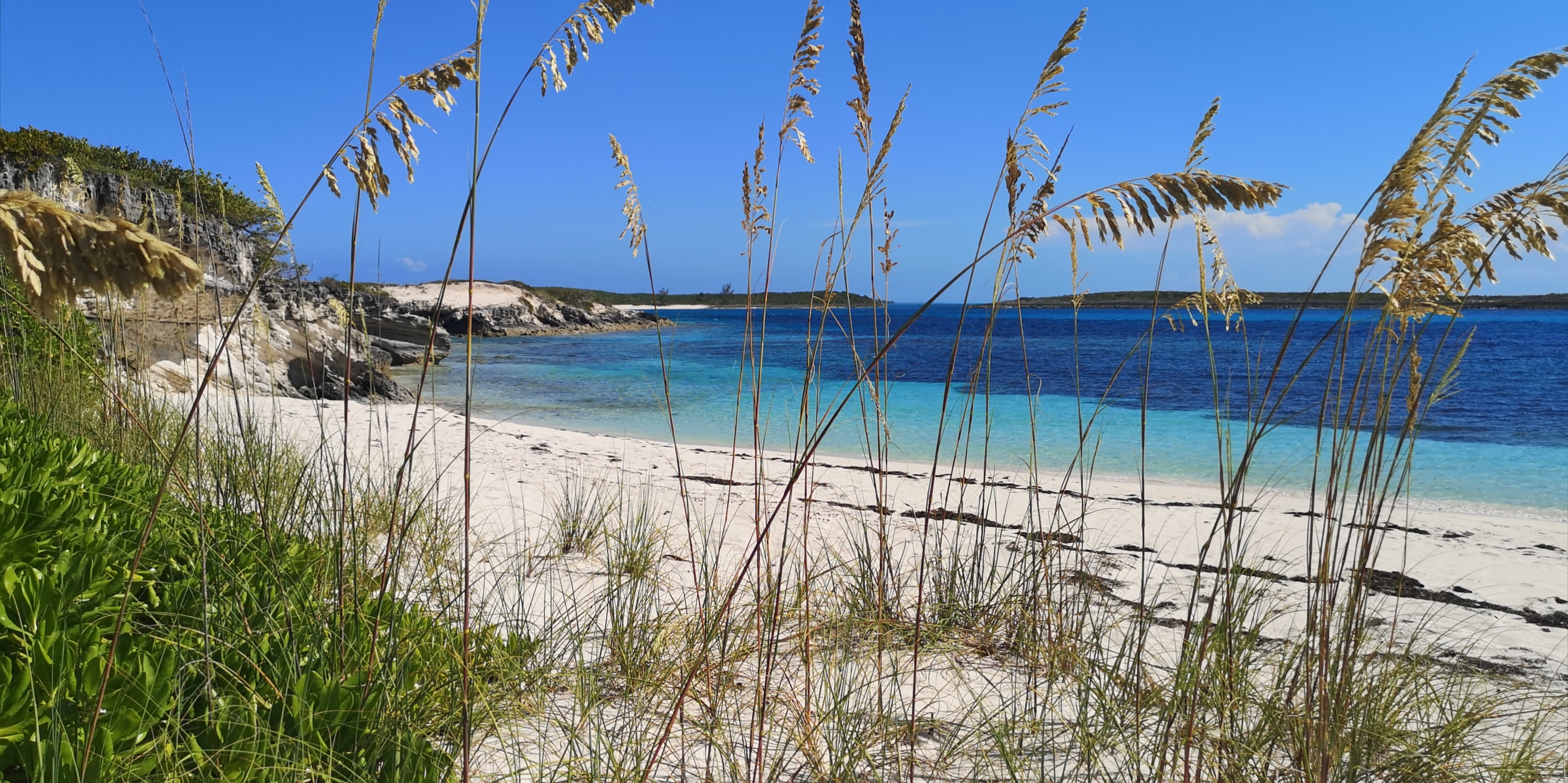Unser 1. Ankerplatz in den Berry Islands liegt hinter Bonds Cay und ist super geschützt: Kein Schwell, keine Welle, kaum Gezeitenstrom. Aber so richtig gefällt er uns nicht. Das Wasser über dem Grasboden ist grün und Betreten der Insel ist nicht gestattet. Denn Bonds Cay ist wie viele der südlichen Berry Islands eine Privatinsel. Sie gehört (laut Wikipedia) der Sängerin Shakira und dem Sänger Roger Waters. Weil die gesamte Insel privat ist, ist auch (anders als sonst) der Strand privat.