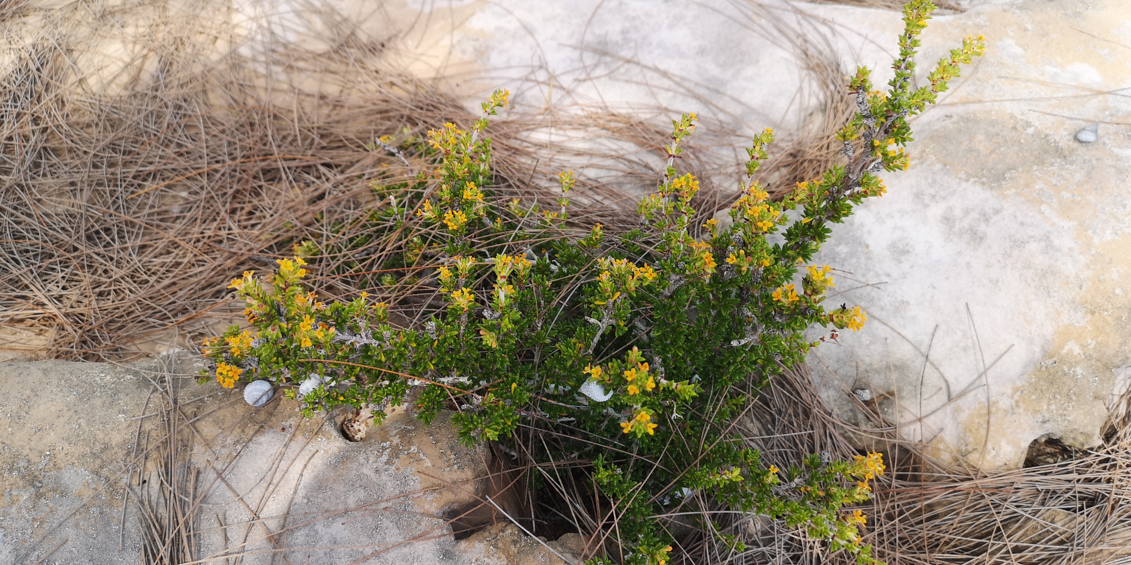 Der markierte Trail startet links davon und führt zu Resten langer Steinmauern.
