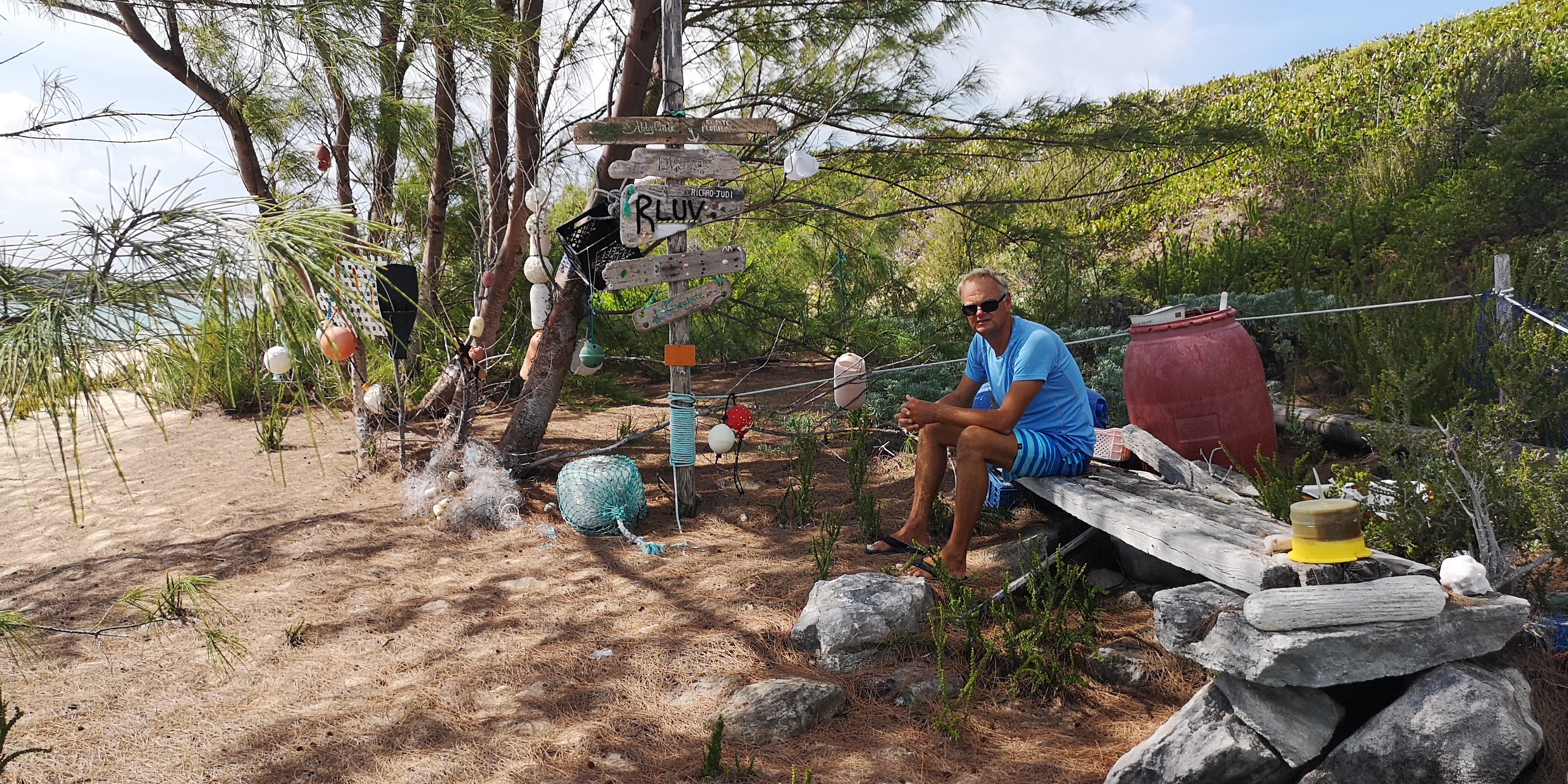 Wir können bisher den Besitzer der einzigen Bar weit und breit auch nicht fragen. Denn selbst für unserDinghy war die Strecke bei mittlerem Wasserstand zu flach. Wir hätten noch weiter fahren und uns von Cabbage Cay aus nähern müssen, lesen wir später. Der sehnsuchtsvolle Blick auf die verlockende Bar in der Ferne mit der Aufschrift „you welcome“ auf dem Dach muss zunächst mal reichen.