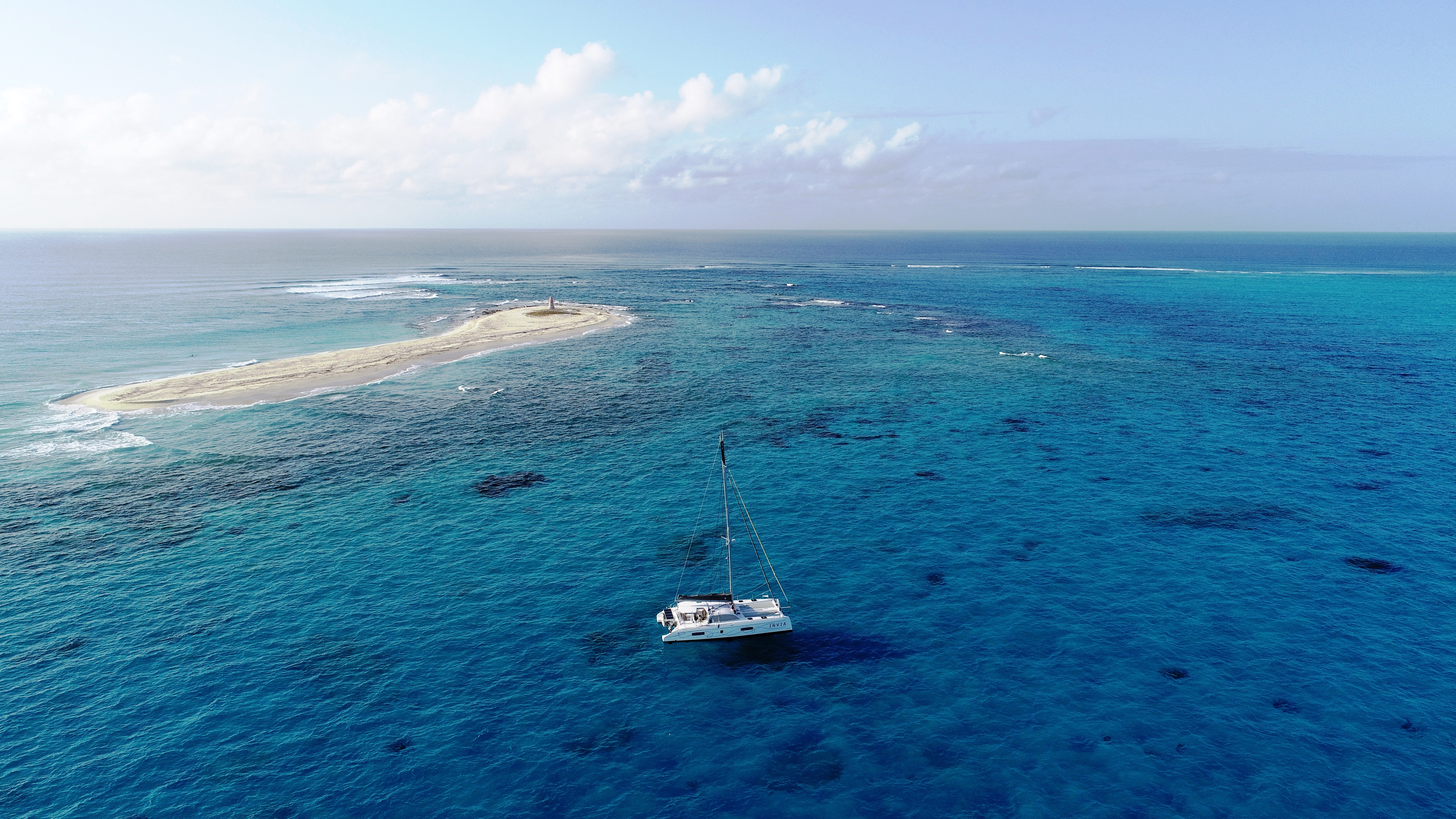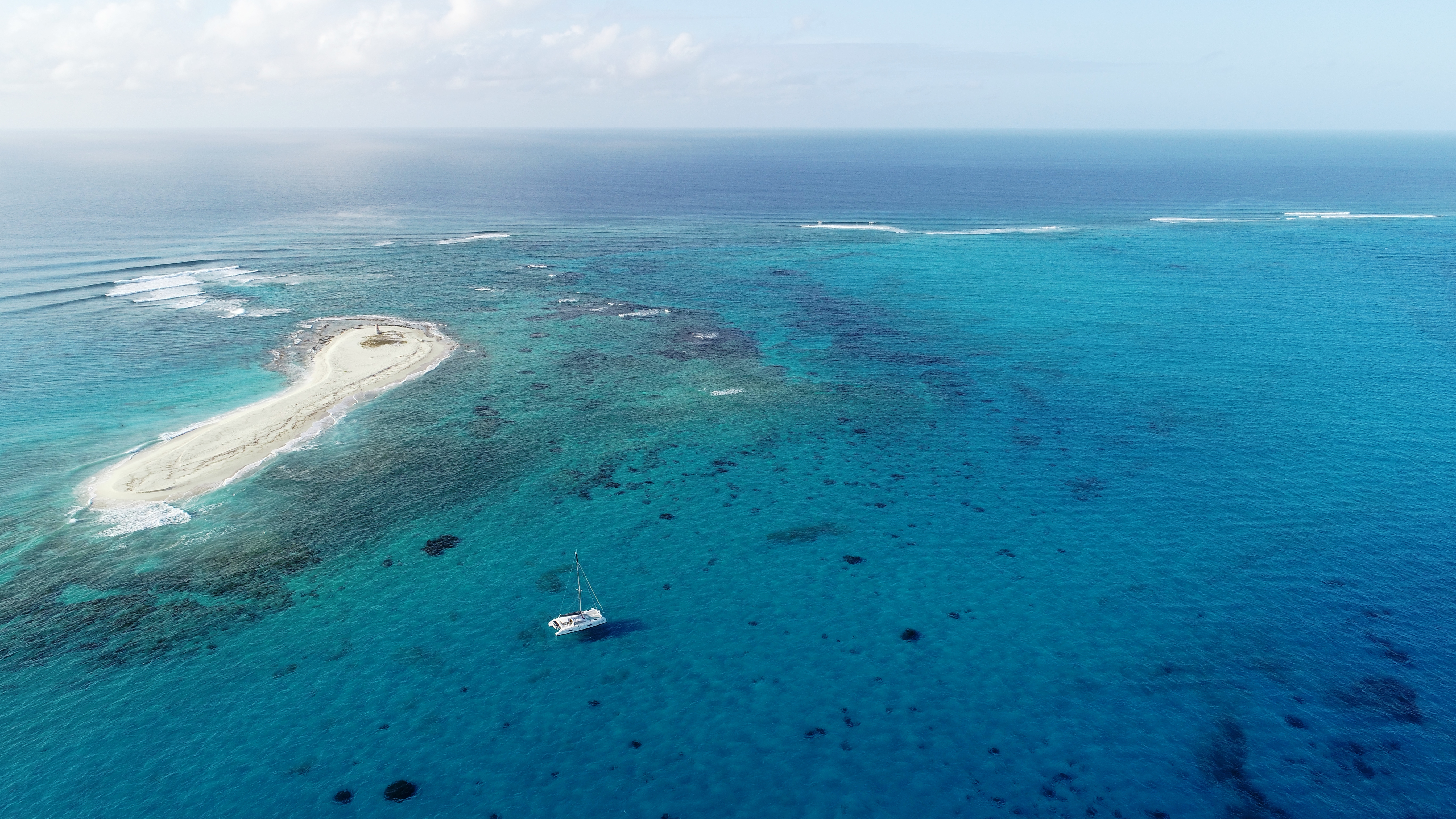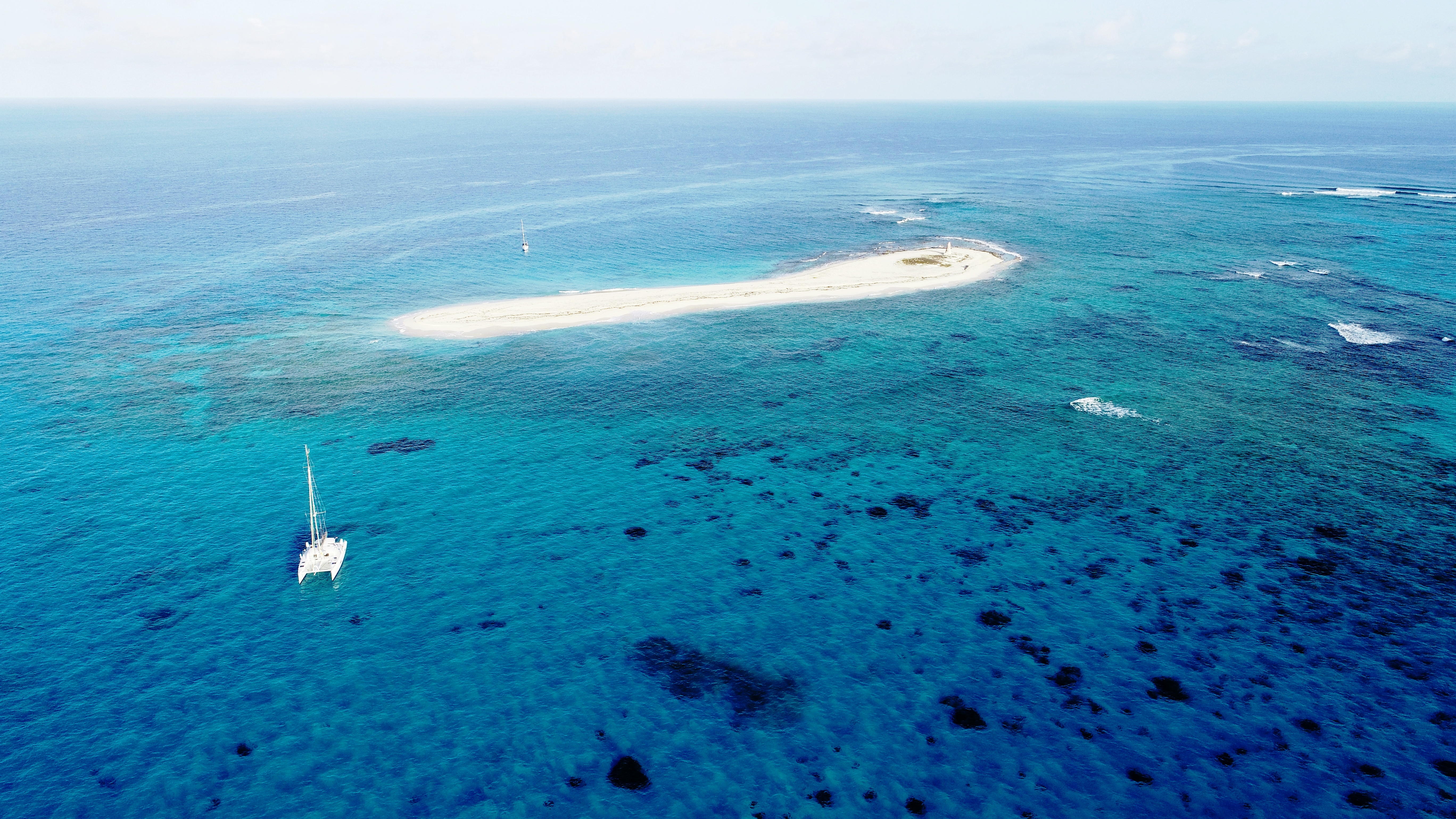 Wir fahren ganz hinein. Innerhalb des Atoll-Rings ist das Wasser glasklar. Man sieht jeden Felsbrocken, jeden Korallenkopf – obwohl es idR etwa mindestens 7m Tiefe hat. Wir gehen bis kurz vors Ostende des Atoll-Rings und legen uns dort über einer Sandbank vor Anker. Lassen die Drohne steigen, um ein paar Bilder zu schießen.