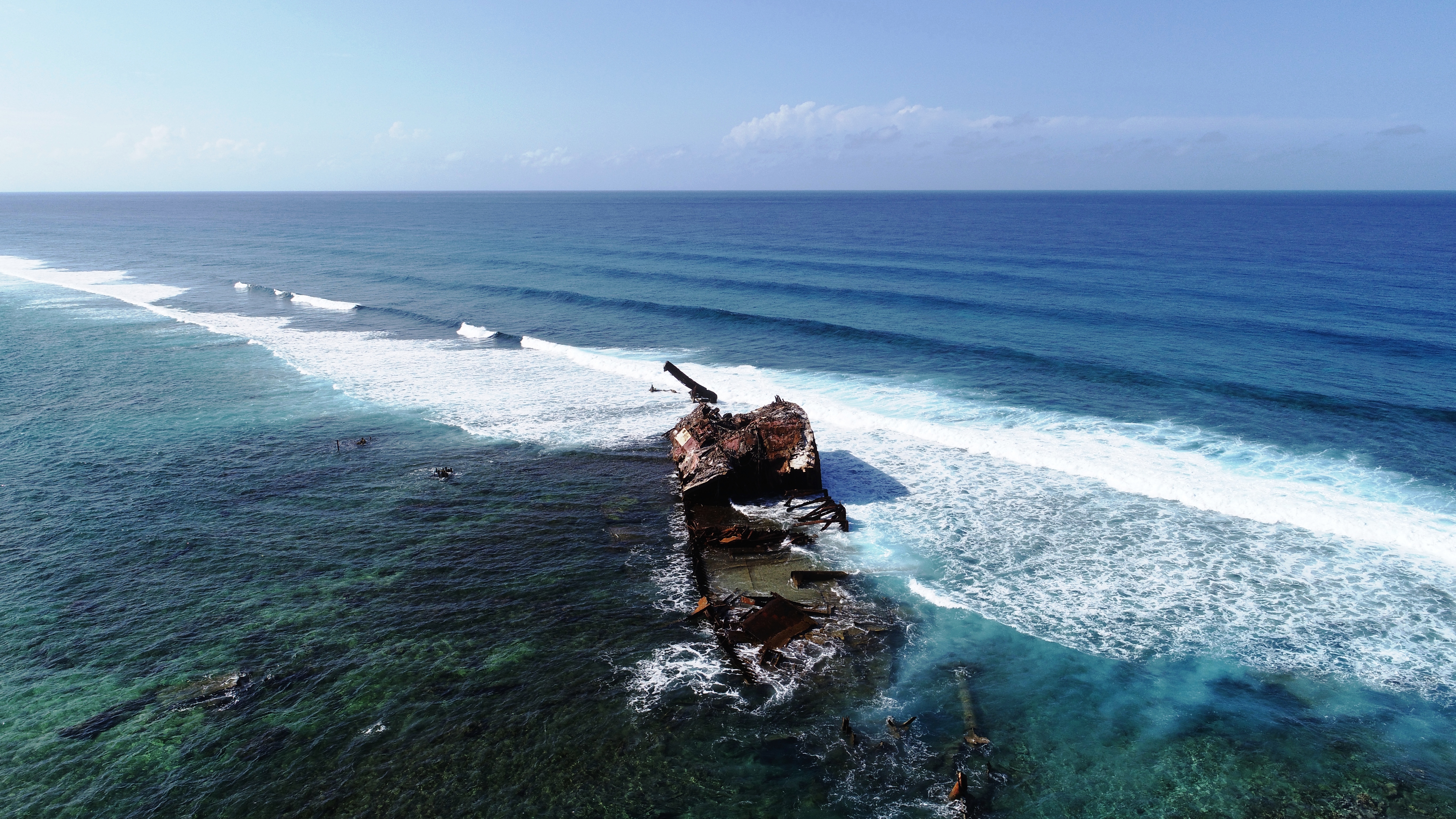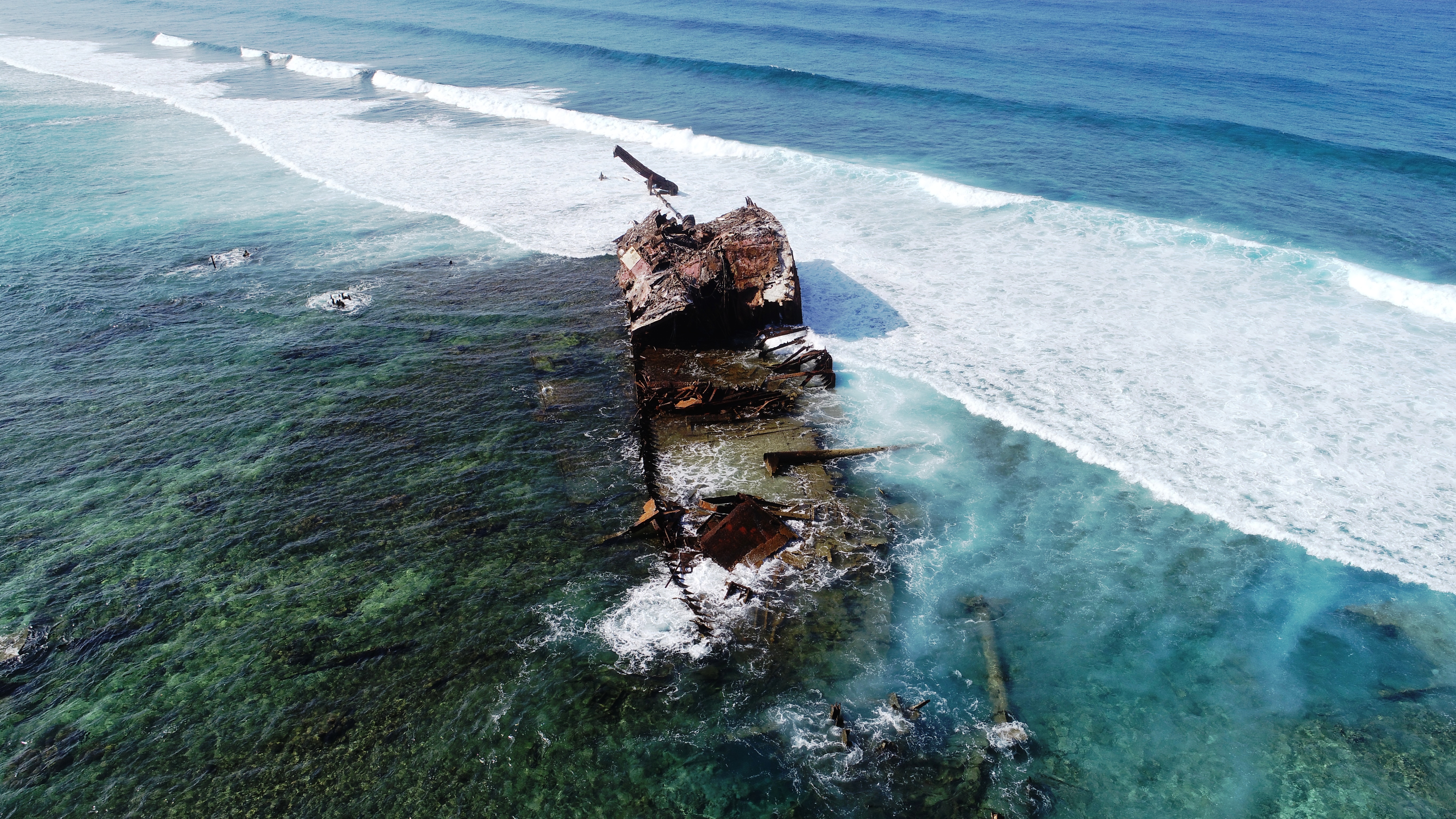 Bei der Annäherung sieht man als erstes das Wrack eines 1963 hier auf Grund gelaufenen Schiffes. Aus der Ferne dachten wir zuerst, hier ragt ein nicht kartographierter einzelner Felsen aus dem Wasser. Erst später erkennt man die Brandung rund um das Riff und nimmt wahr, dass es etwas anderes als Fels sein muss.