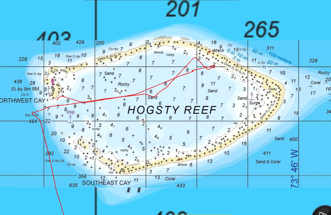 Wir planen, den Test am Tag 5 auf Crooked Islands zu absolvieren. Nach der 2. Nacht, unserem Tag 3 auf den Bahamas, brechen wir auf, denn wir wollen nicht 5 Tage vor Great Ingua bleiben. Zum Hogsty Reef, das auf dem Weg liegt.