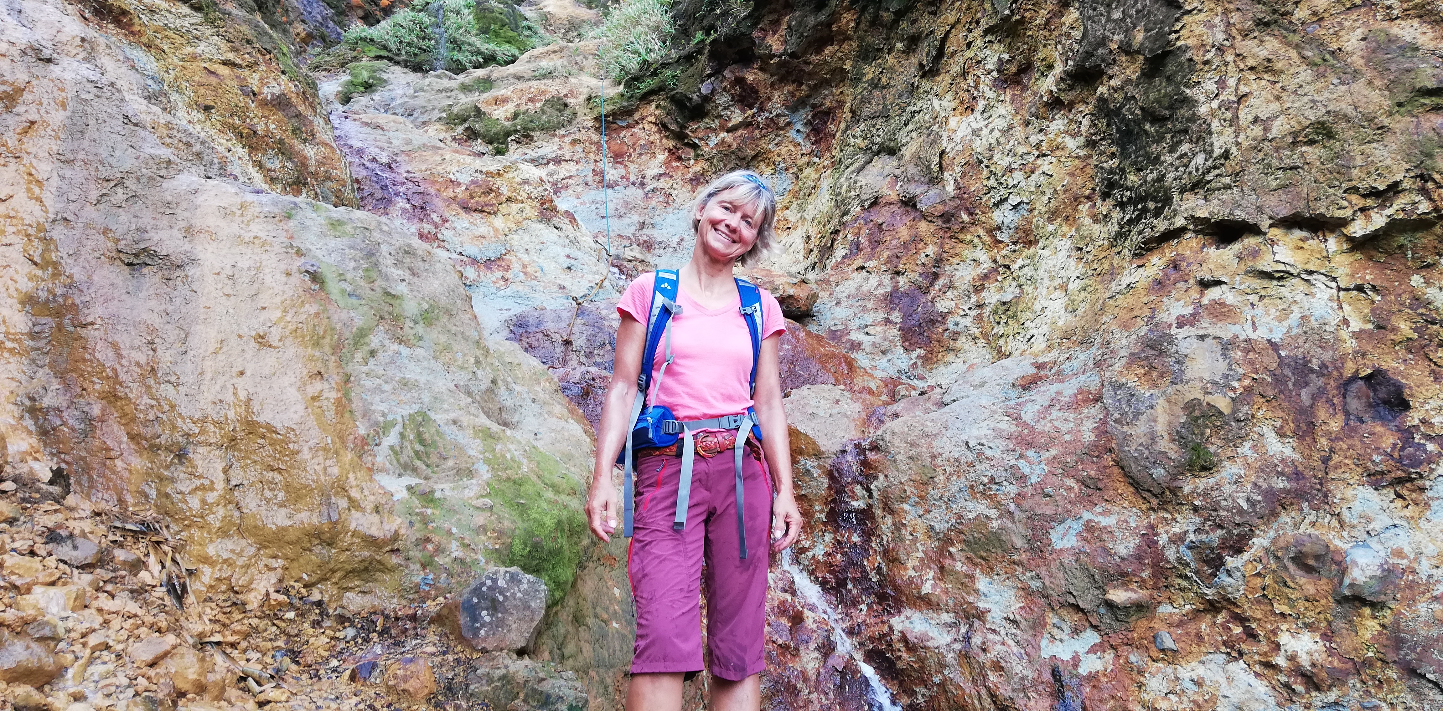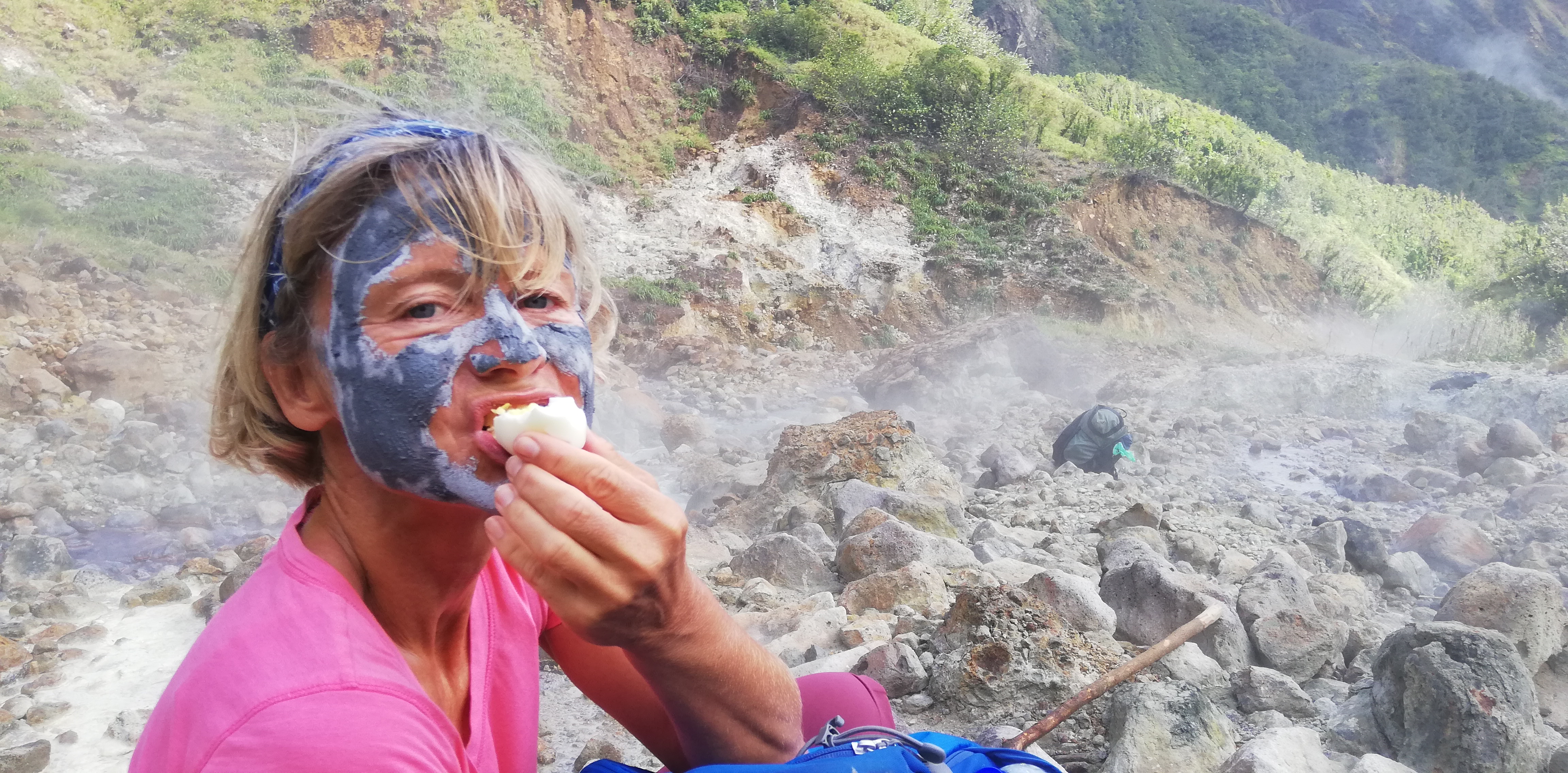 Mittagessen am boiling lakeEines der vielen Naturbäder, wahlweise heiss (wenn aus einer heissen Quelle) oder lauwarm (wenn Quellwasser vermischt mit Wasser aus einer heissen Quelle)In einem der vielen Naturbäder wird endlich die Maske abgewaschen