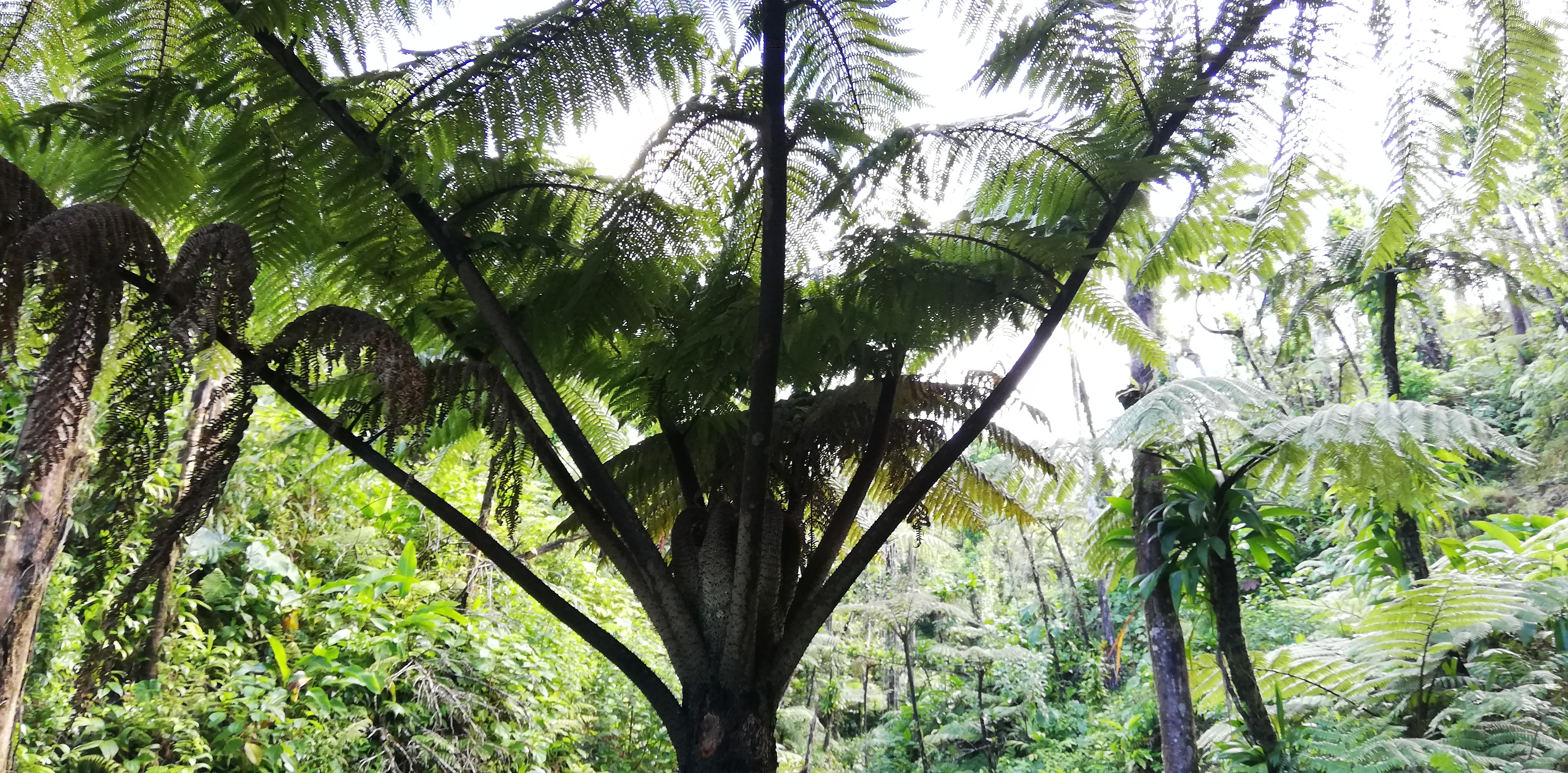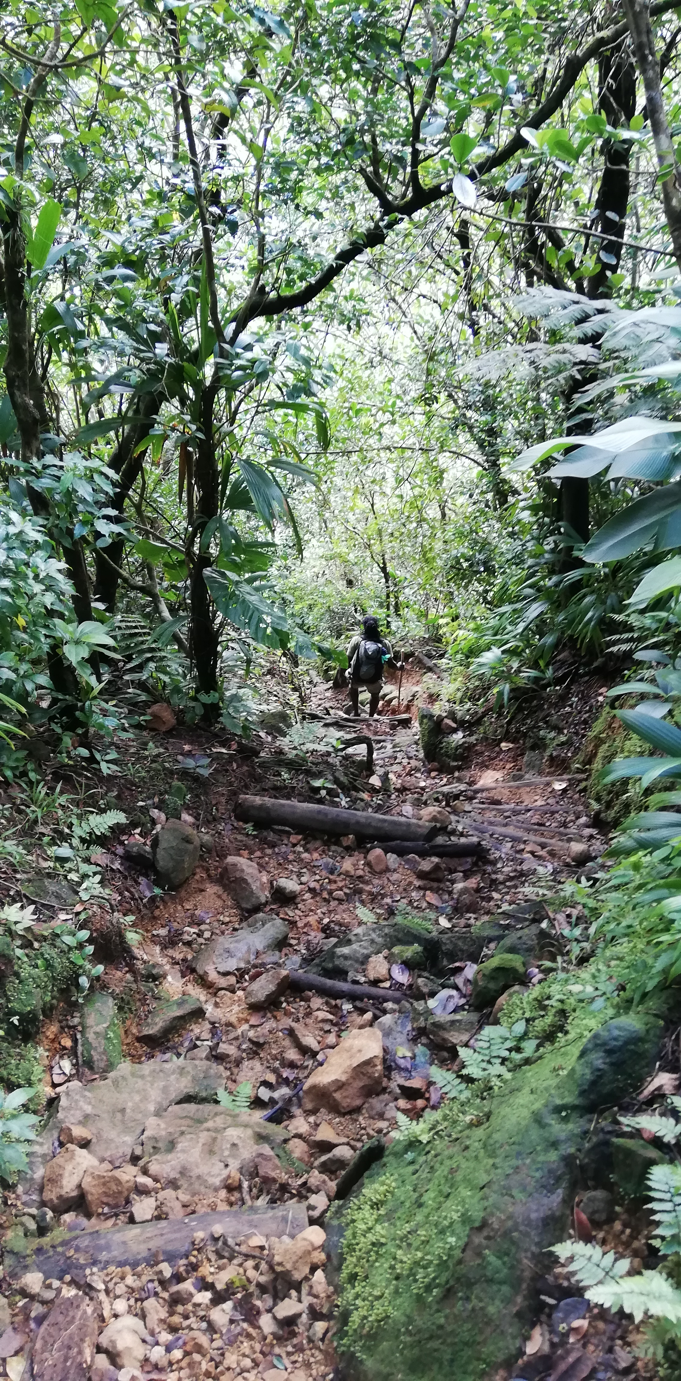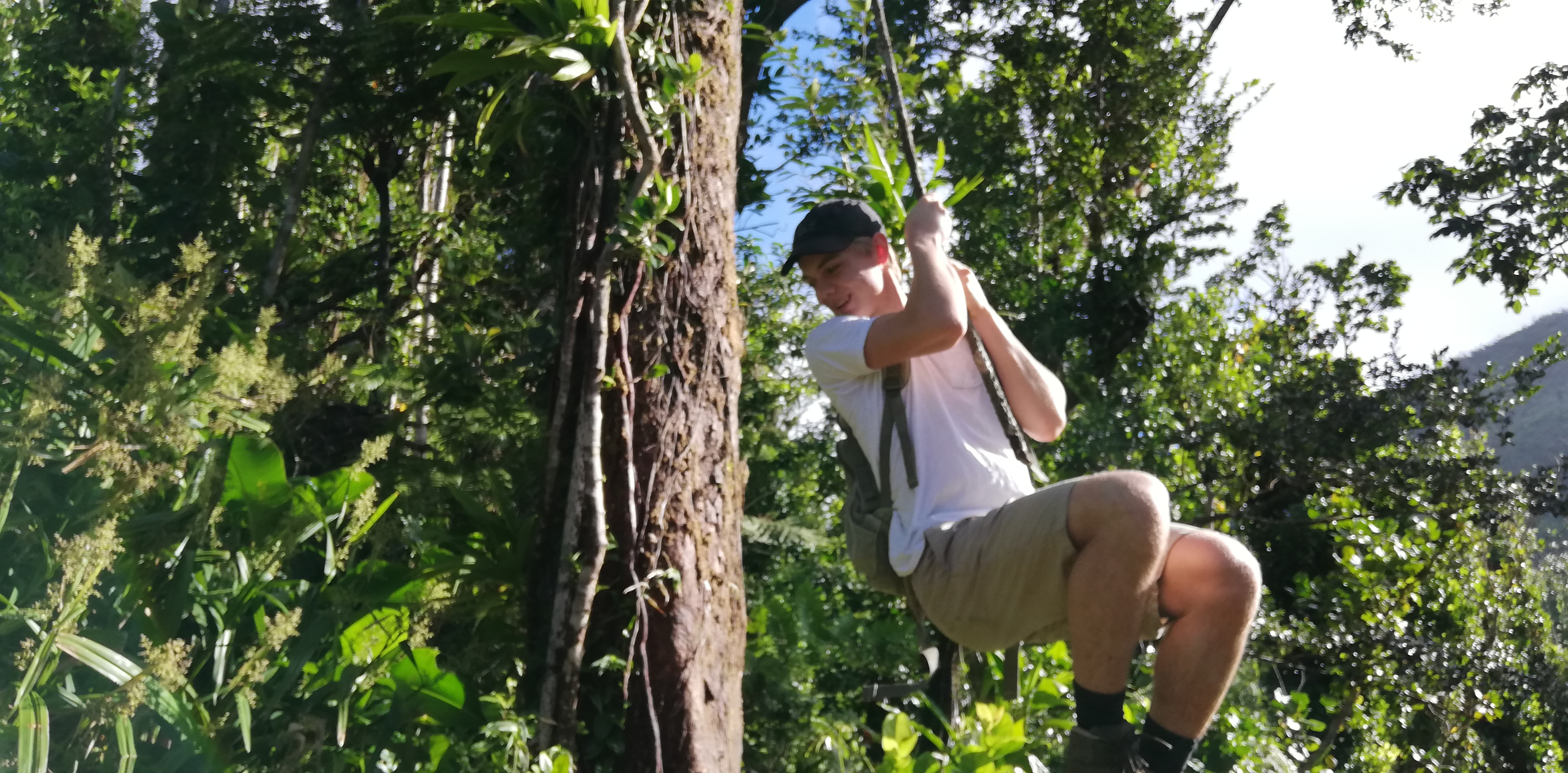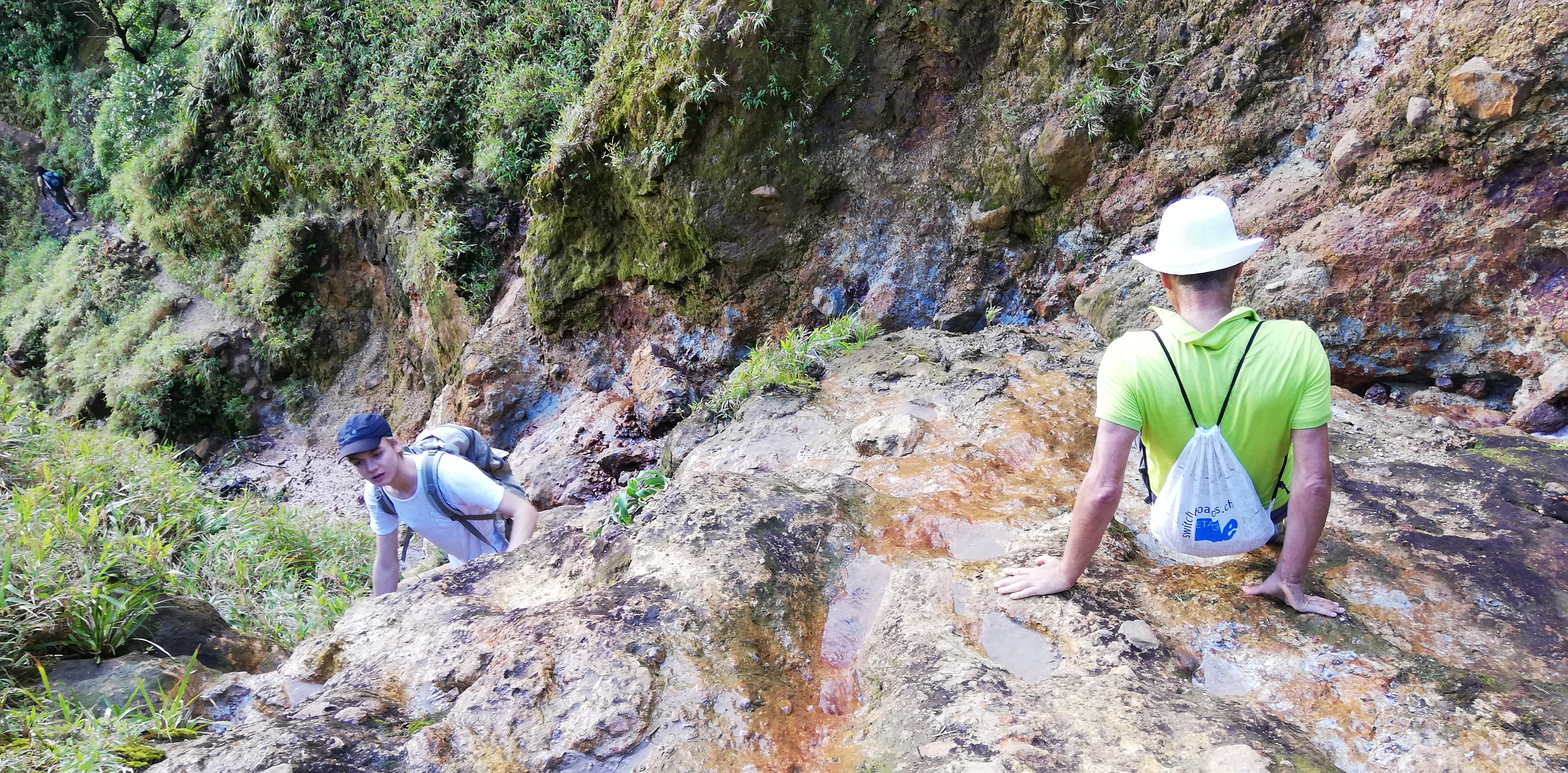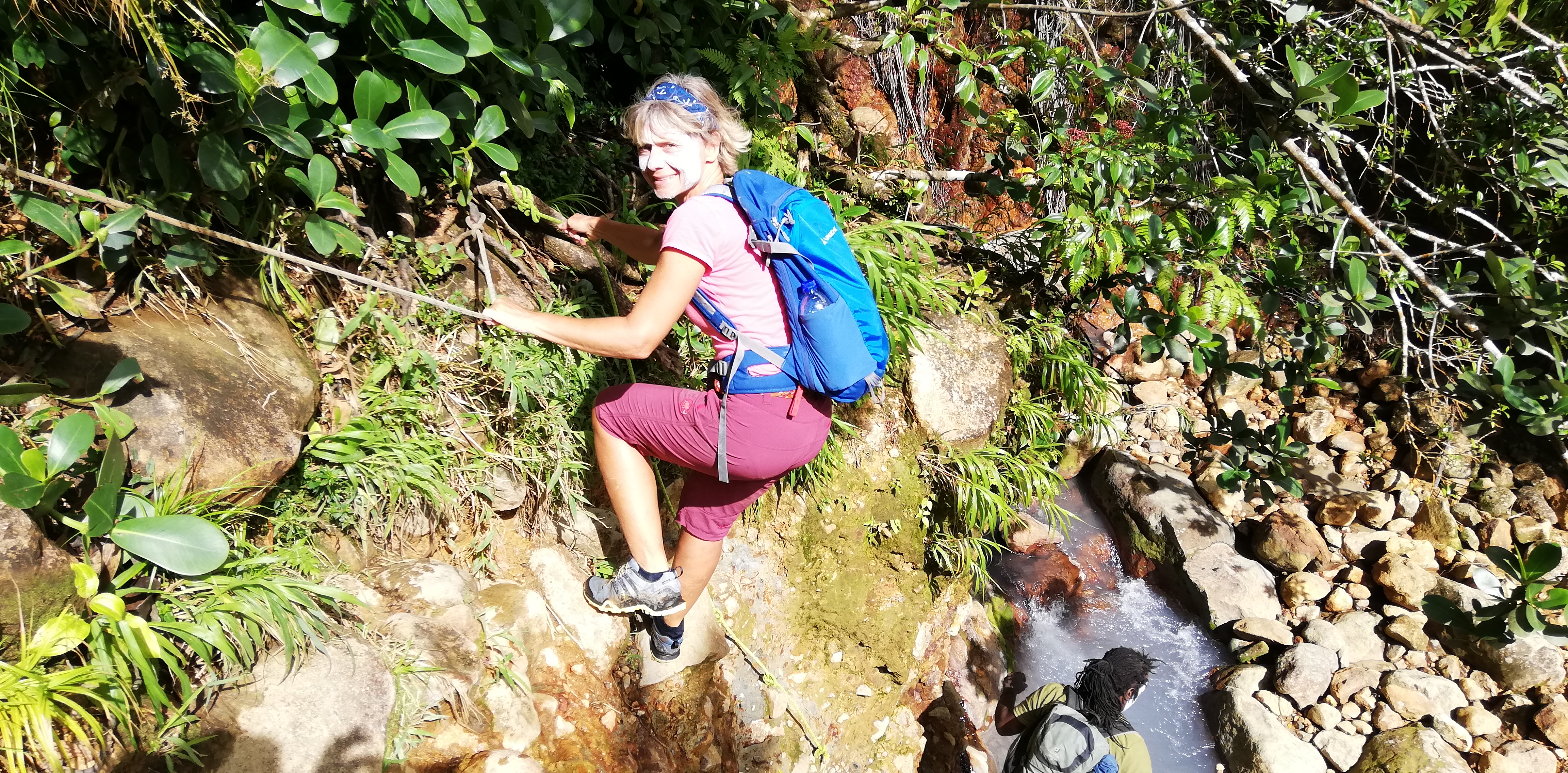 Wir könnten den Weg zwar alleine gehen, auch wenn der Trail an manchen Stellen, gerade bei den Flussüberquerungen, nicht immer leicht zu erkennen ist. Aber wir buchen SeaCat als Guide. Er arbeitet seit 20 Jahren als Tourguide und kennt Land, Natur und Leute. Auf dem Trail zeigt er uns etliches an Pflanzen und die großen Veränderungen, die der Hurrikan von 2017 geschaffen hat. Er hat ein karibisch fröhliches Gemüt, geht sehr flott und verkürzt mit seinen Hinweisen die Aufstiegsmühen. Denn immer wieder heißt es über Stufen und Felsen rauf, dann oft glitschig und teils am Seil wieder runter- und danach, genau, das Gleiche wieder. Im heißen Thermalwasser kocht er für uns Eier, reibt nicht nur uns, sondern auch sich selbst das Gesicht mit Mineralerde ein und serviert am Boiling Lake ein leckeres Mittagessen mit frisch geschnittenem Salat, Fischsalat und gebratenen Kochbananen. Gut geht es uns bei ihm.
