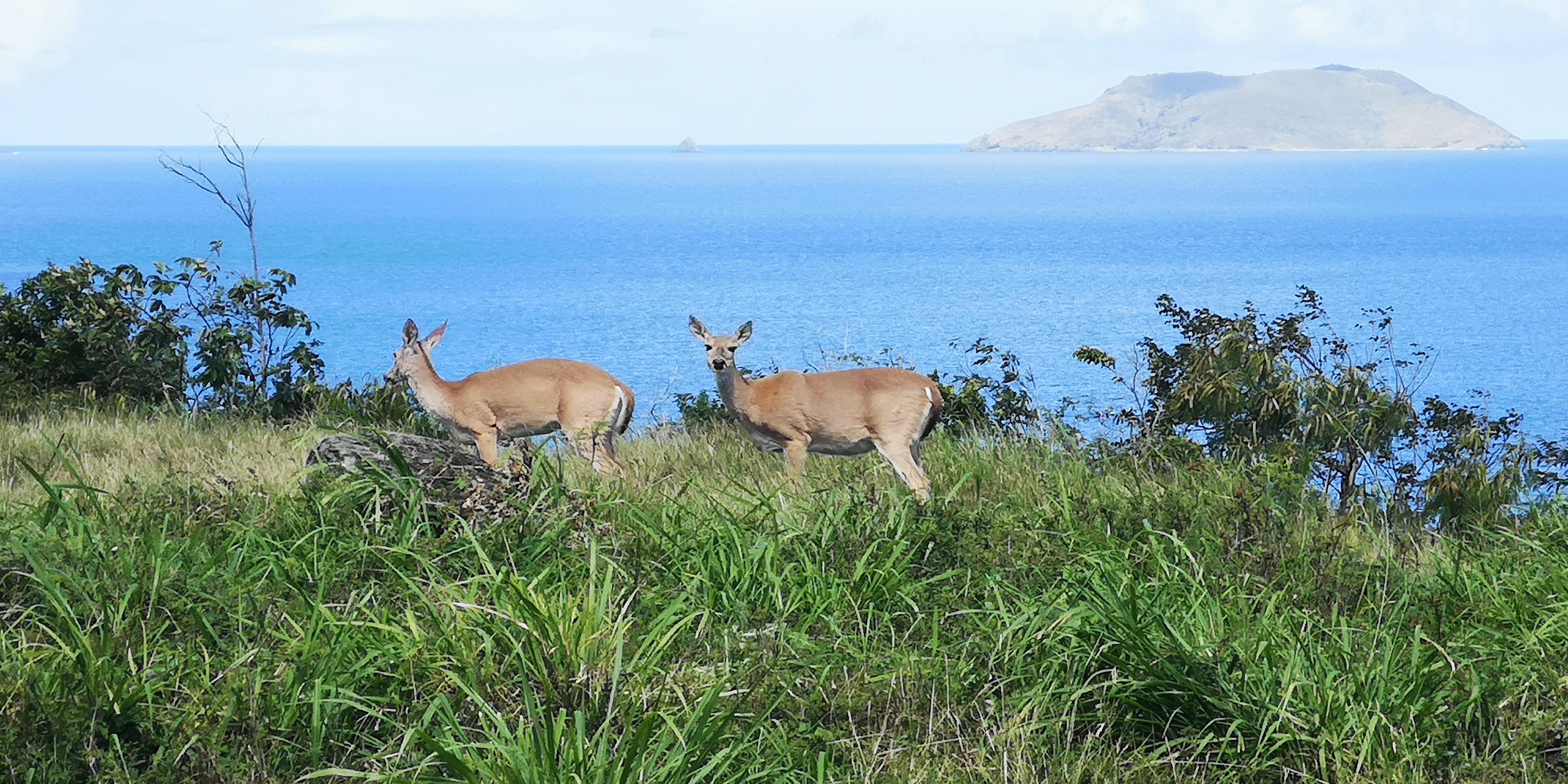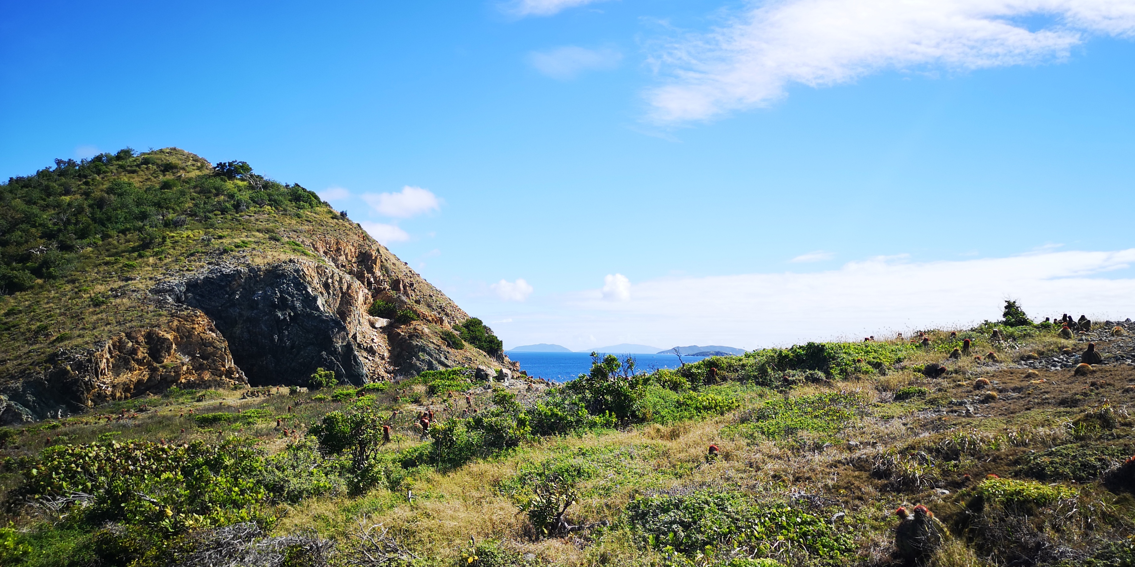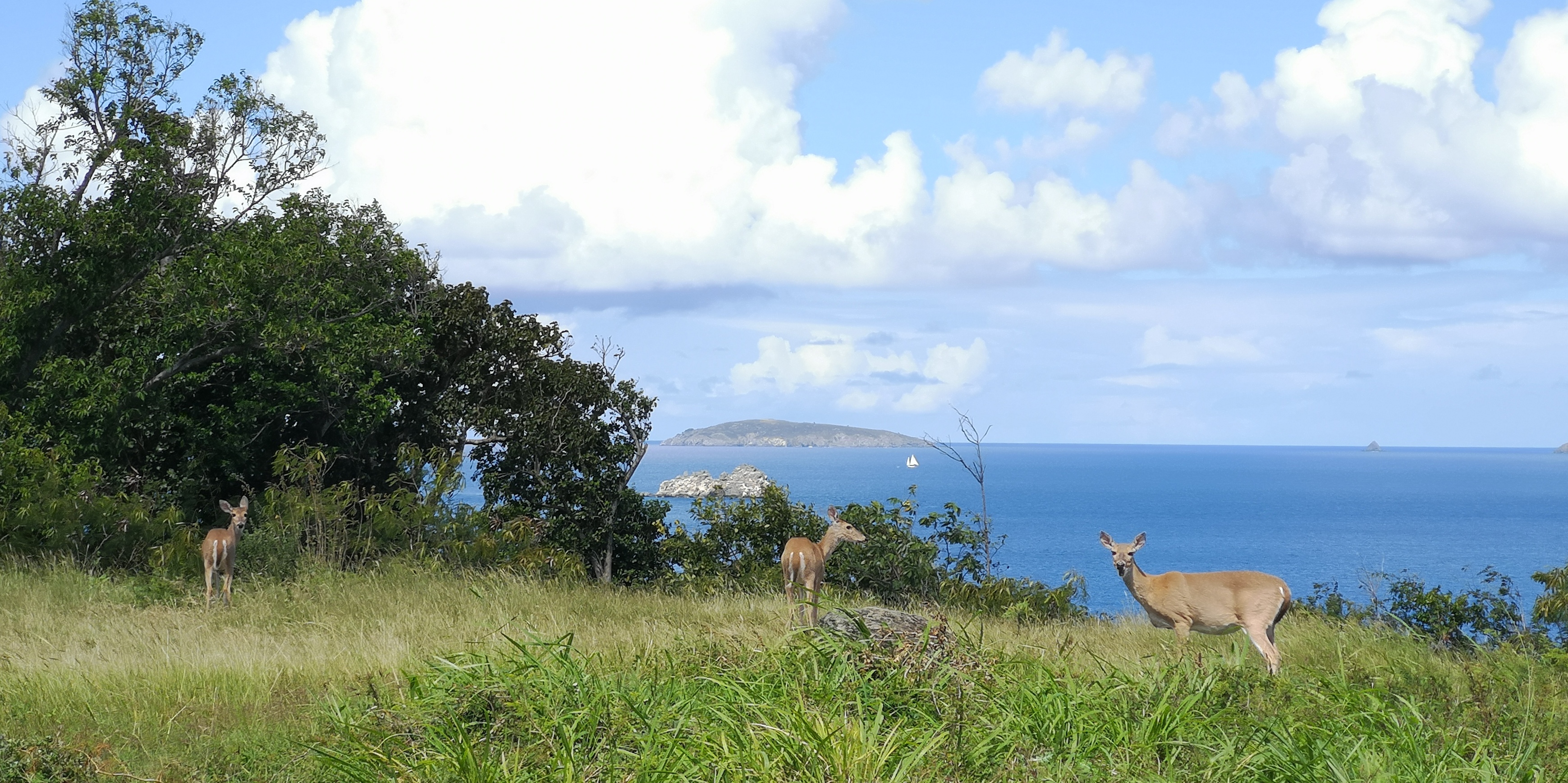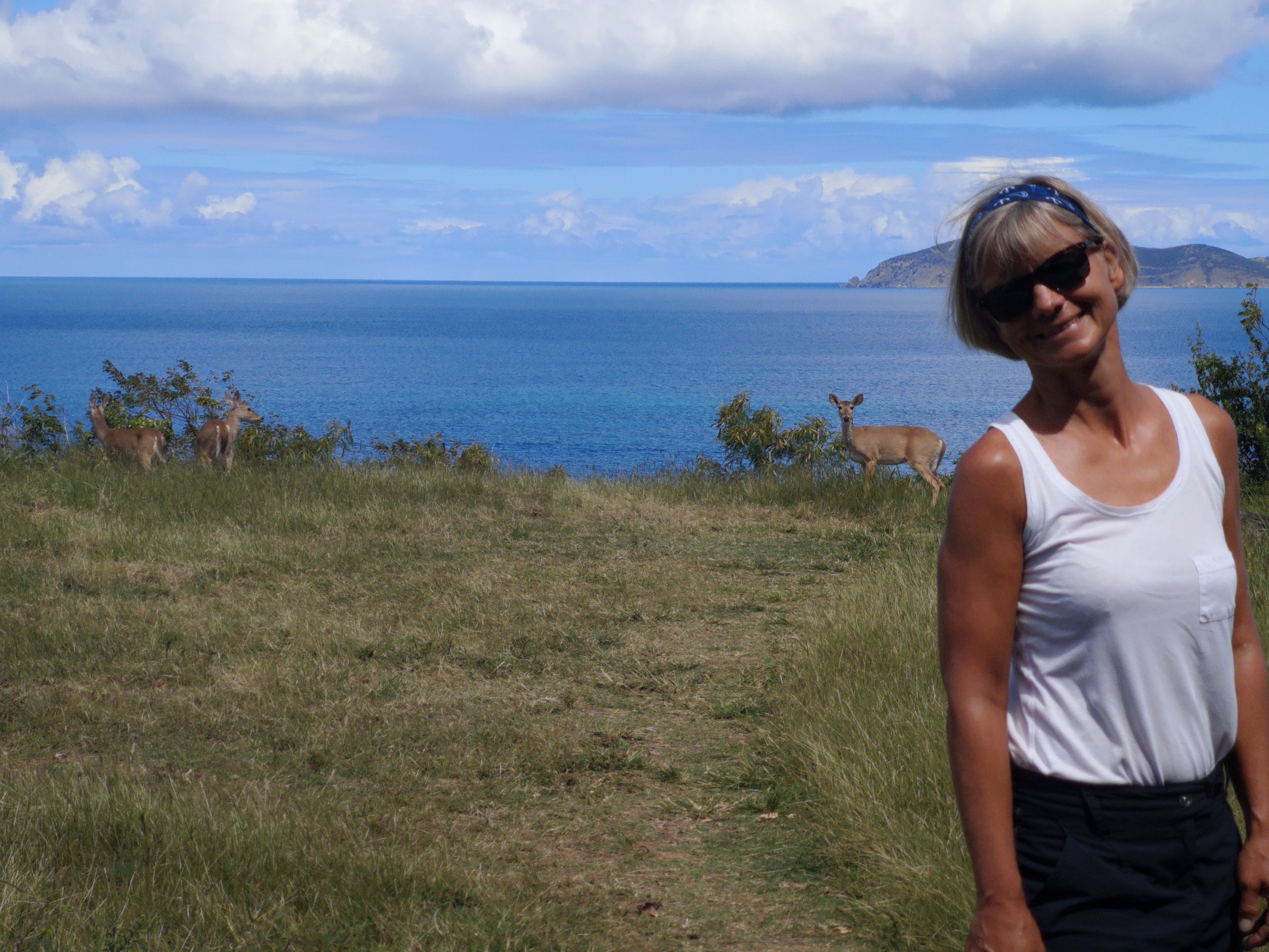 Besonders gefallen uns die Hawksnest Bay und der Spaziergang hoch zur Ruine der Mühle einer Zuckerrohrplanrage, sowie weiter zum Nachbarstrand. Sogar rehähnliche Tiere schauen uns auf der Wiese beim Mühlenturm an. Das Schnorcheln am Riff vor dem rechts gelegenen der beiden Strände in der Bucht ist schön. In der Bucht gibt es keine Zahlstelle für die Boje. Man müsste zum Zahlen per Dinghy in eine Nachbarbucht. Kontrolliert hat dort niemand.