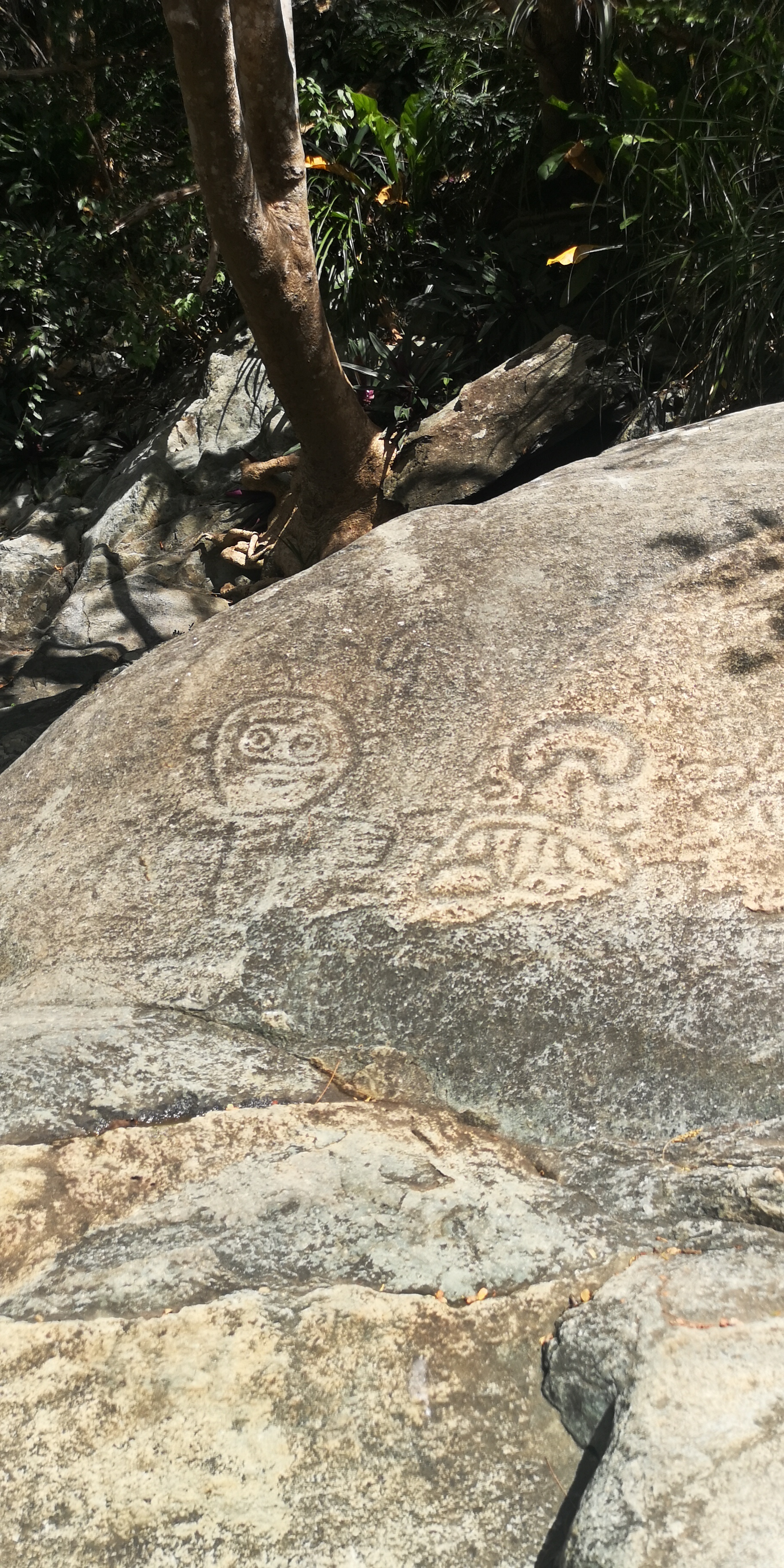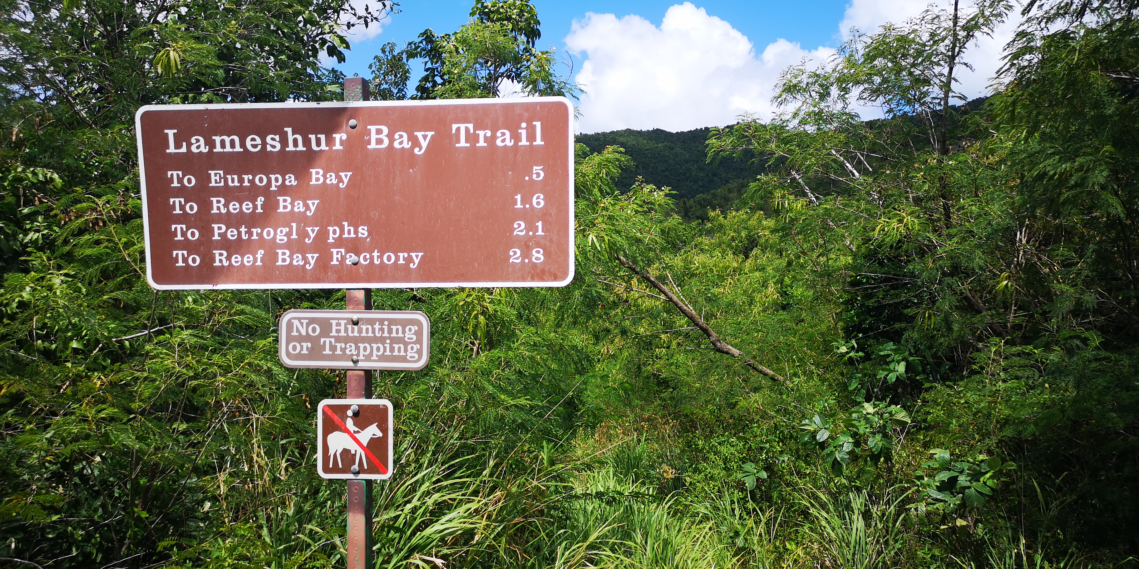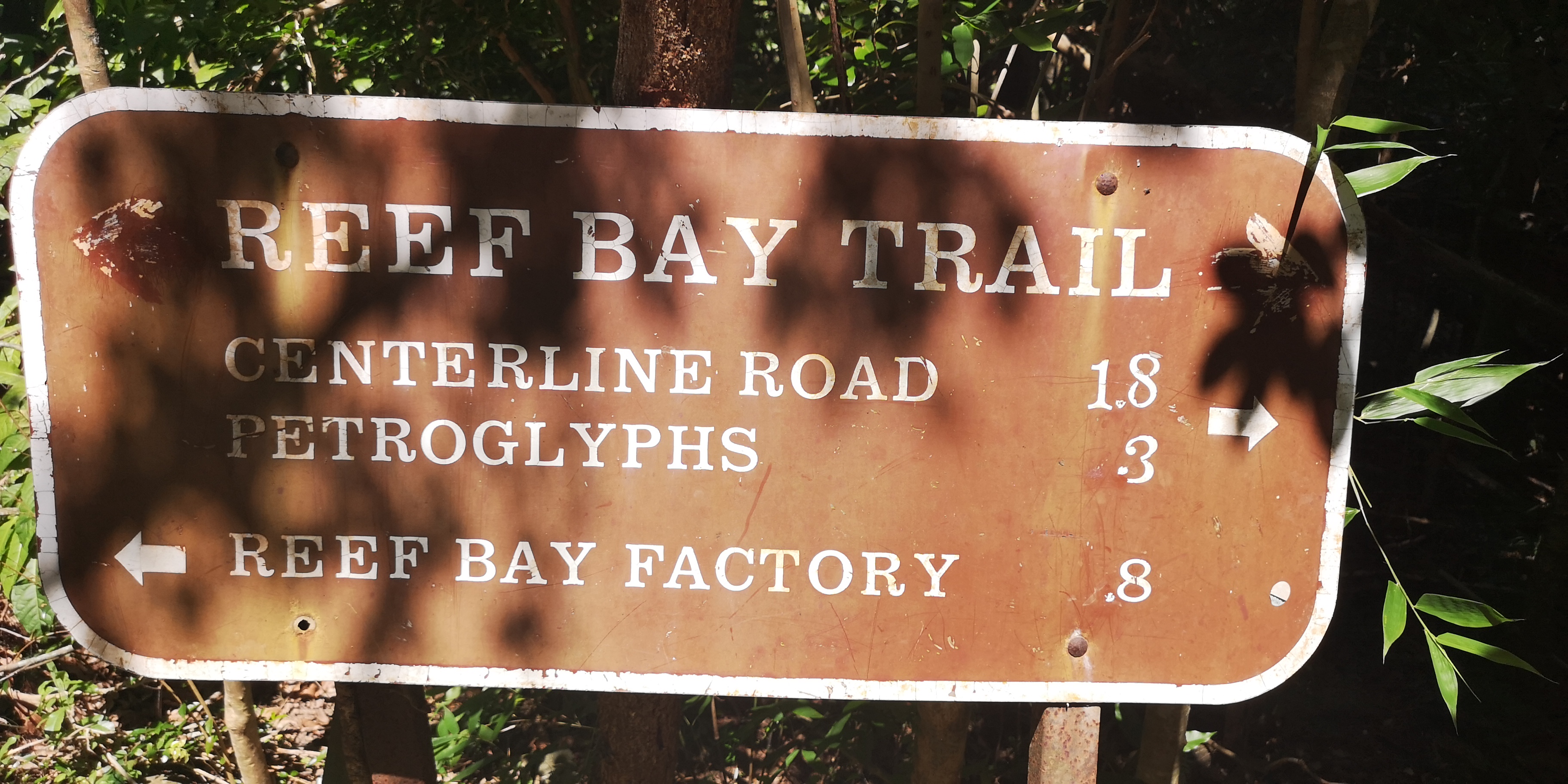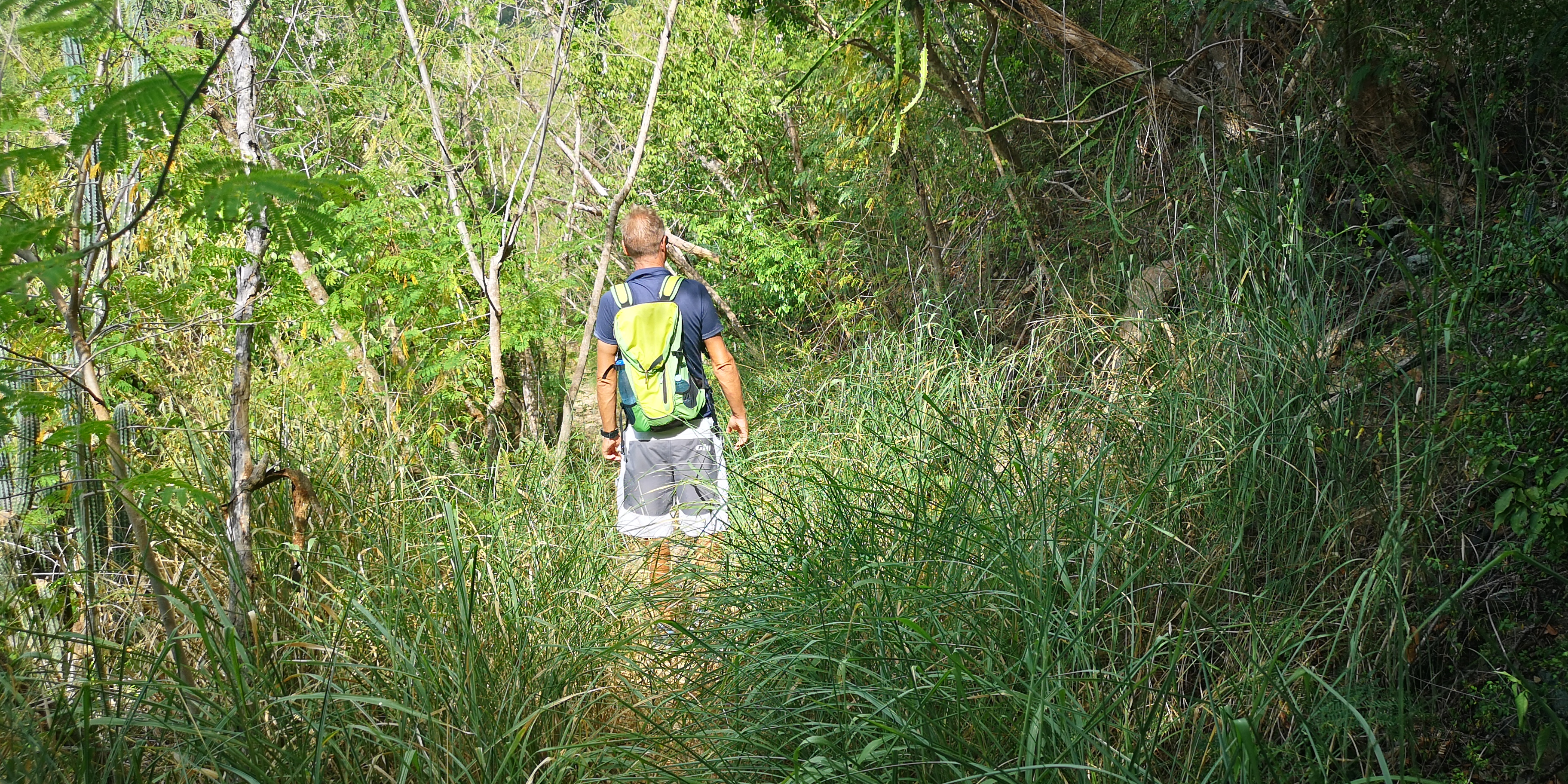 Die Wanderwege von der Lameshur Bay sind teils eingewachsen mit scharfkantigen Gräsern und dornigem Gestrüpp. Moskitos ärgern. Proviant gibt es nirgends zu kaufen. Was so wenig einladend klingt ist doch toll. Die Wege gewähren Einblicke in die Zeiten des Zuckerrohranbaus, von denen heute Ruinen der Plantagen zeugen. Heiß muss die Arbeit gewesen sein, wir schwitzen sehr beim Laufen. Der Petroglyph Trail führt zu Steinbildern der Ureinwohner, der Taino.