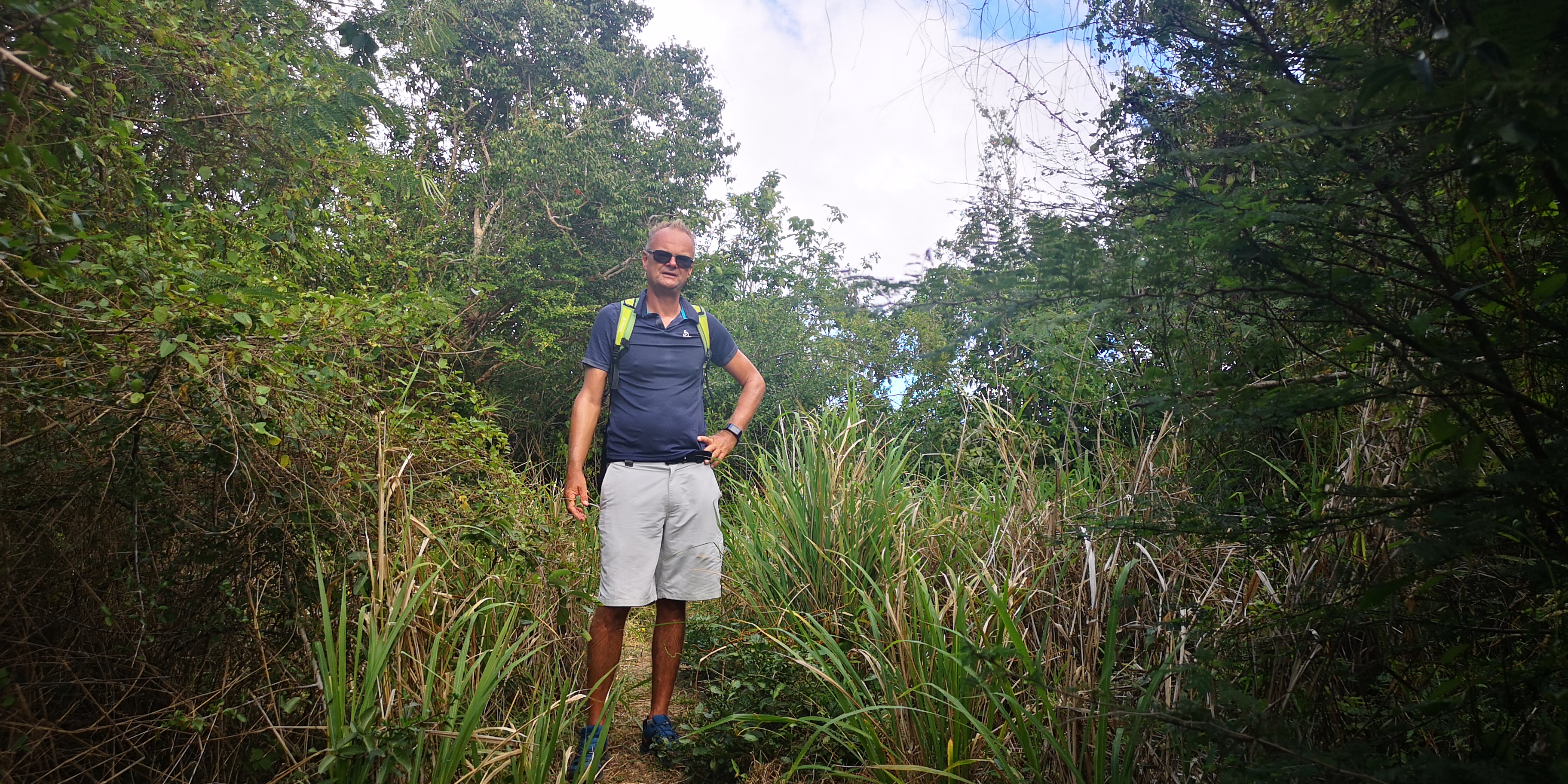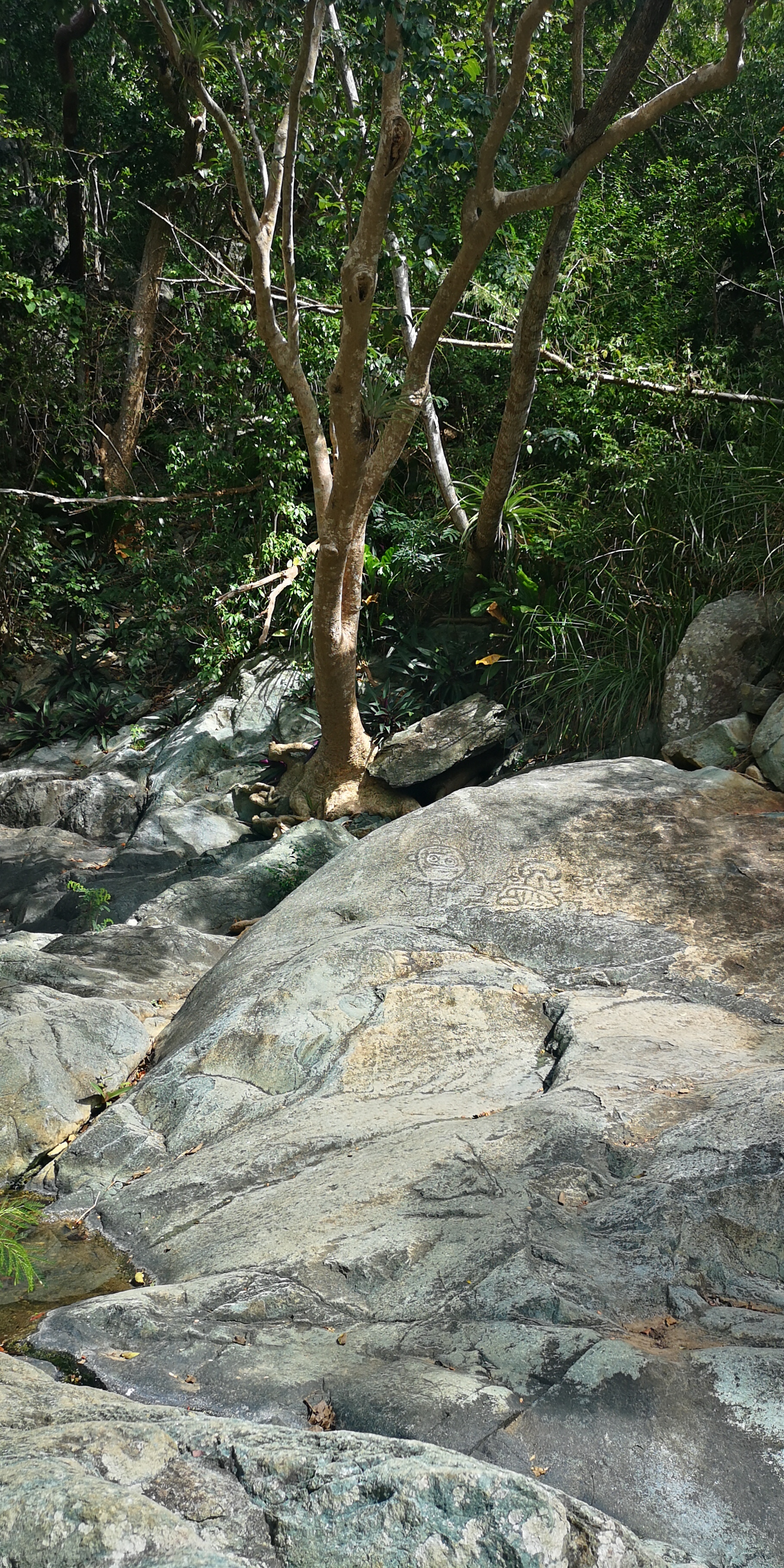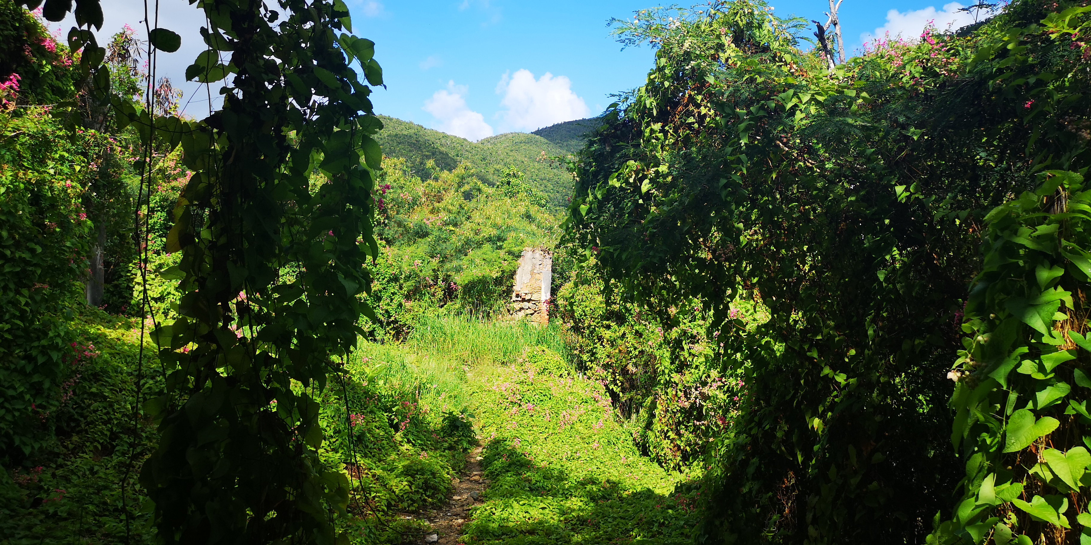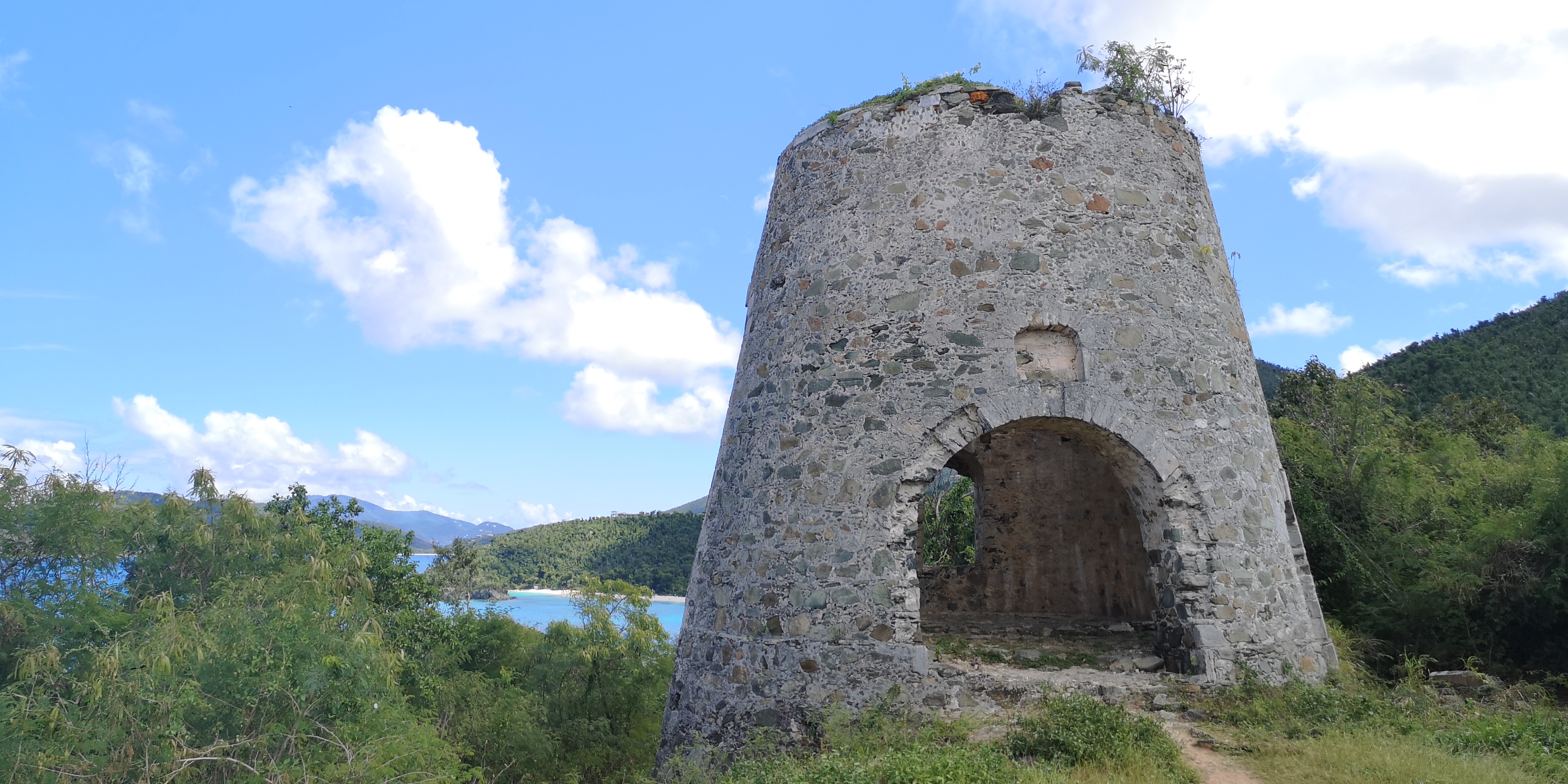Die Wanderwege von der Lameshur Bay sind teils eingewachsen mit scharfkantigen Gräsern und dornigem Gestrüpp. Moskitos ärgern. Proviant gibt es nirgends zu kaufen. Was so wenig einladend klingt ist doch toll. Die Wege gewähren Einblicke in die Zeiten des Zuckerrohranbaus, von denen heute Ruinen der Plantagen zeugen. Heiß muss die Arbeit gewesen sein, wir schwitzen sehr beim Laufen. Der Petroglyph Trail führt zu Steinbildern der Ureinwohner, der Taino.