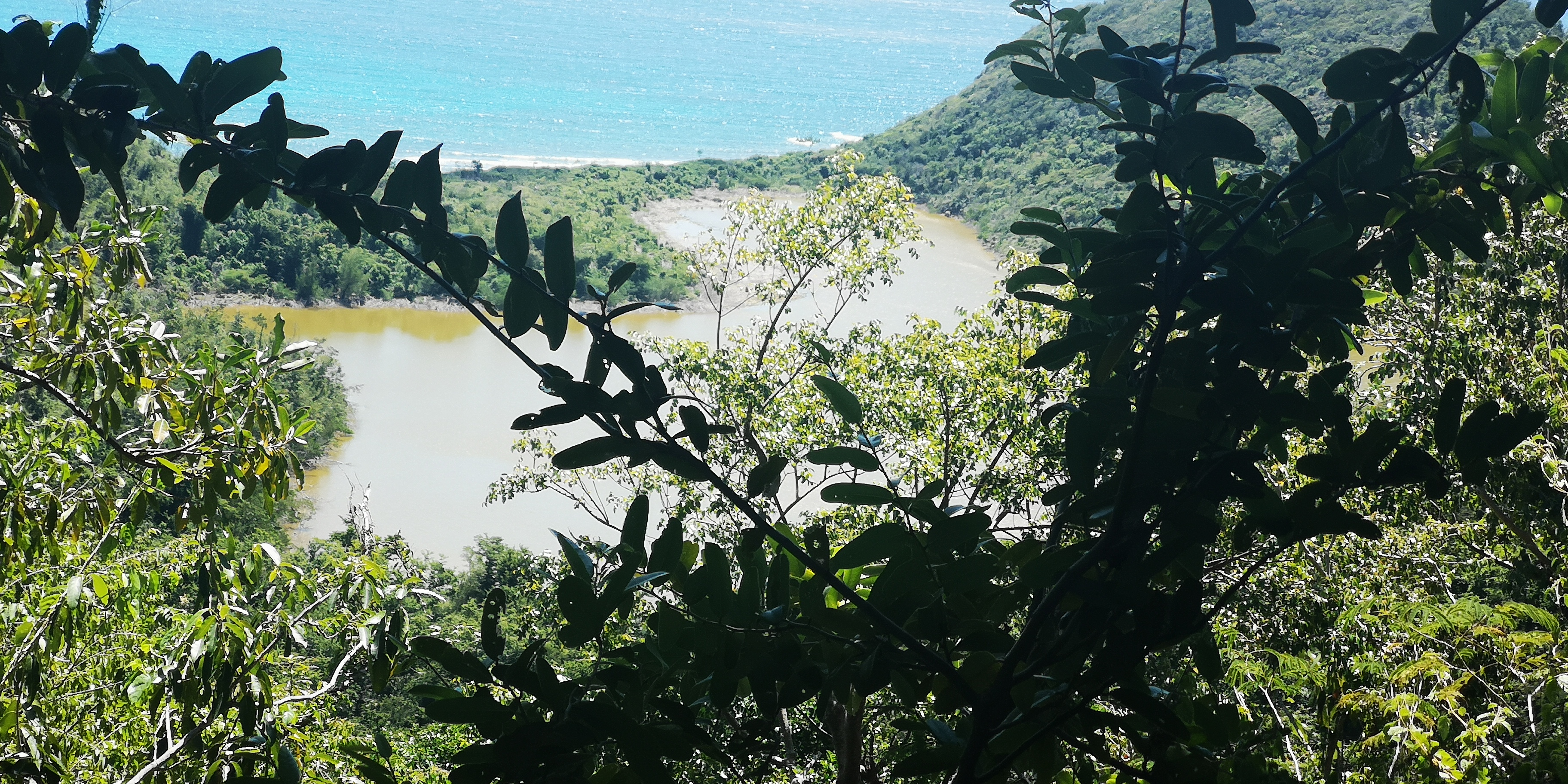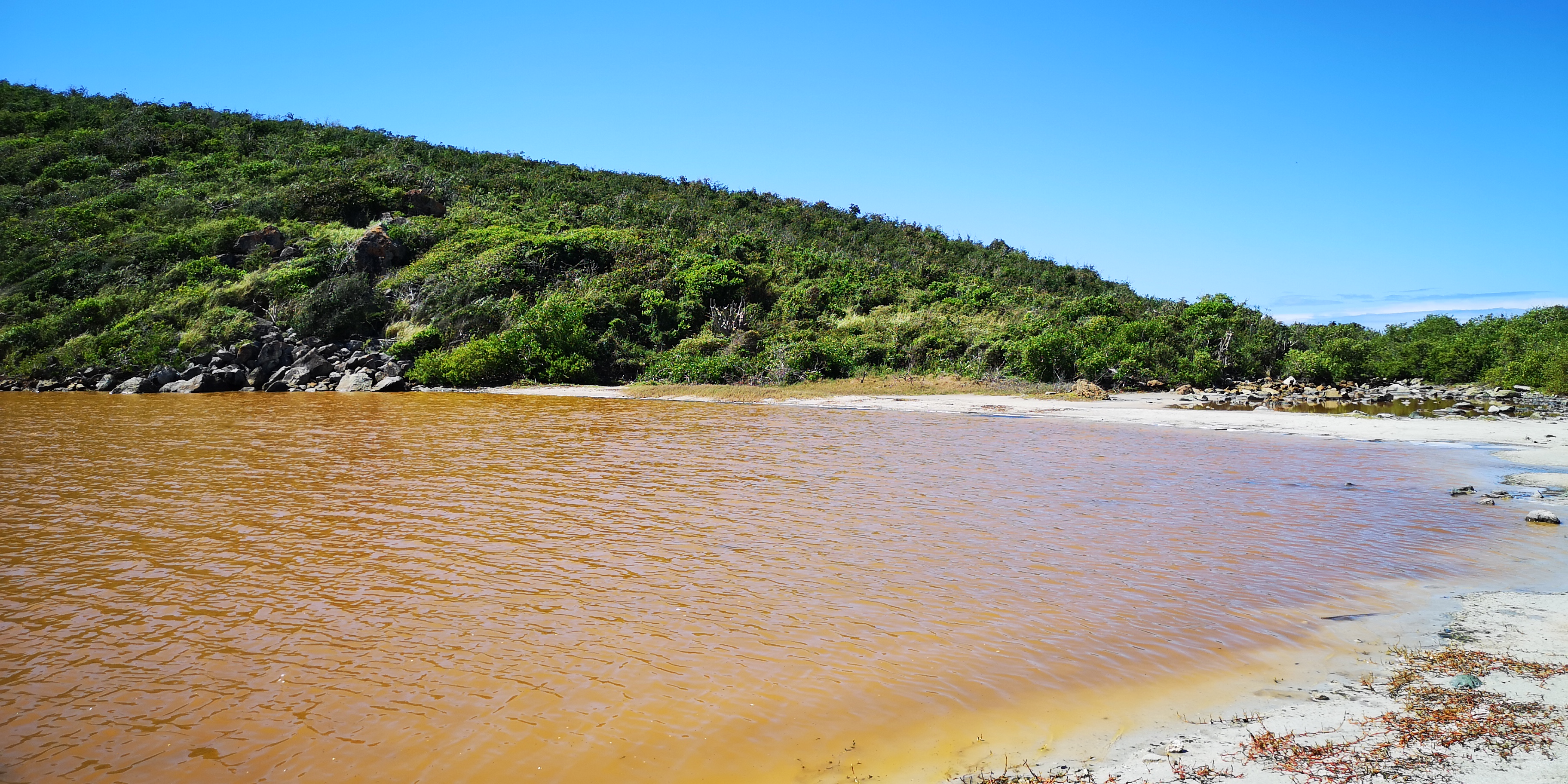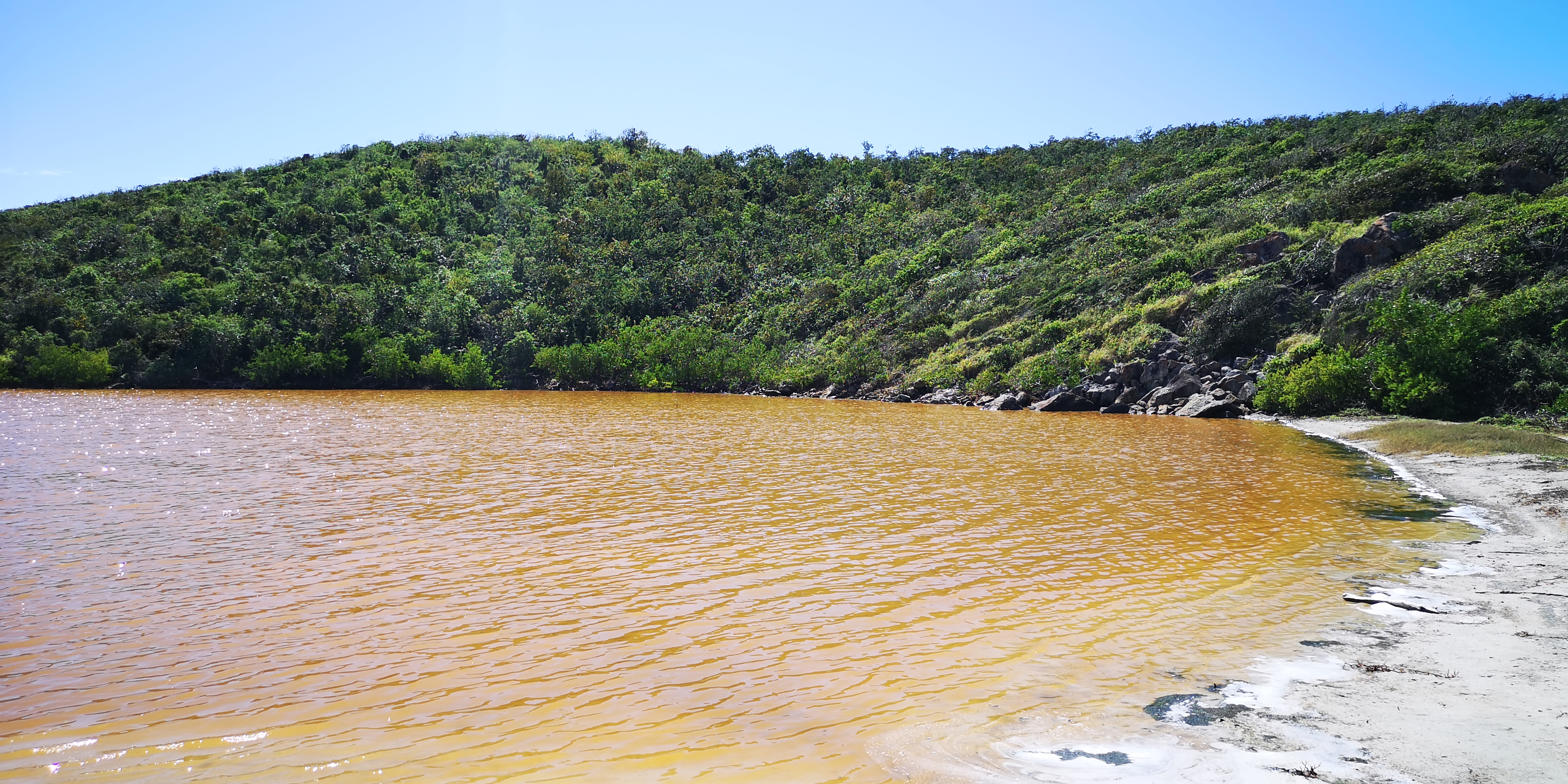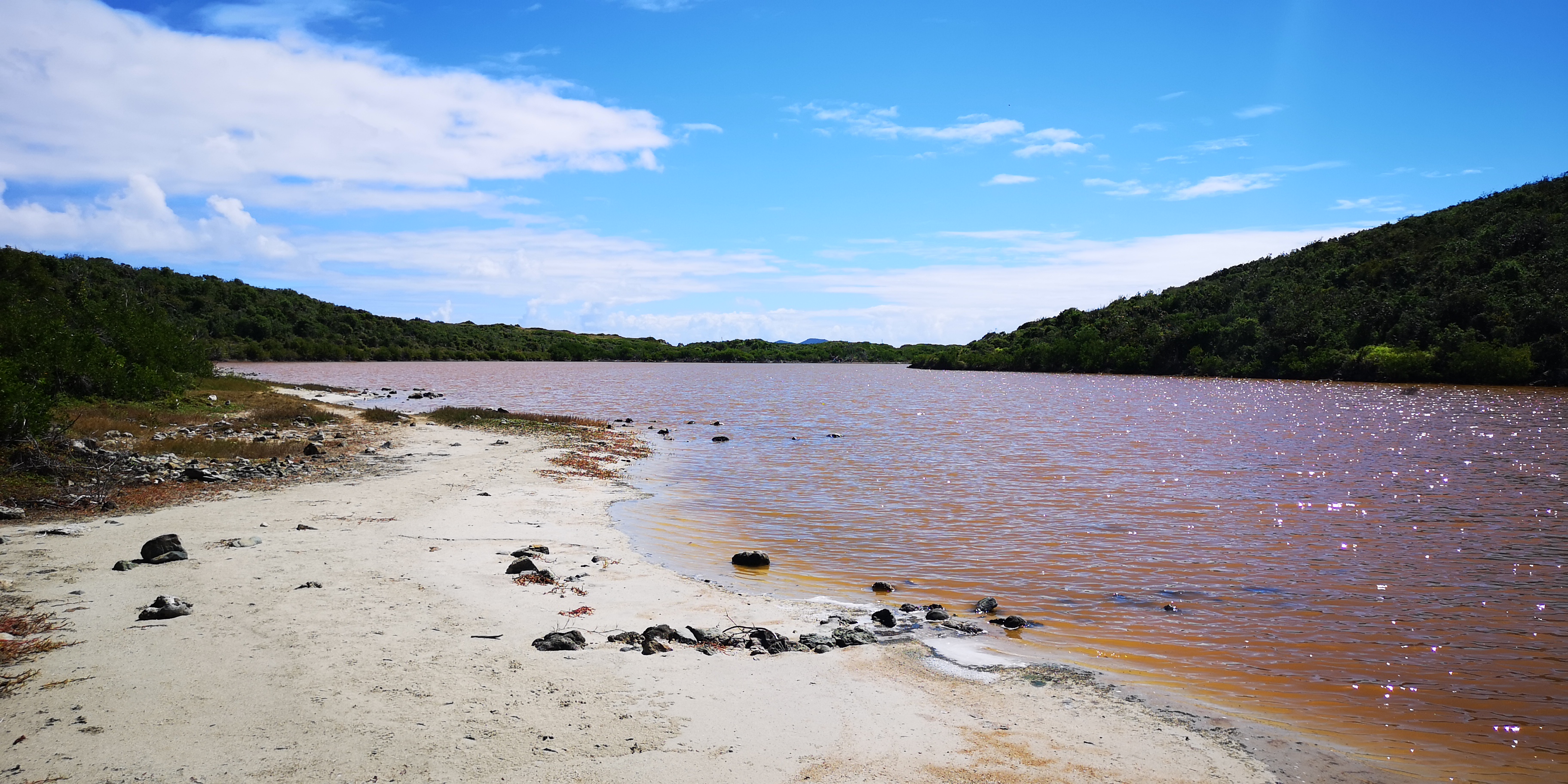 Beim Schnorcheln begegnen uns Schildkröten in verschiedenen Größen und Stachelrochen. Hinter dem Strand liegt ein rotbrauner Salzsee. Von denen gibt es mehrere an der Südküste von St John.