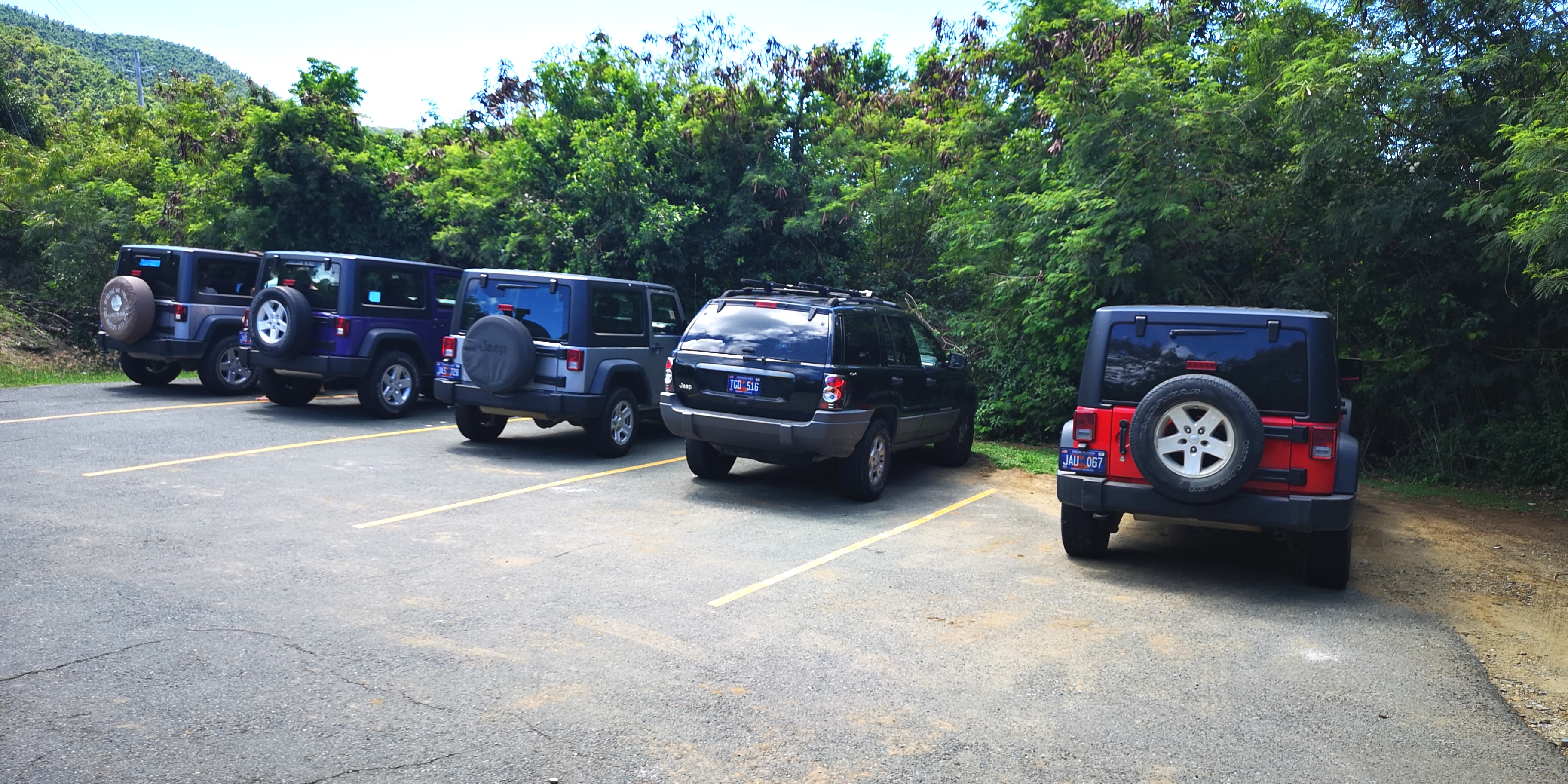 Der Parkplatz vor der Bar zeigt das gleiche Bild, das man auch sonst auf St John sieht: Fast ausschließlich Jeeps. Die Autoverleiher kennen offenbar nur eine Marke. Gut, es hat zum Teil steile Straßen. Aber die gibt es auch anderswo ohne diese Monokultur an Kfz.