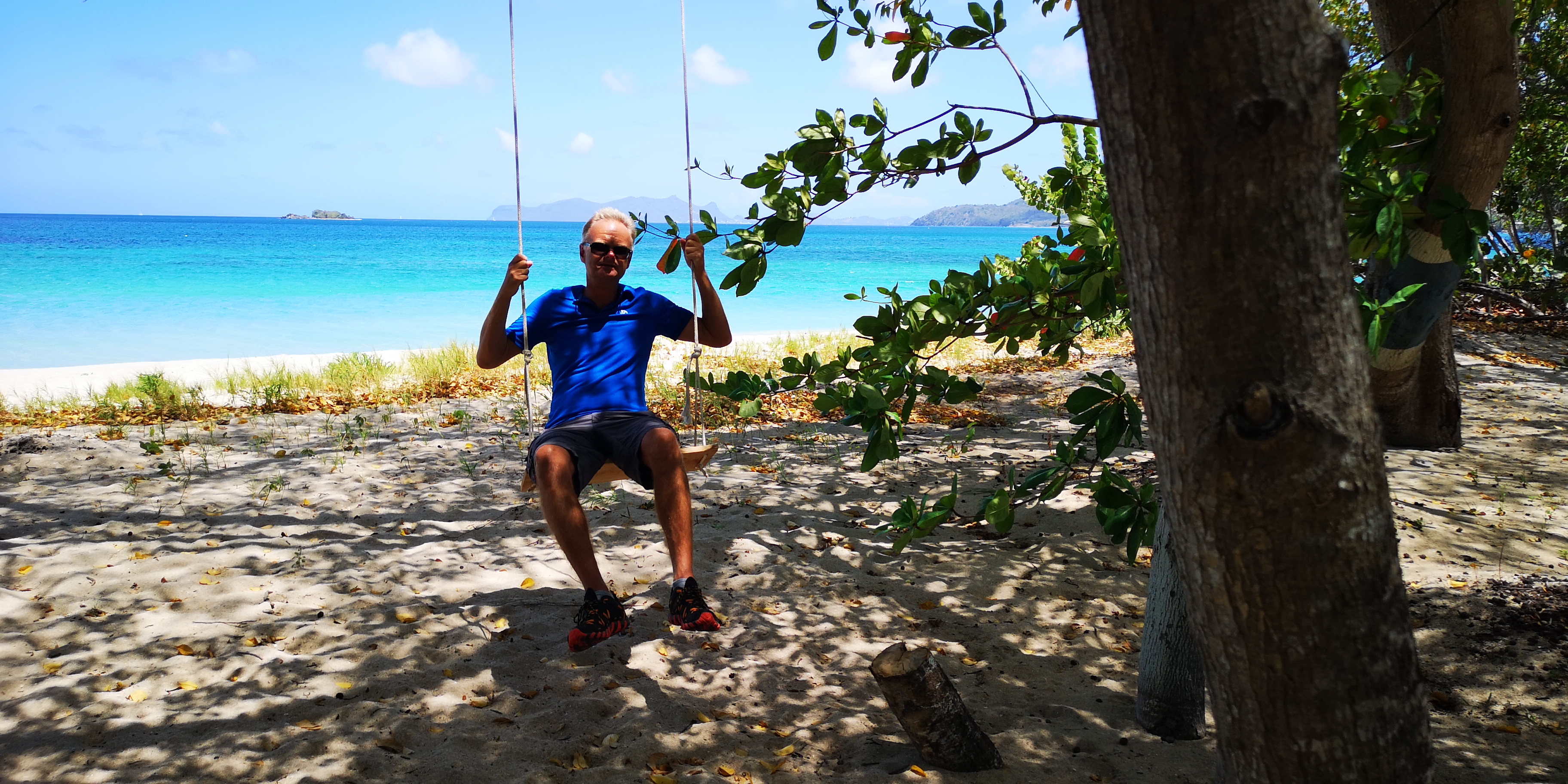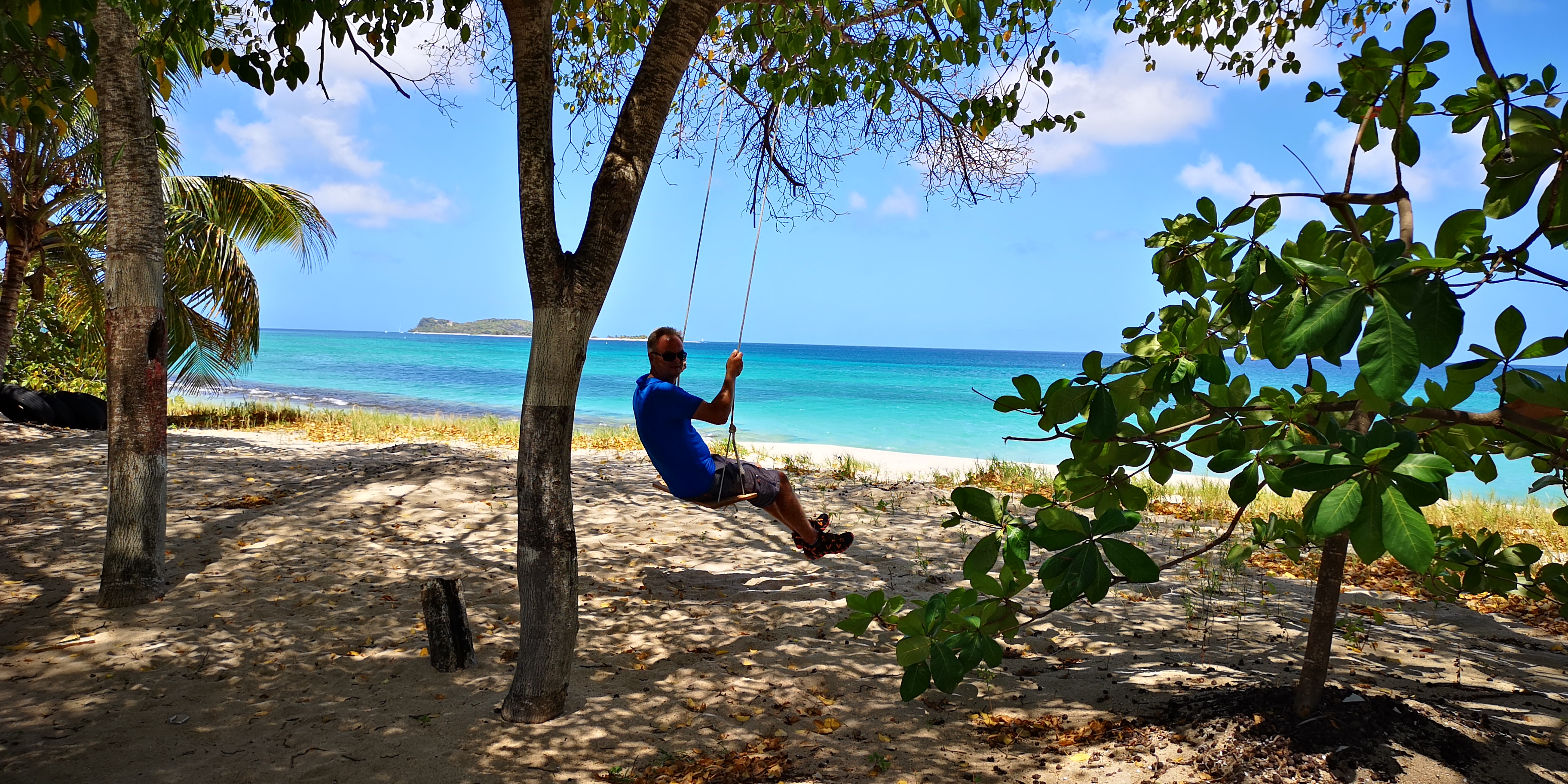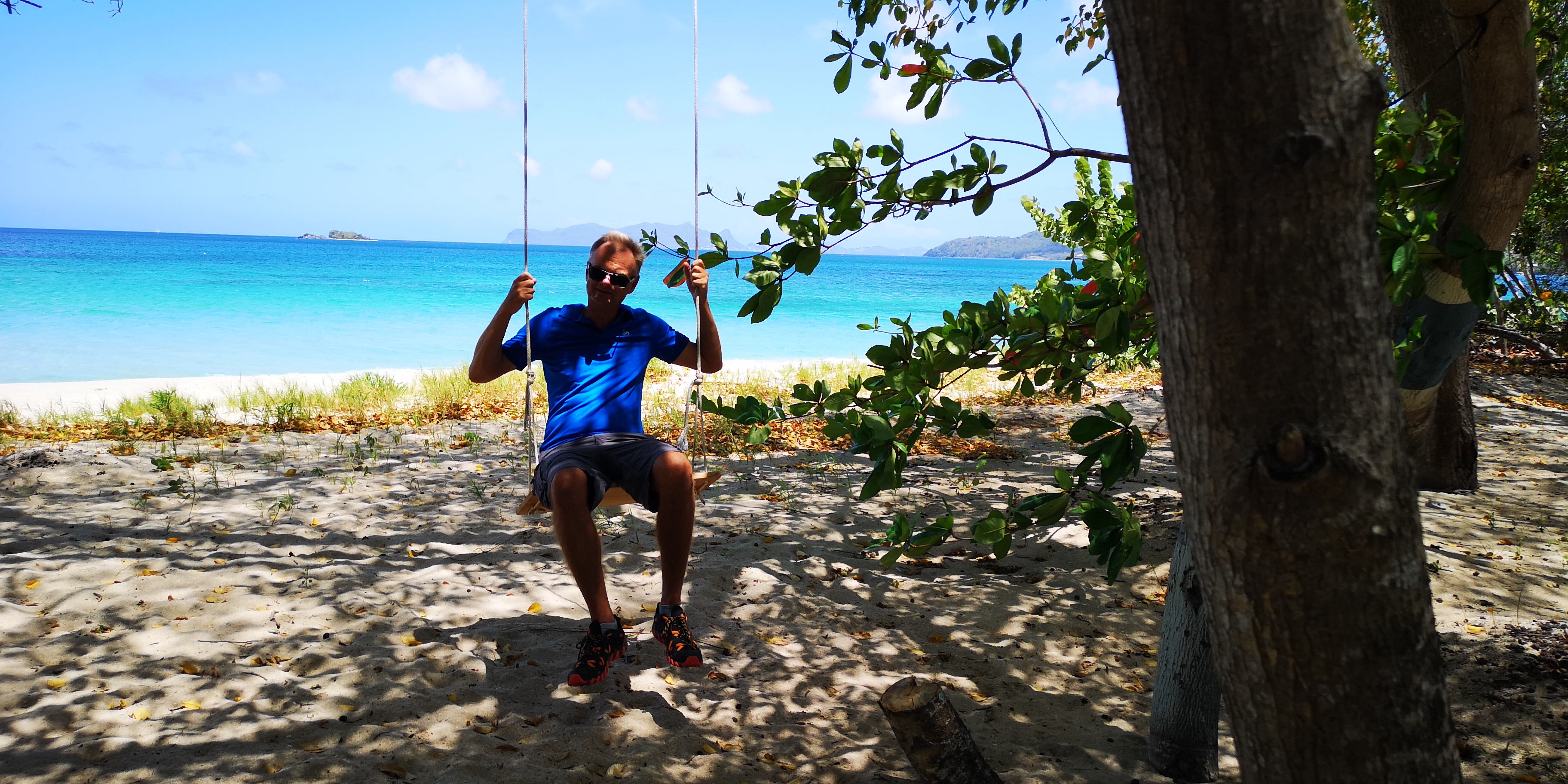 Der Skipper genießt die herrliche Aussicht nahe des Paradise Beach entspannt auf einer Schaukel.