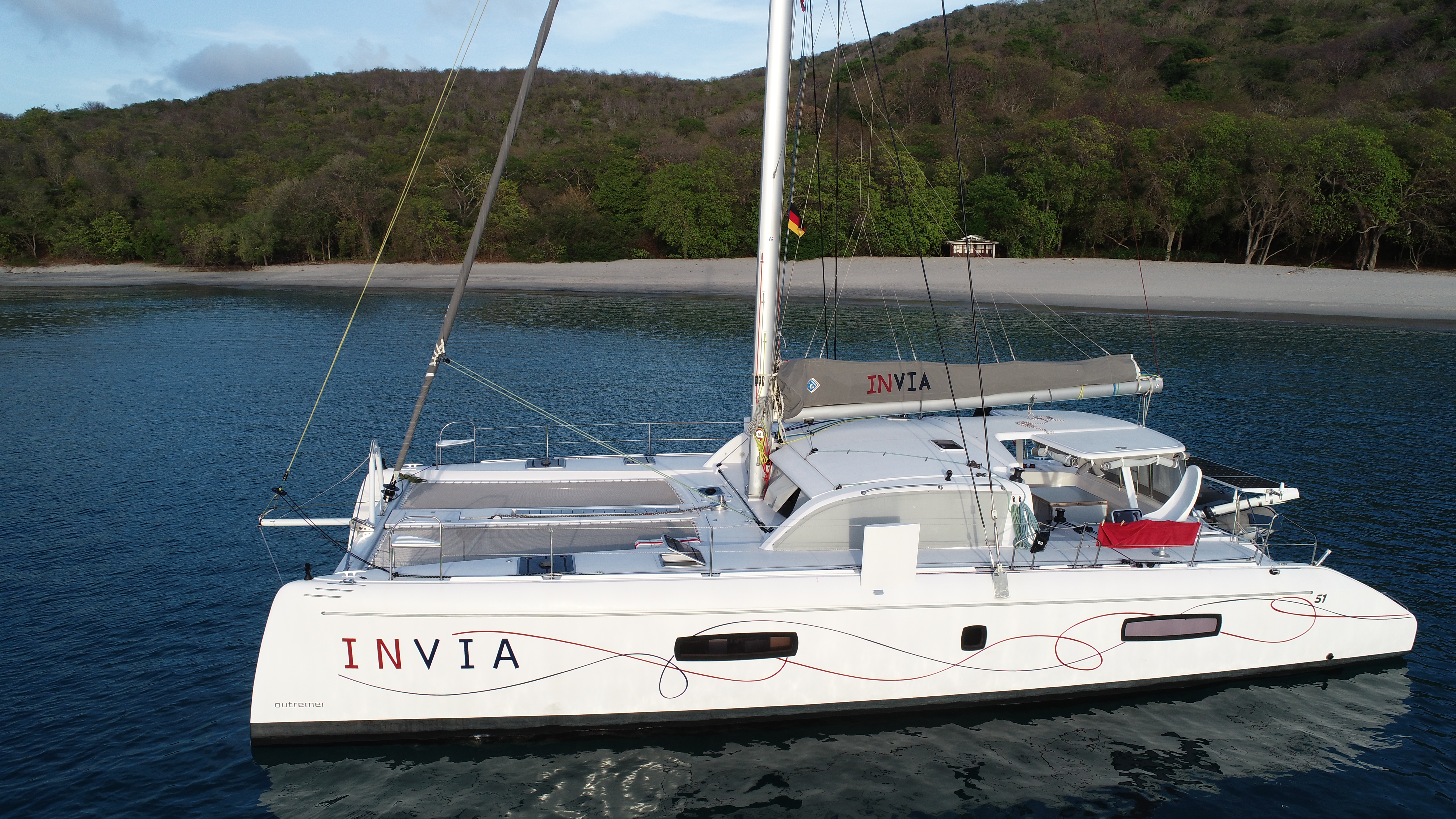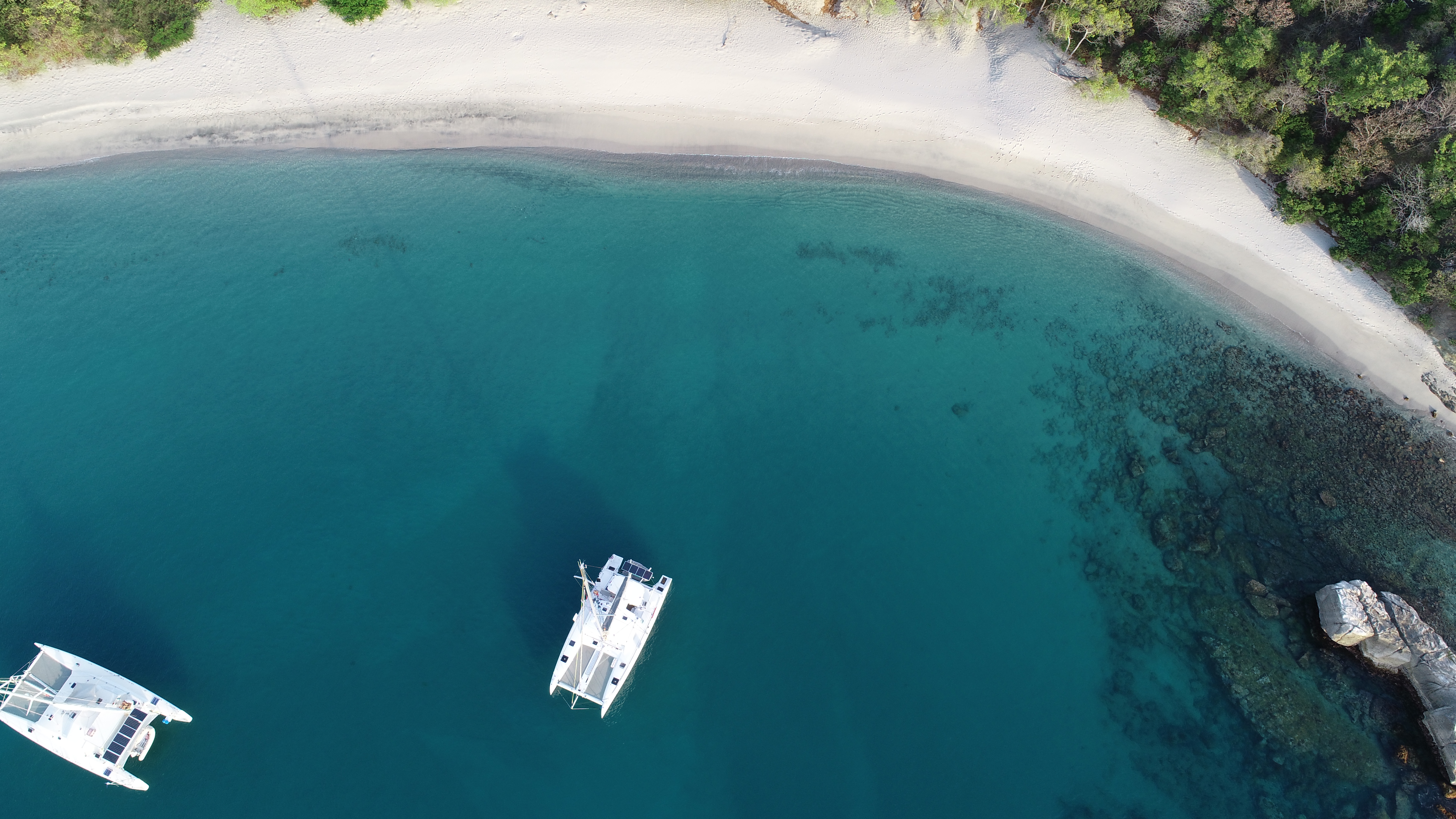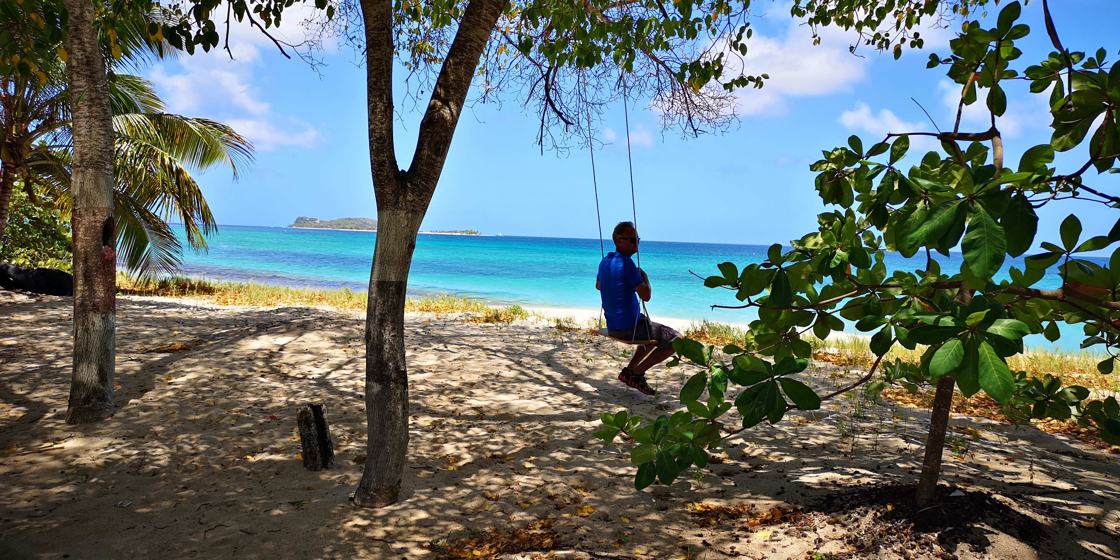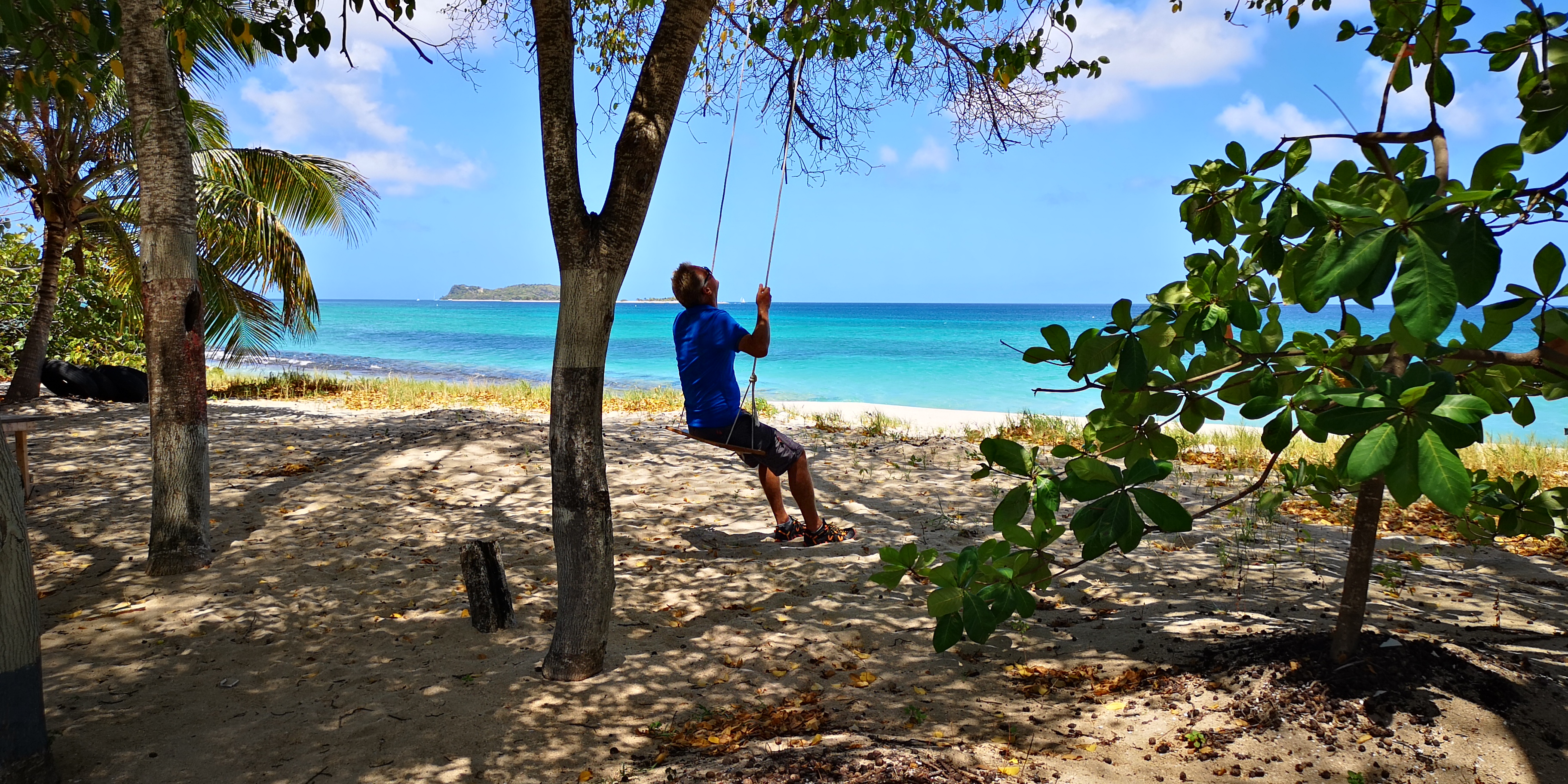 Der Skipper genießt die herrliche Aussicht nahe des Paradise Beach entspannt auf einer Schaukel.