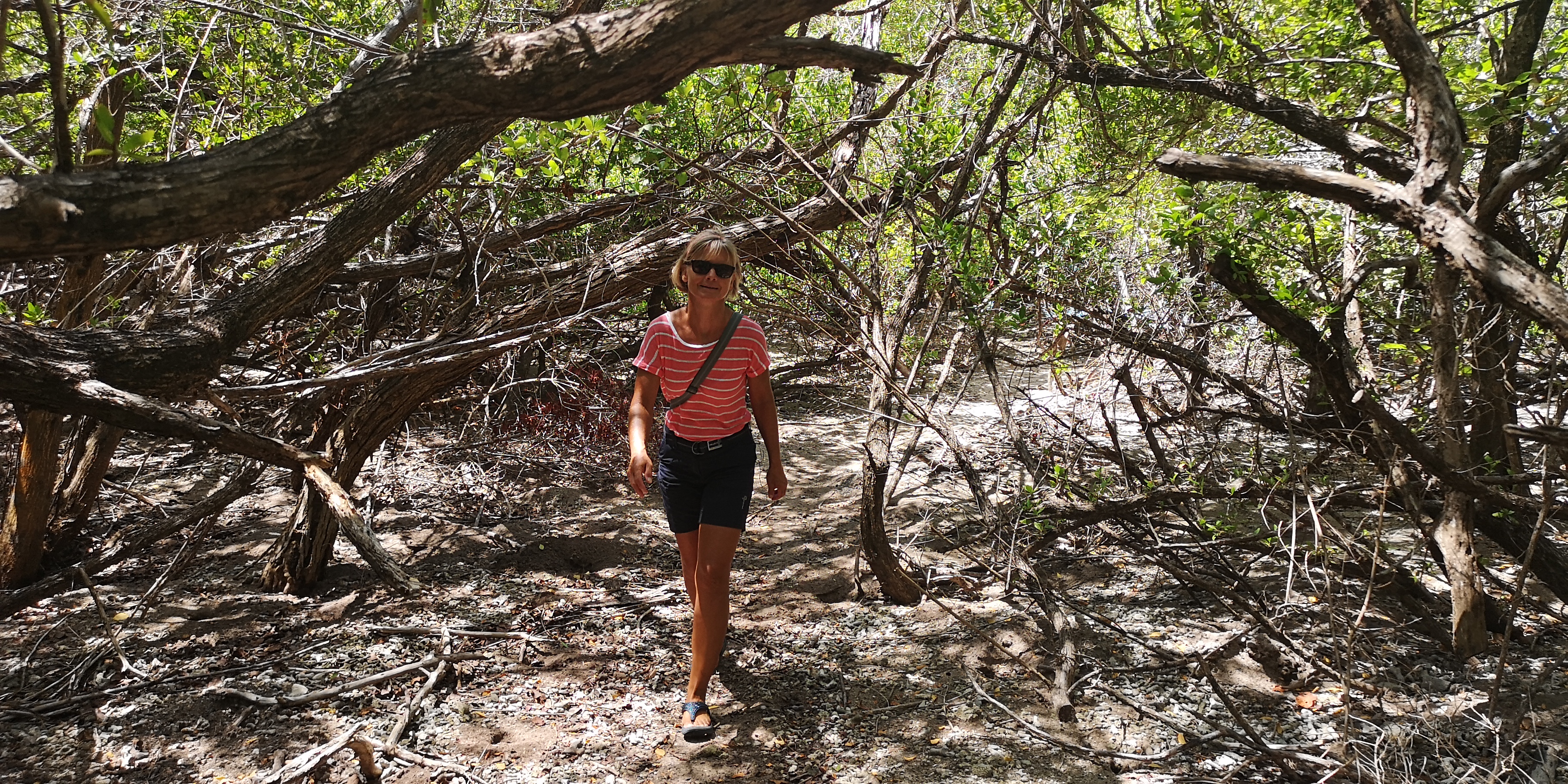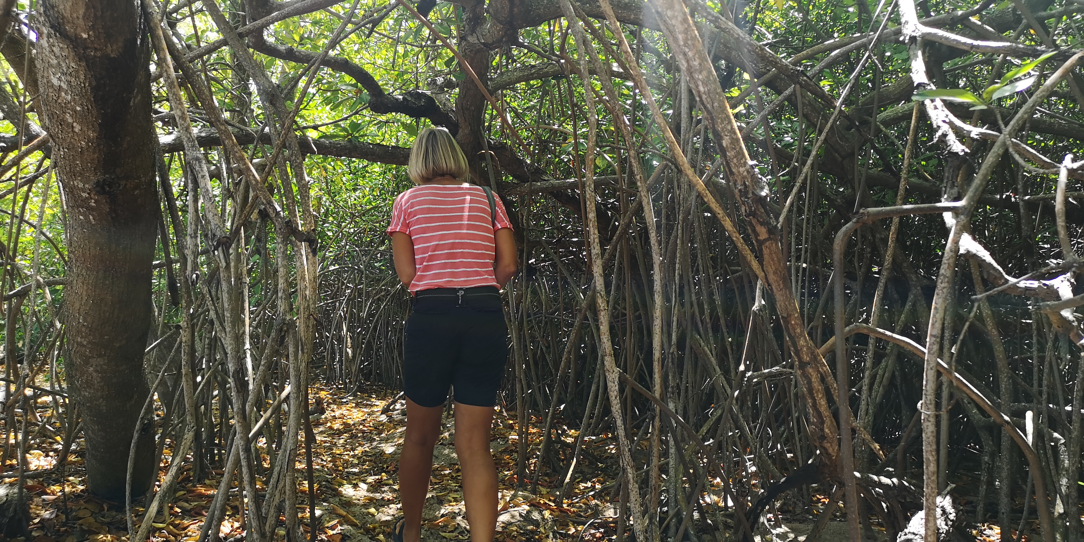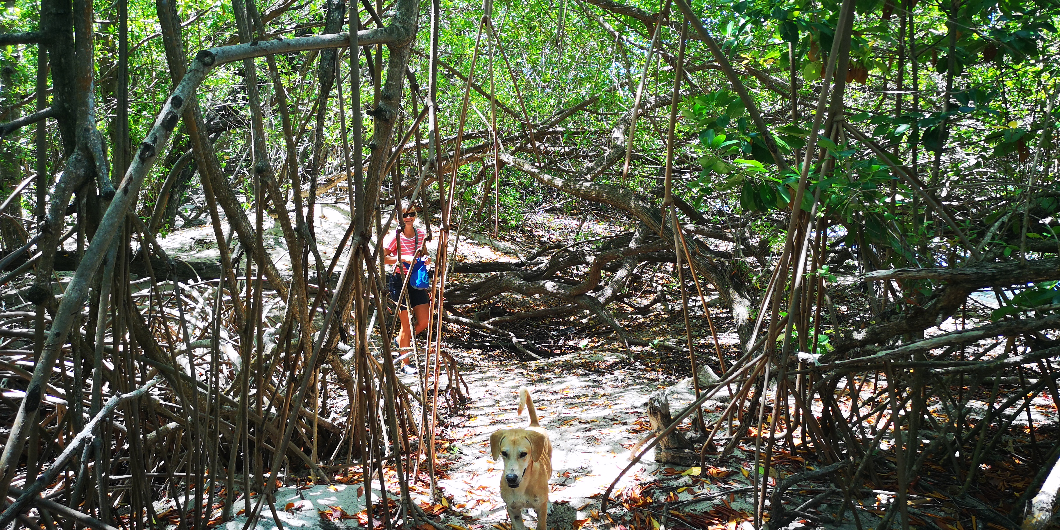 Vom Paradise Beach aus geht der Weg entlang des Wassers durch einen dichten Mangrovenwald.