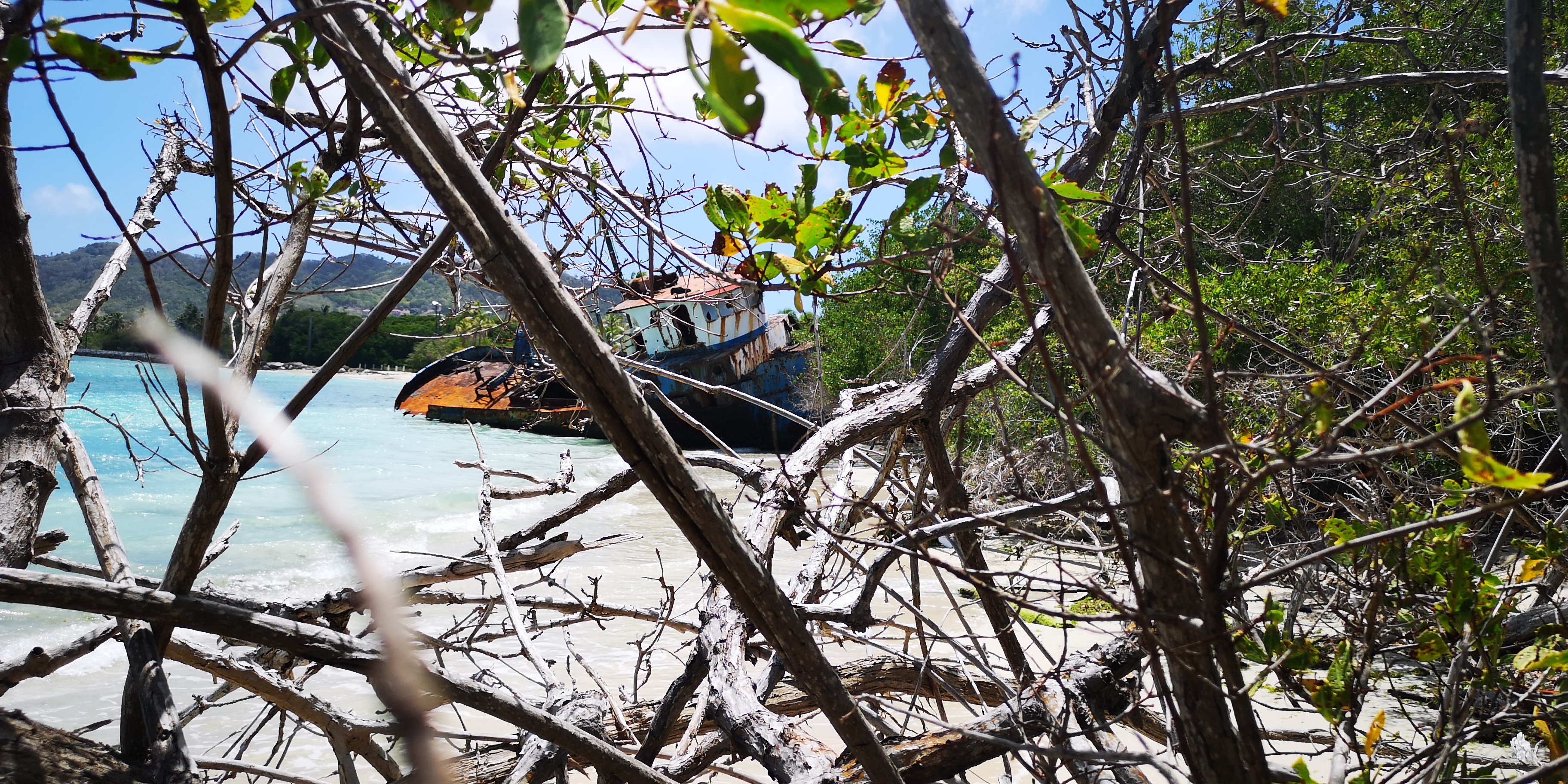 Der Wanderweg nach Bogles führt von der Anse La Roche aus ebenfalls durch dichten Wald. Vorbei an Ruinen oben auf dem Hügel, die bereits fast von der Natur erobert sind.