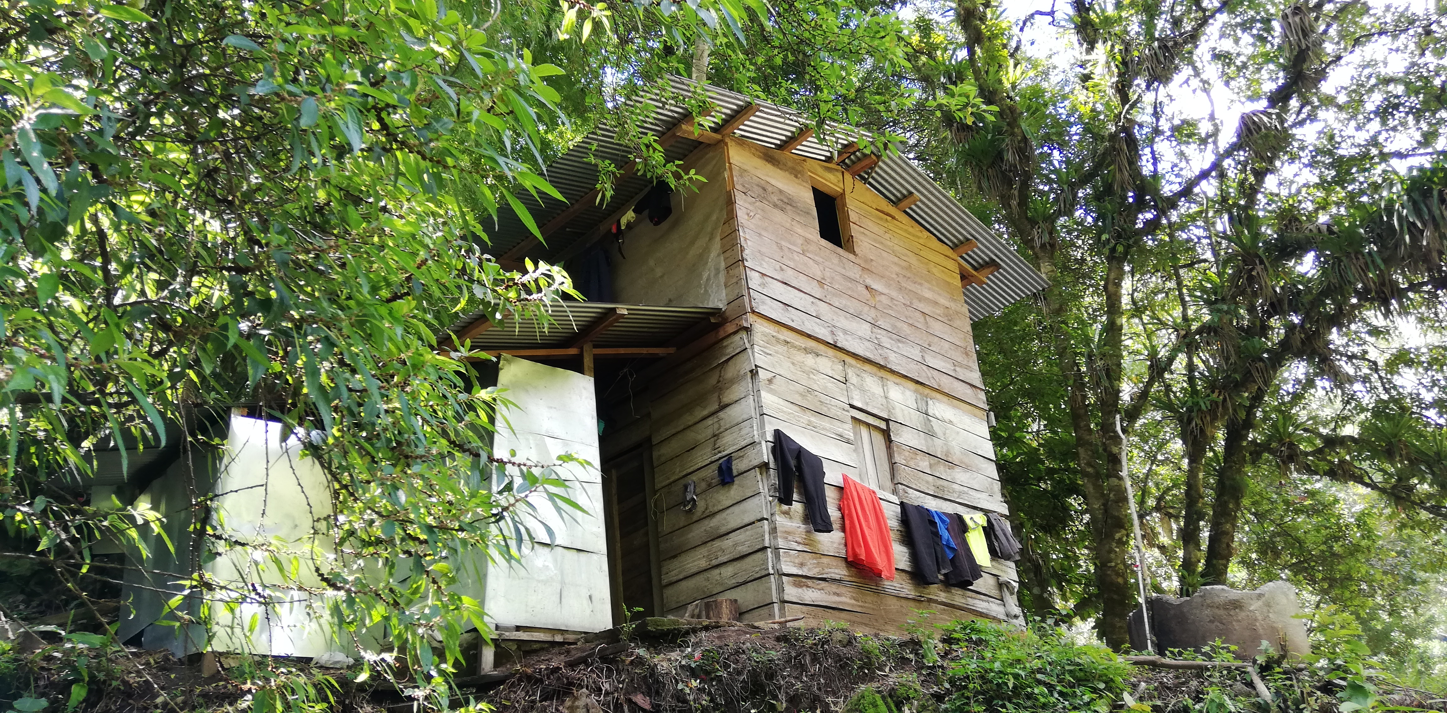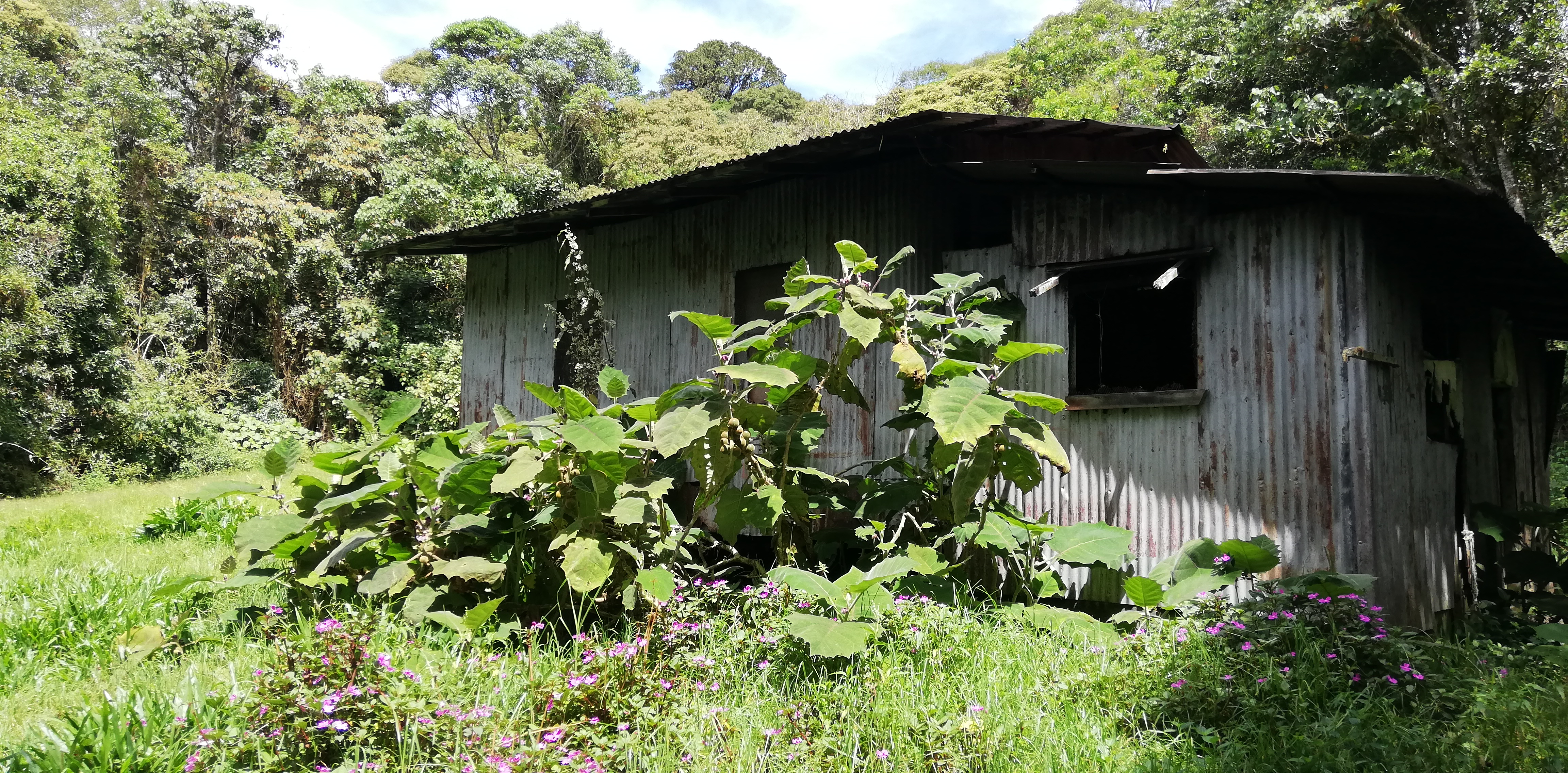 Erstaunlich ist, wie weit oberhalb es noch Wiesenlandschaften gibt. An einer Stelle finden wir nach langem Marsch durch den Wald eine Wiesenlichtung mit Hütte vor. Offenbar hatte(n) in der Hütte zumindest ein wenn nicht zwei Menschen gelebt Seite an Seite mit dem Tierstall und direkt an der Weide.