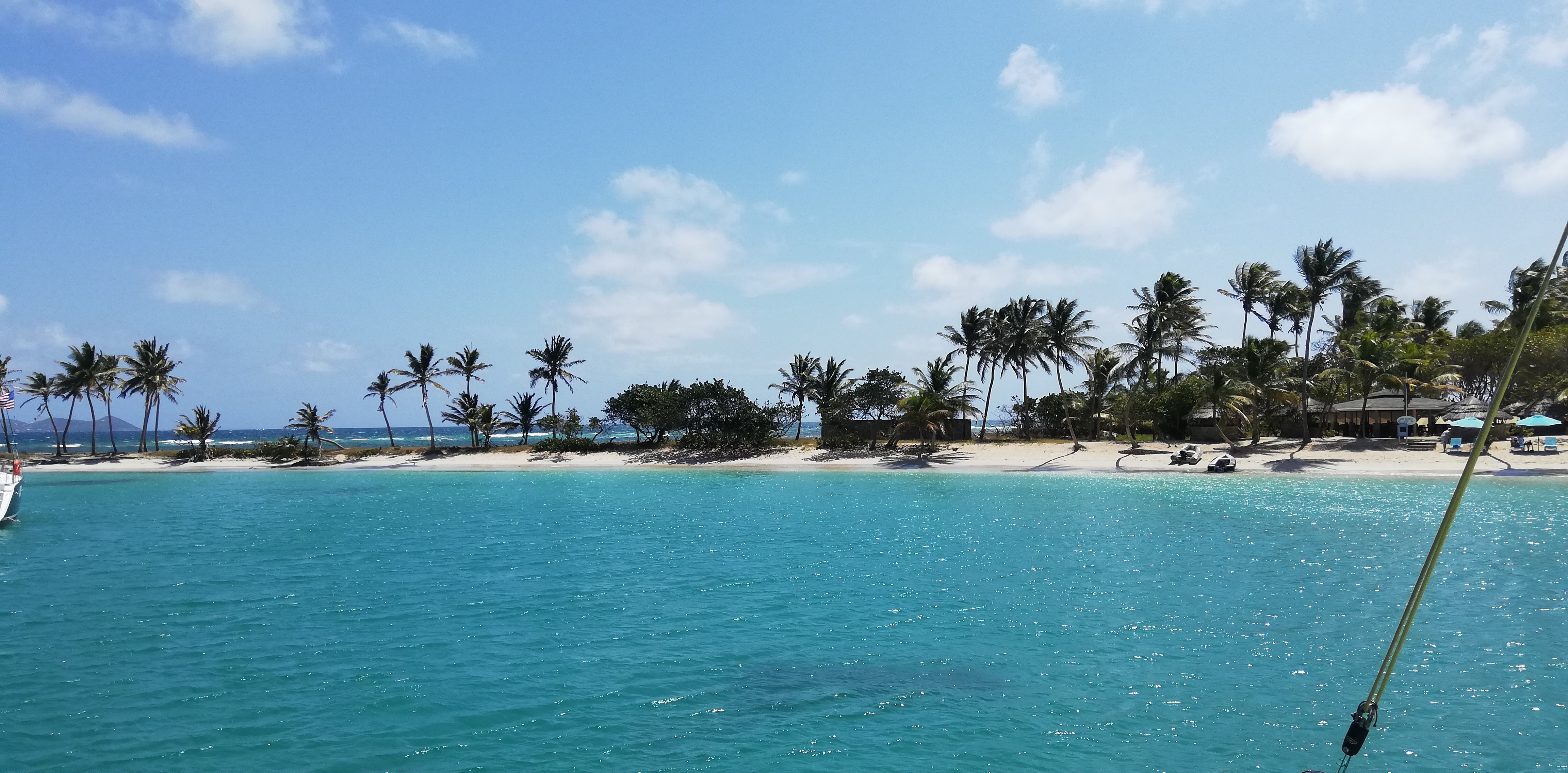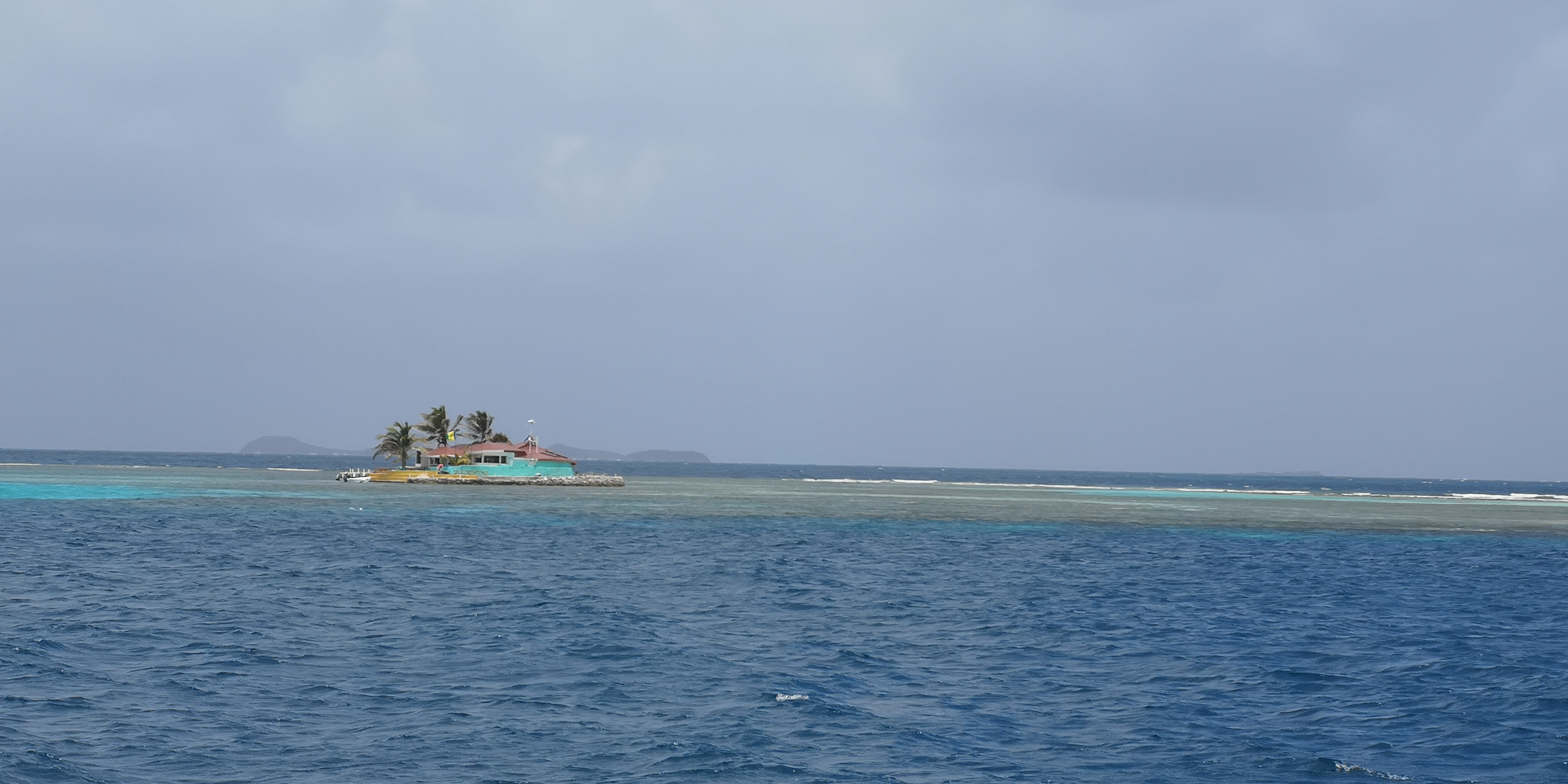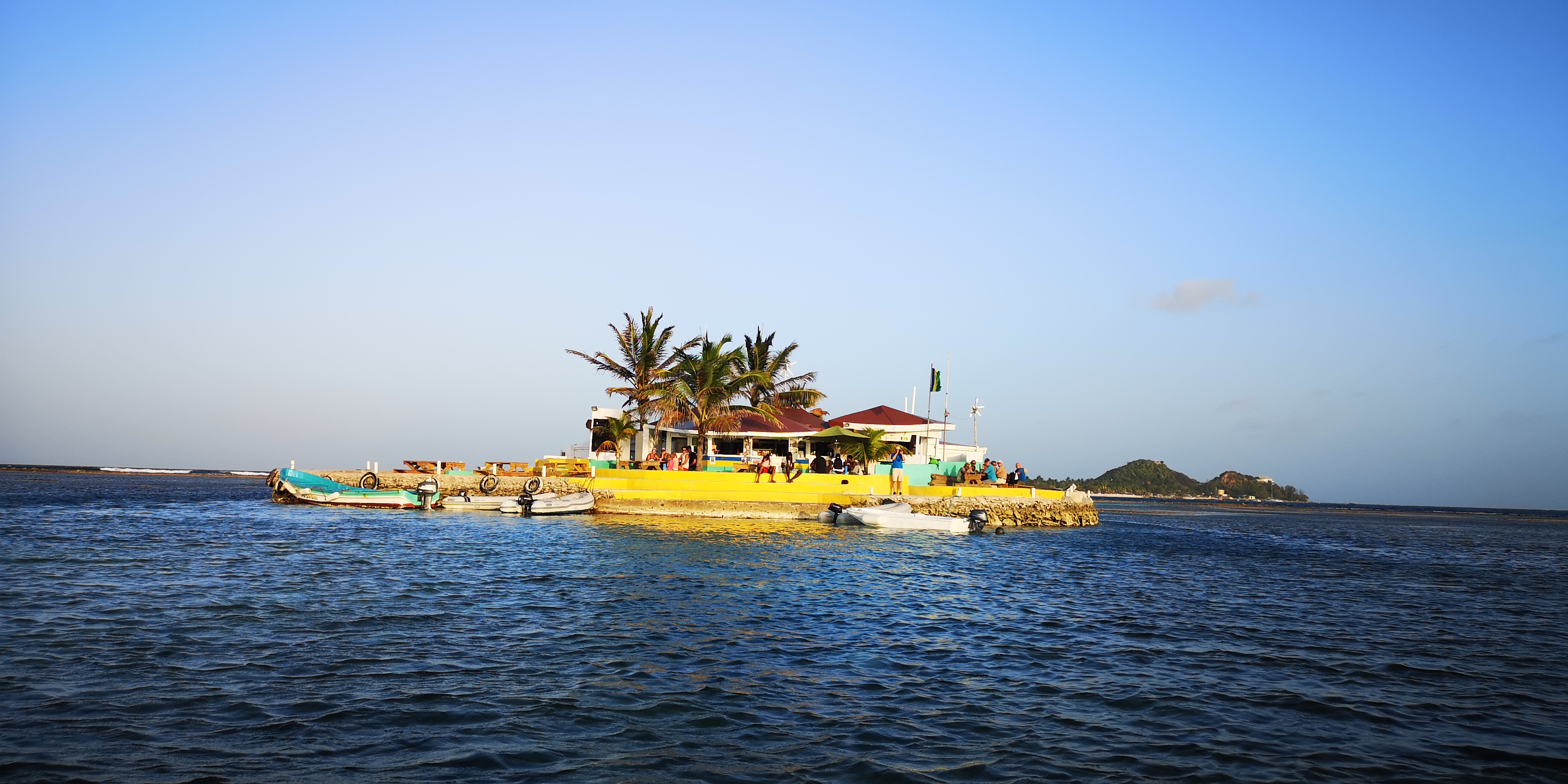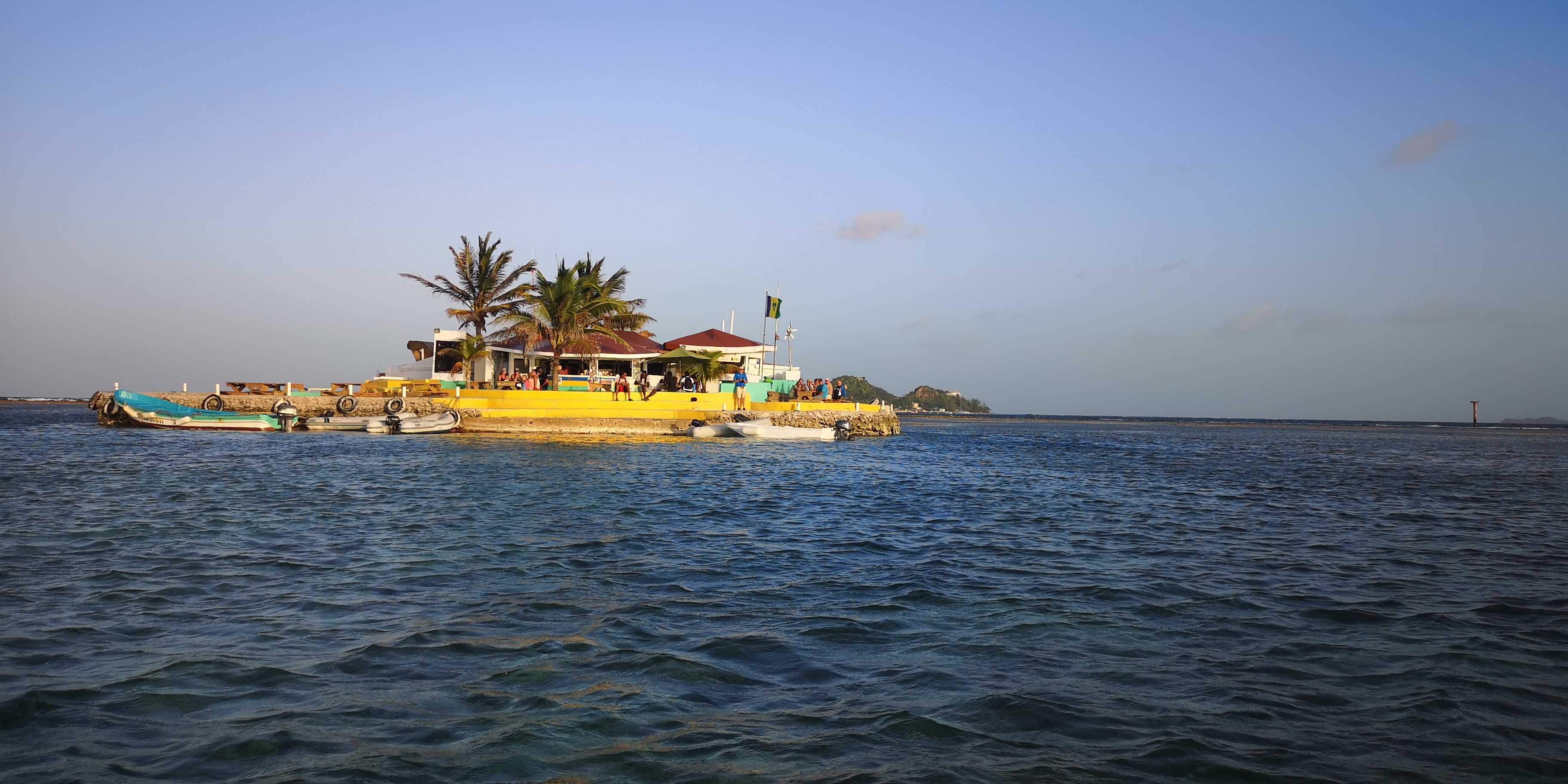 Auf dem Weg zur Einfahrt in das ringsherum von Riffen umgebene Clifton Harbour nehmen wir zunächst Kurs auf Happy Island. Ein findiger lokaler Unternehmer hat die Insel – angeblich größtenteils aus Schalen der Conch-Muscheln – aufs flache Riff gebaut. Und eine Bar obendrauf. Schon aus der Ferne sieht diese Insel einladend aus!