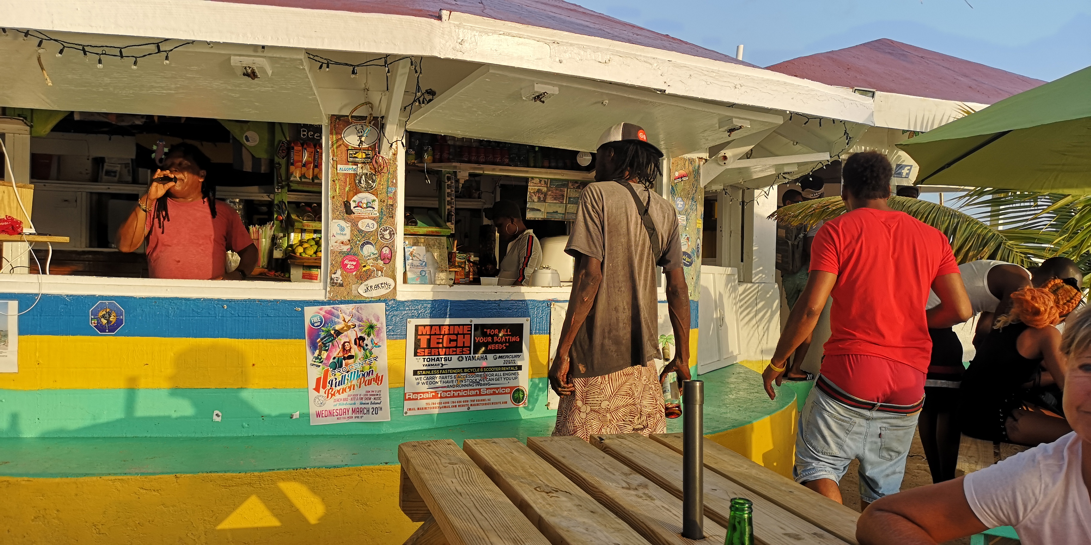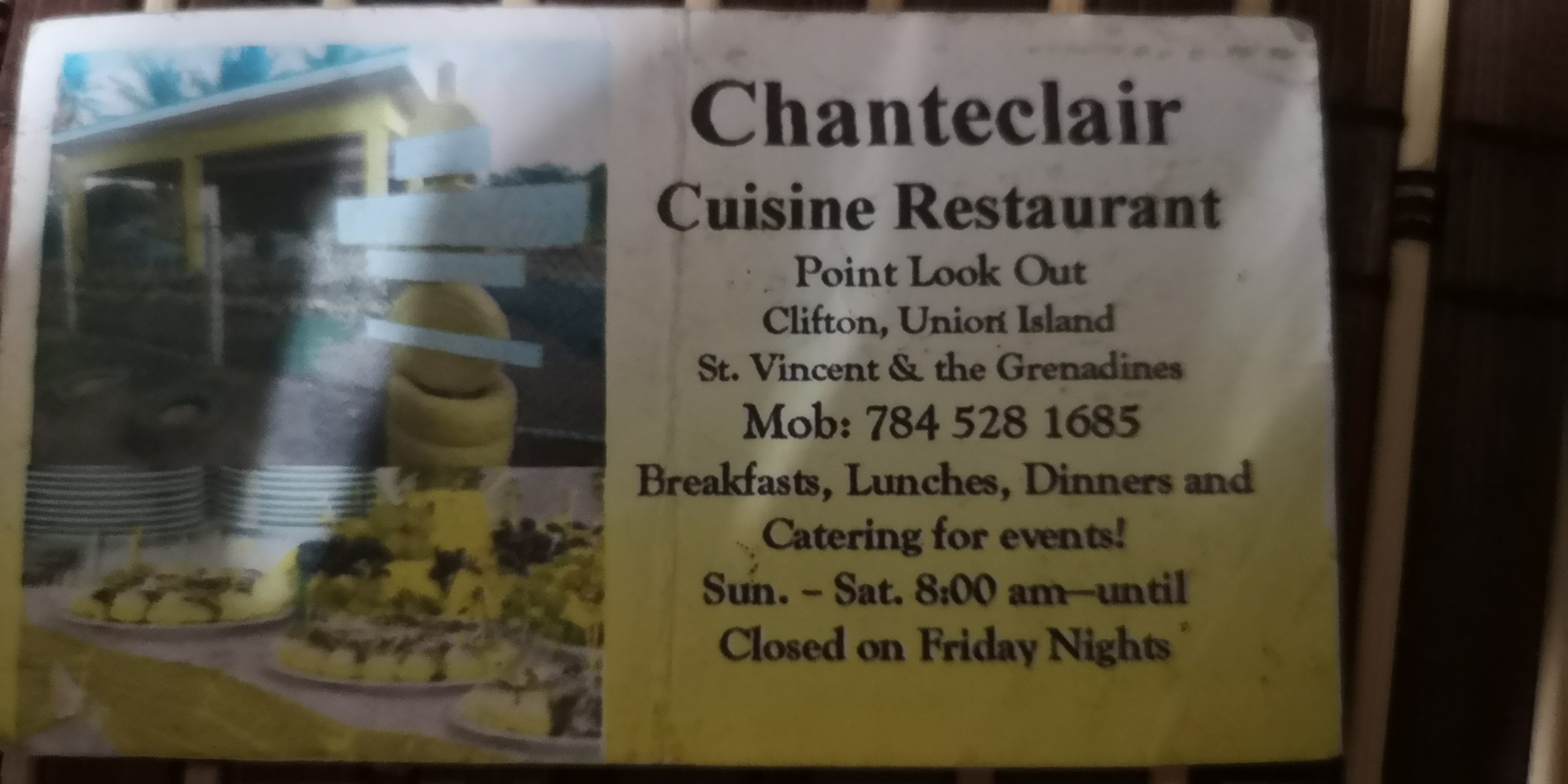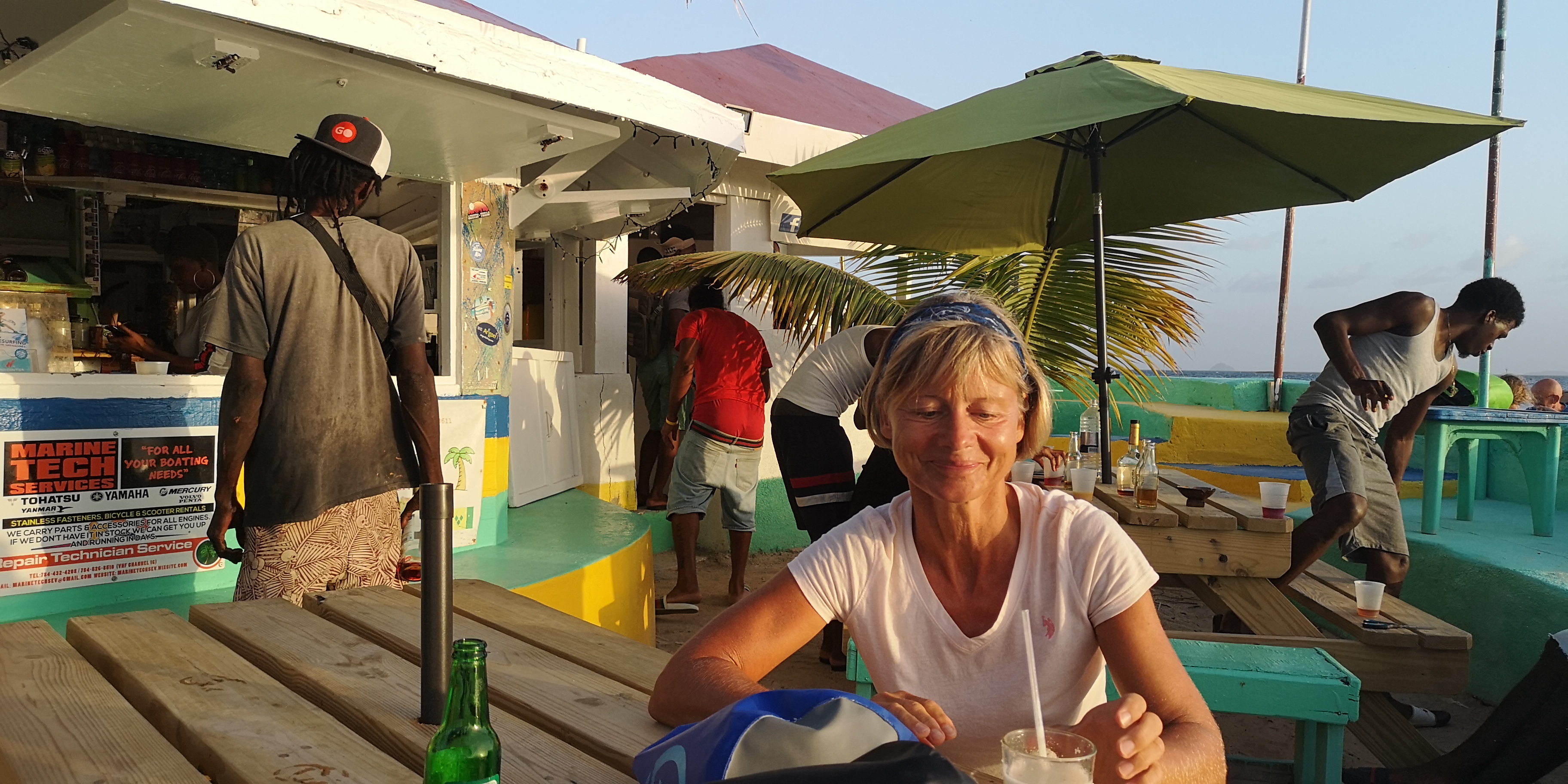 Wir versuchen, wo es passt, auch die kleineren Unternehmer zu unterstützen. Sofern meine gewiss nicht hohen Hygieneanforderungen erfüllt sind, auch mal mit einem hausgemachten Abendessen; ansonsten mit einem Getränk. Wir hatten gute Erfahrungen, z.B. in Clifton auf Union Island in dem kleinen Restaurant Chanteclair in der Straße links hinter dem Anchorage Hotel. Dort wurde von einem einheimischen Paar mega-lecker aufgetischt. Beide versuchen, ihr adrettes Restaurant zu etablieren. Kein einfaches Geschäft in der 2. Reihe hinter den Frontlokalen. Allerdings war er auch jahrelang auf einem Kreuzfahrtschiff als Barkeeper mitgefahren und hatte Erfahrungen im Touristengeschäft sammeln können. Und beide sind offensichtlich engagierter als diejenigen, die lieber in der Nachbarschaft an der Bar hängen.