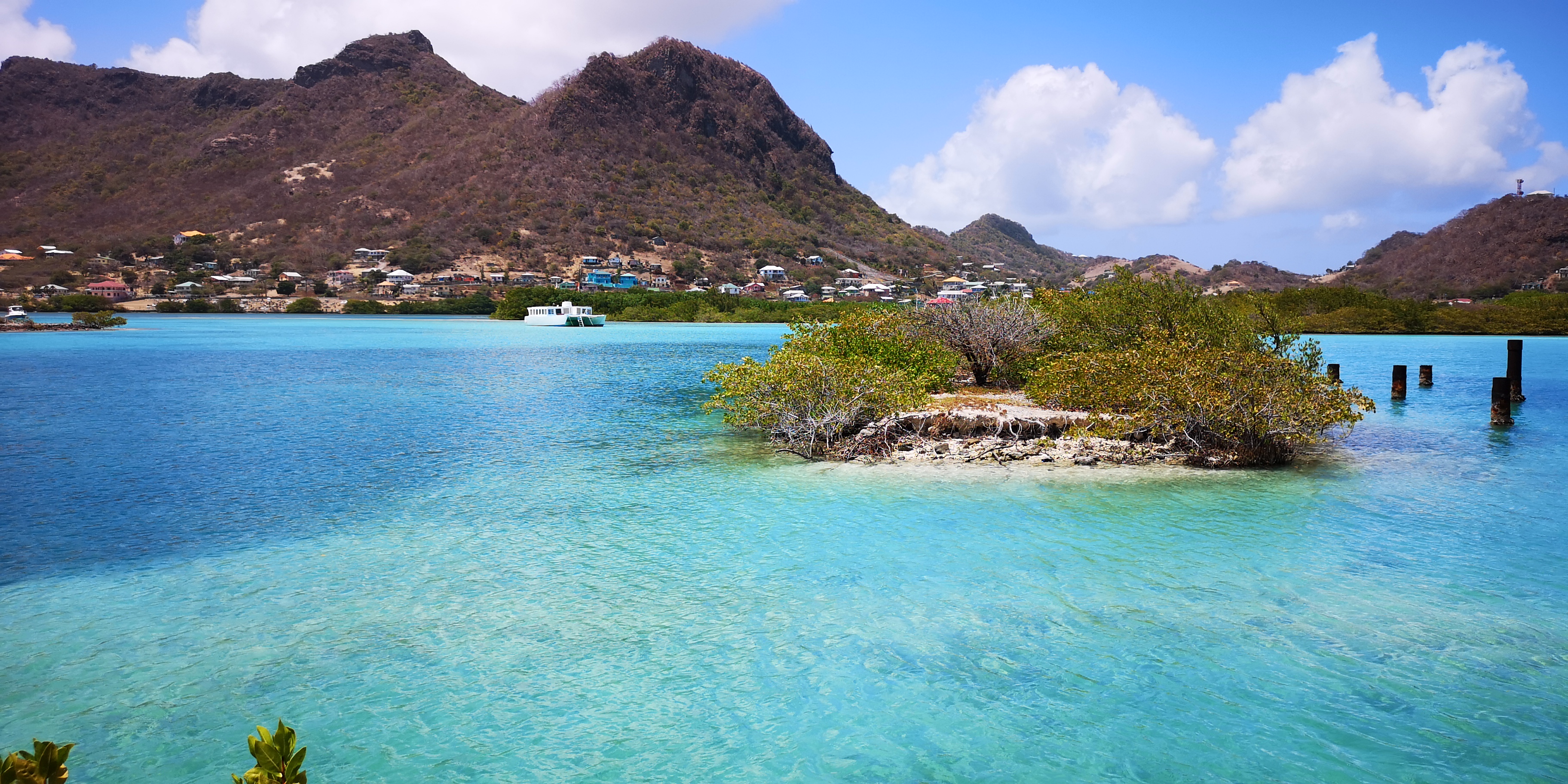 Einen Nachmittag verlegen wir uns von Clifton in die Ashton Lagoon im Süden von Union Island. Die Lagune mit dem vorgelagerten Frigate Island ist schon seit 1986 Naturschutzgebiet. Ungeachtet örtlicher Proteste erhielt 1993 ein Investor die Genehmigung zum Bau einer Marina mit 300 Plätzen samt Eigentumswohnungen. Frigate Island wurde über einen Damm mit Union Island verbunden. Die Arbeiten mussten wegen Bankrotts bereits nach einem Jahr eingestellt werden. Zurück blieb eine abgeschlossenen Lagune, deren Ökosystem mangels Frischwasserzufuhr umzukippen drohte. Die örtliche NGO SusGren ließ mit Spenden den Damm durchbrechen, um das Ökosystem zu retten (siehe www.susgren.org). Heute führen Hängebrücken über die Dammdurchbrüche und ein Fußweg mit liebevoll gestalteten Holzschildern geht durch die Mangroven bis zur Straße nach Ashton.
