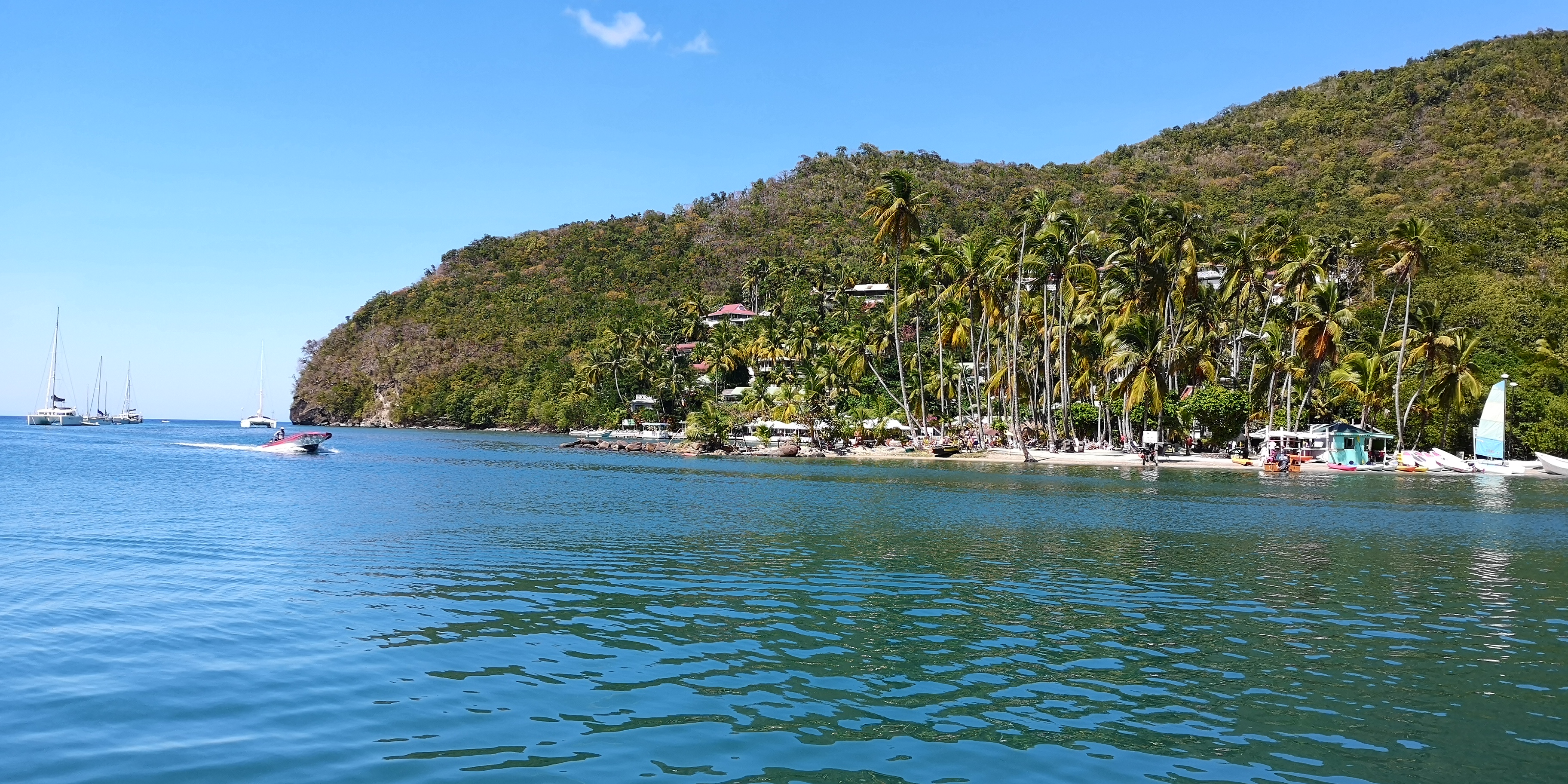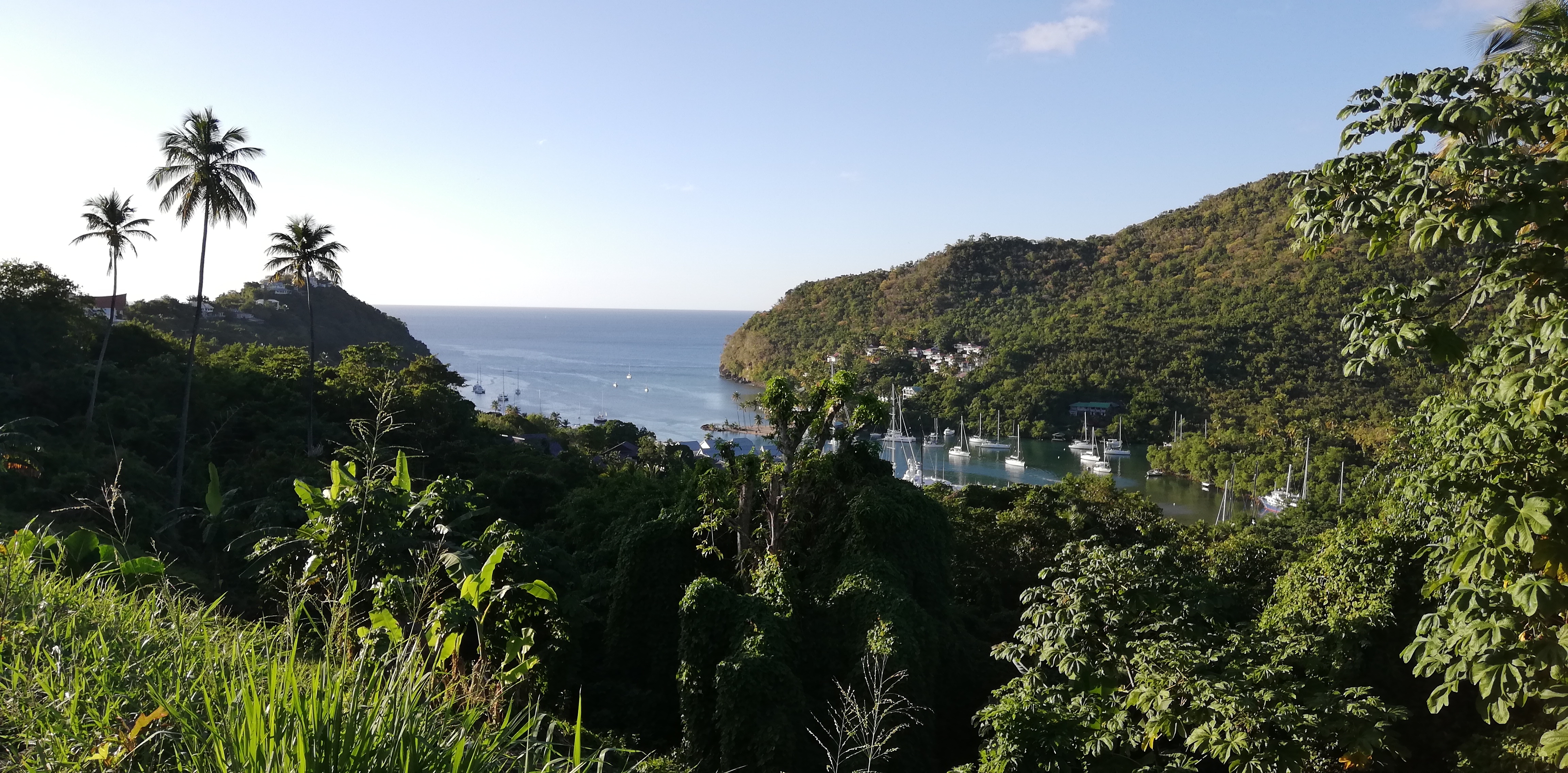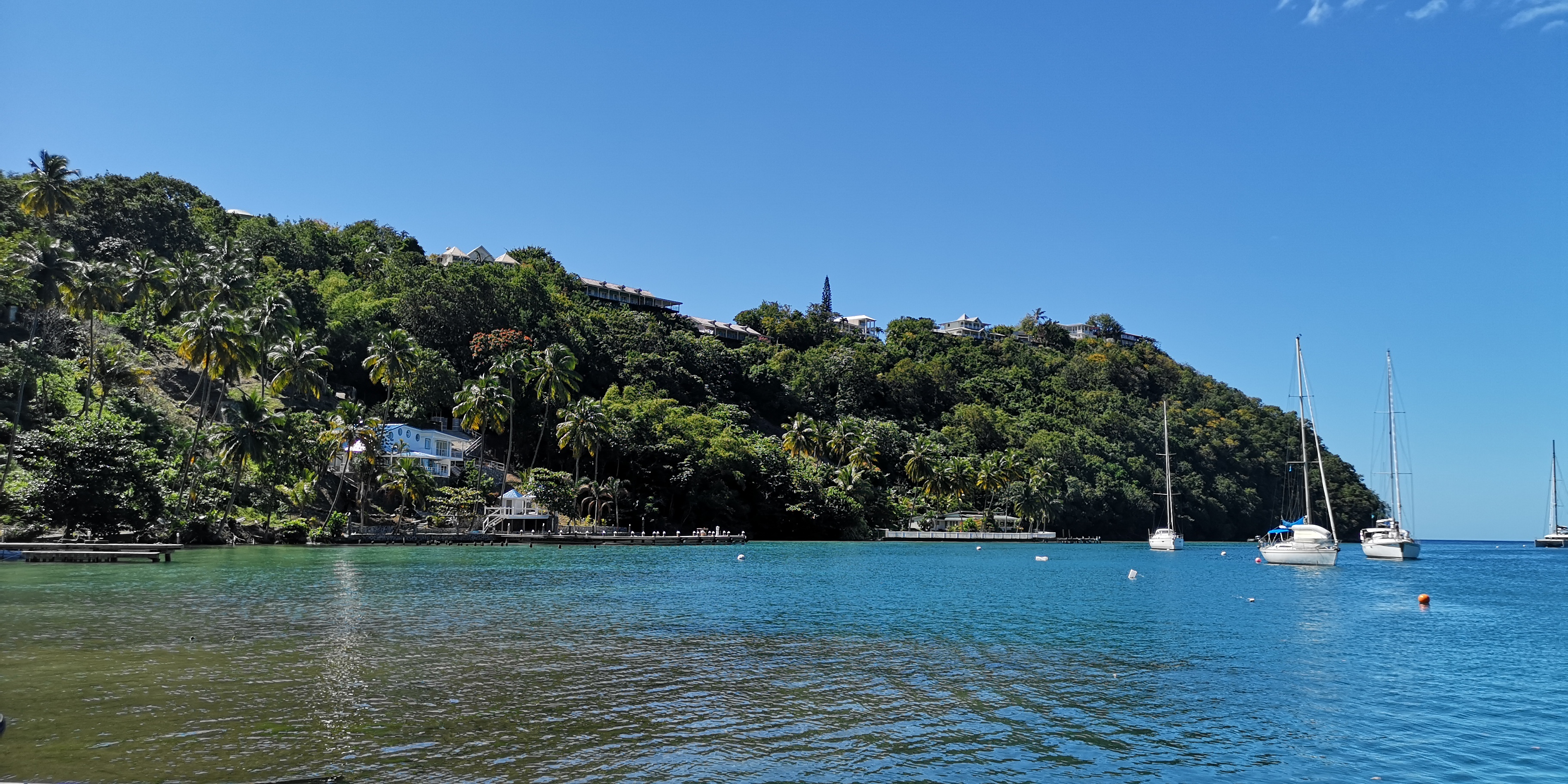 Die Marigot Bay auf St Lucia liefert Kontrastprogramm zur Soufriere Bay. Die Bucht zieht sich wie ein Arm ins Landesinnere, ein perfekt geschützter Naturhafen.
