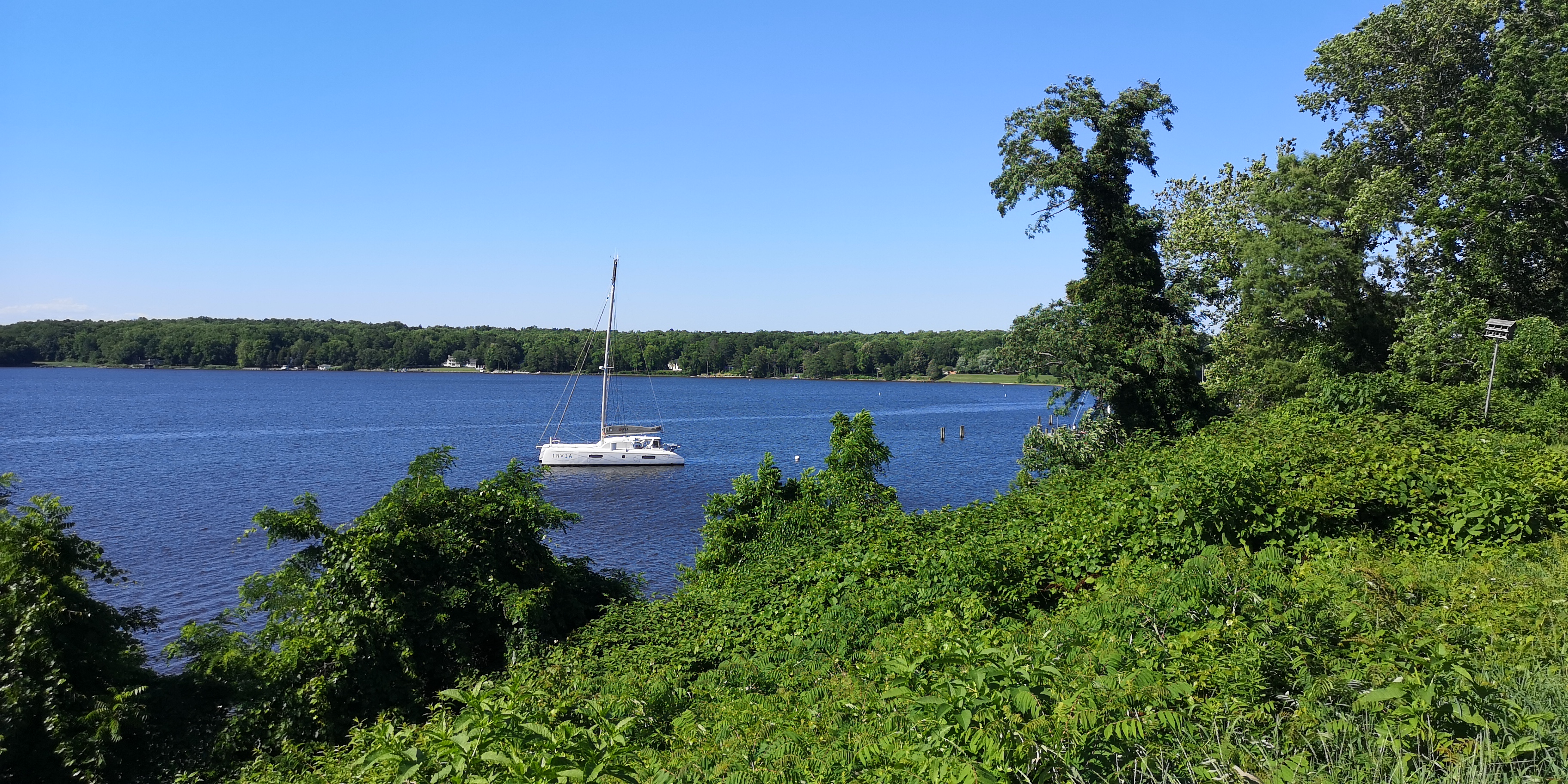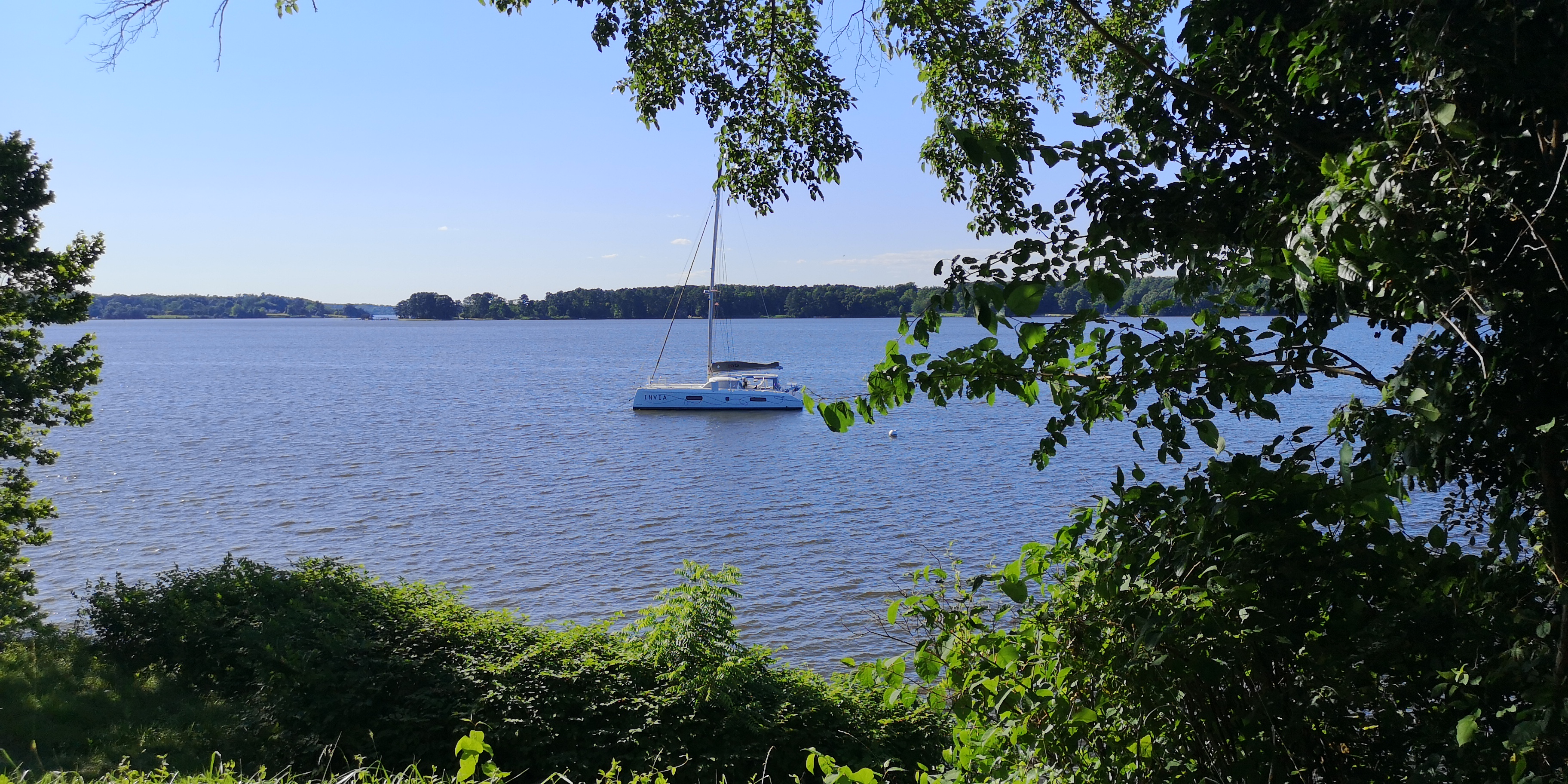 Aber ich möchte zum Impftermin nicht vor Anker, sondern in einer Marina liegen. Falls einer von uns stärkere Nebenwirkungen verspürt sollte medizinische Hilfe unkompliziert an Bord kommen können. Auch wenn sich nur einer von uns krank fühlen sollte, ist es mit direktem Landanschluss und einer Marina-Infrastruktur angenehmer: Mit Landstrom können wir die Klimaanlage laufen lassen, jederzeit von Bord, haben genug Wasser usw. Die Chesapeake Bay hat viele Marinas und zig Tausende, eher wohl Hunderttausende, von Liegeplätzen. Nur sind die meisten für kleinere Schiffe, meist Motorboote, ausgelegt. Ein 51 Fuss langer Katamaran wie INVIA sprengt vielfach die Grenzen. Deswegen müssen wir rechtzeitig im Voraus reservieren – und sind daher weniger flexibel. Für unseren Impftermin habe ich uns 4 Nächte in der Safe Harbor Marina Zahnisers gebucht. Den Termin wollen wir einhalten. Solomons Islands liegt nur etwa 8 Meilen von Leonhardtown entfernt – wenn man den Landweg nimmt. Übers Wasser hingegen ist es erheblich länger.
