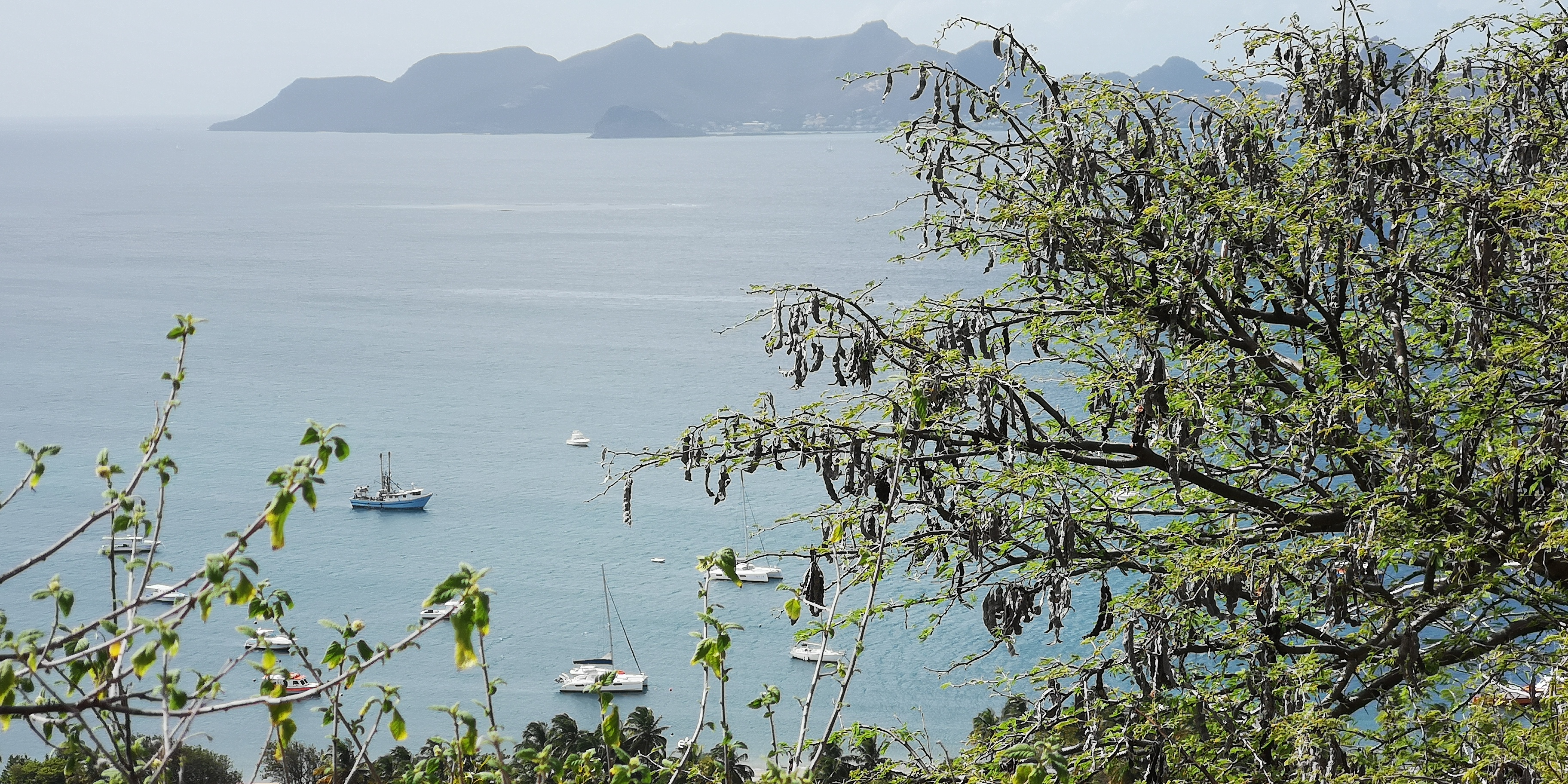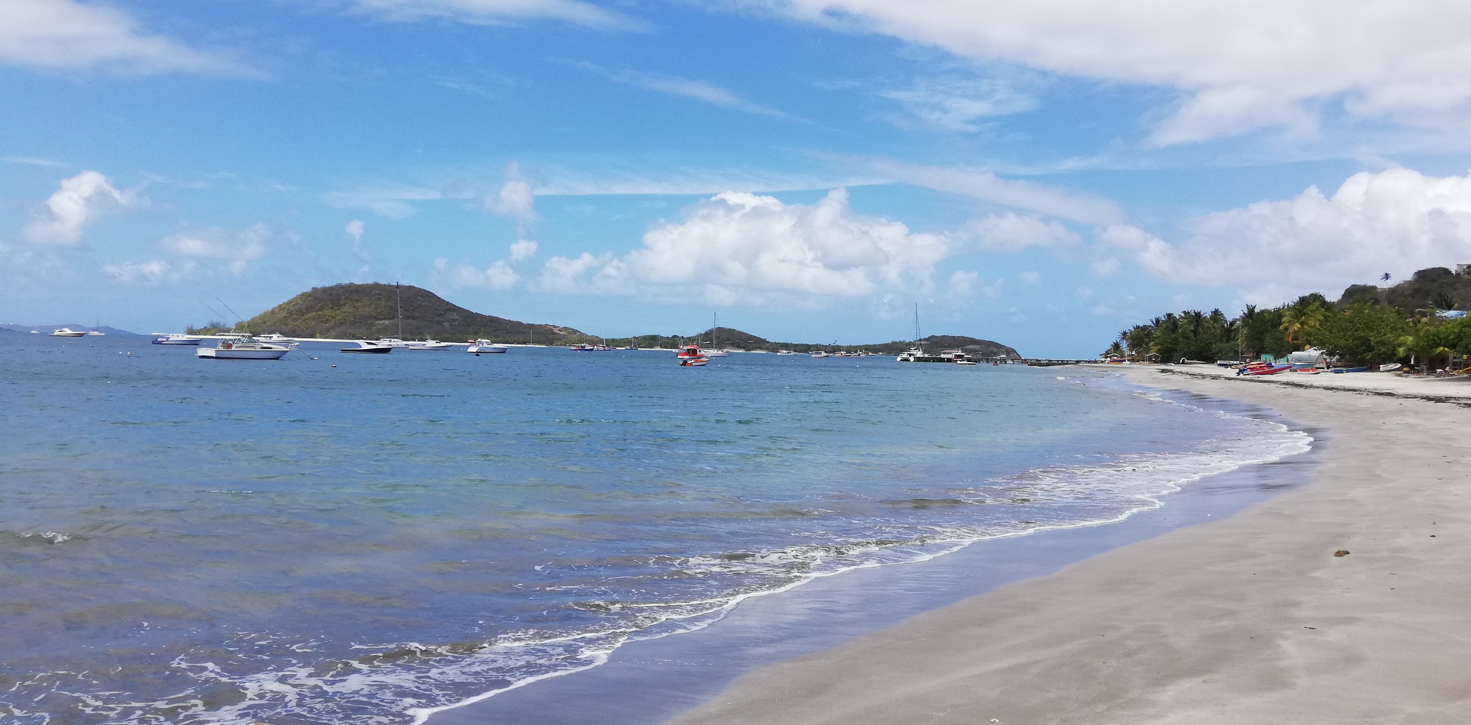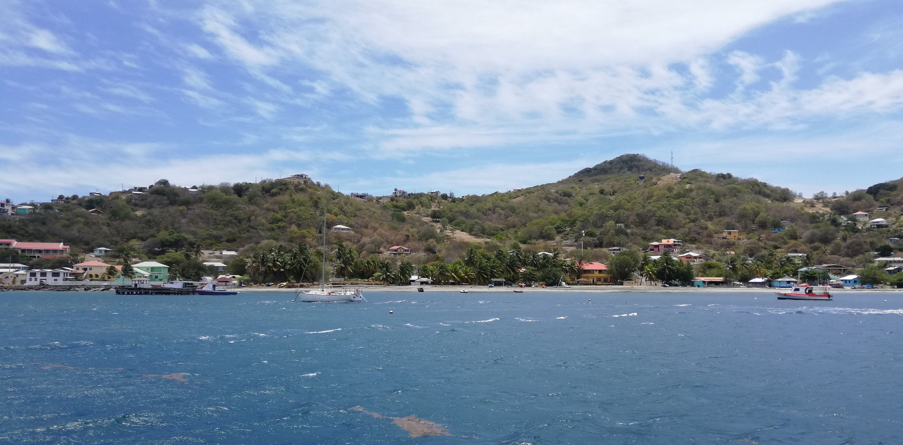 Tatsächlich interessiert sich nicht nur niemand für unsere Papiere, sondern überhaupt lässt man uns völlig unbehelligt. Sehr ungewohnt nach all den Boatboys auf den Inseln zuvor, die geschäftstüchtig schon deutlich vor den jeweiligen Ankerbuchten warteten. Vor Anker bzw an Bojen liegen bei Petit Martinique außer zwei abgewrackt aussehenden Monohulls nur zahlreiche Fischerboote. Segler sehen wir vor Petit St Vincent, sie ankern vor der Hotelanlage. Hm, wir zweifeln. Sollen wir hier vor Anker gehen, sind wir hier sicher? Zumal der Wind ordentlich durch den Kanal zwischen Petit Martinique und Petit St Vincent bläst.