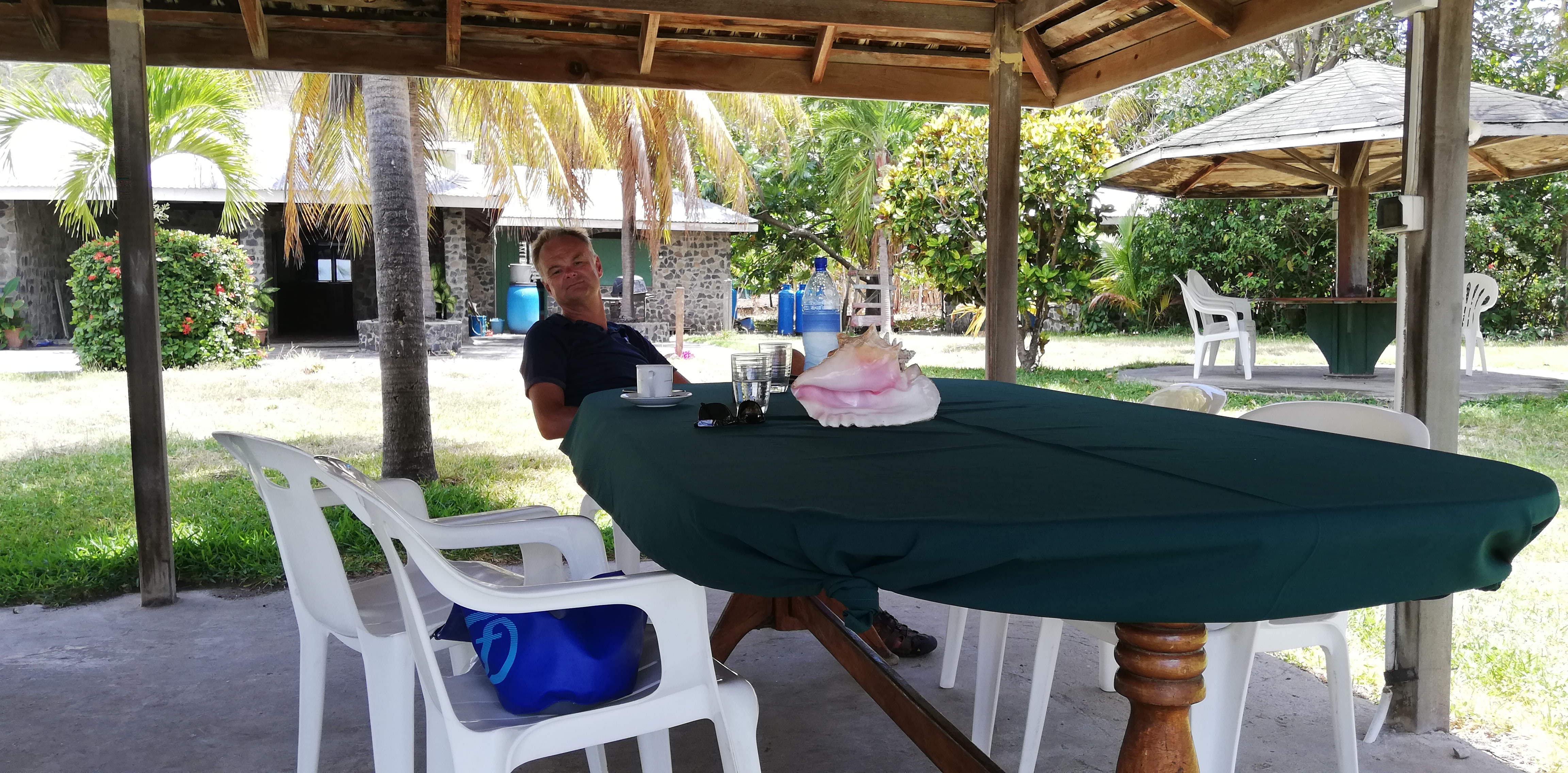 Am Abend essen wir ganz vorzüglich im schönen Garten des Palm Beach Restaurants. Inzwischen hatte noch ein zweiter Katamaran vor Petit Martinique geankert, dessen Besatzung auch im Restaurant isst. Ansonsten sehen wir nur sehr wenige Touristen auf der Insel.